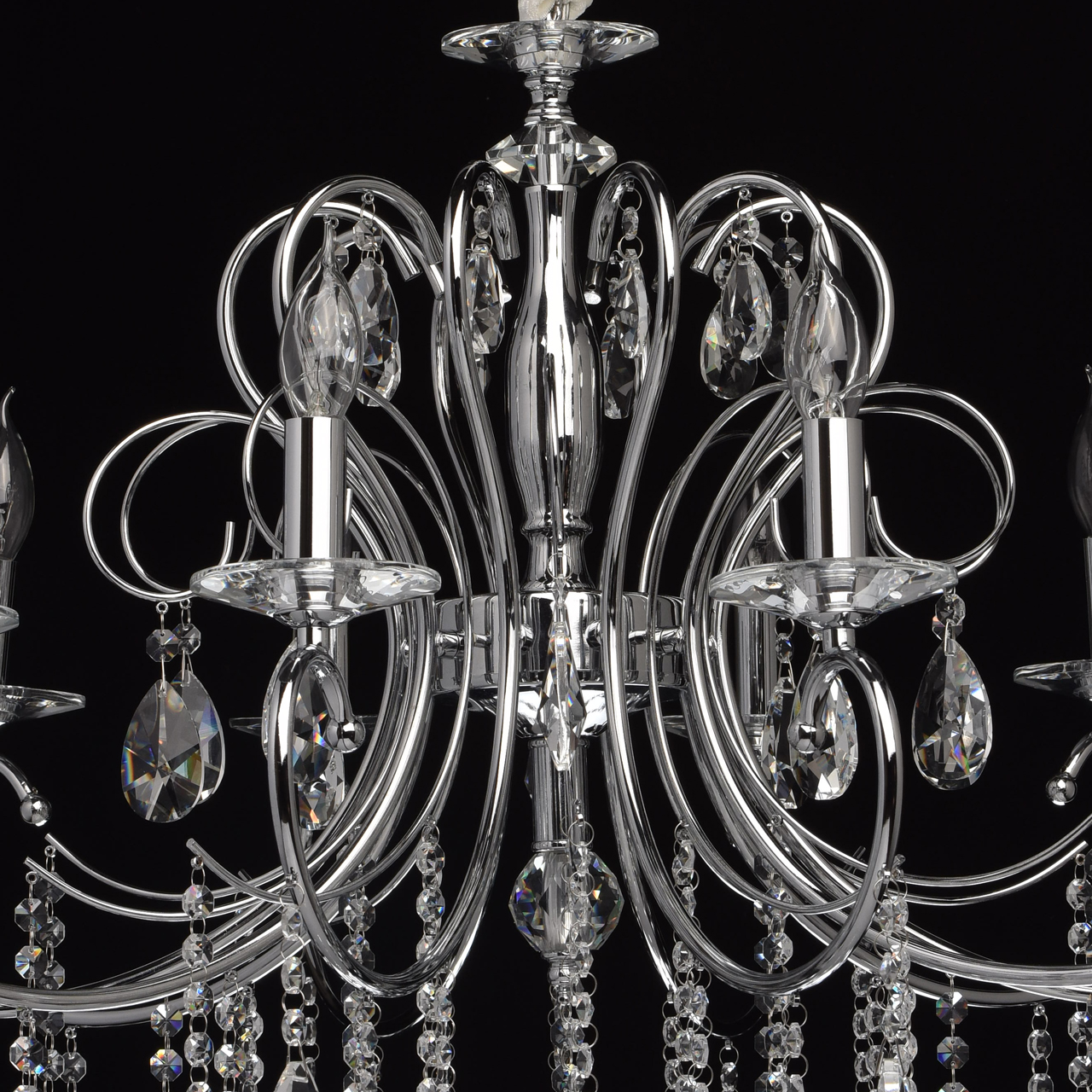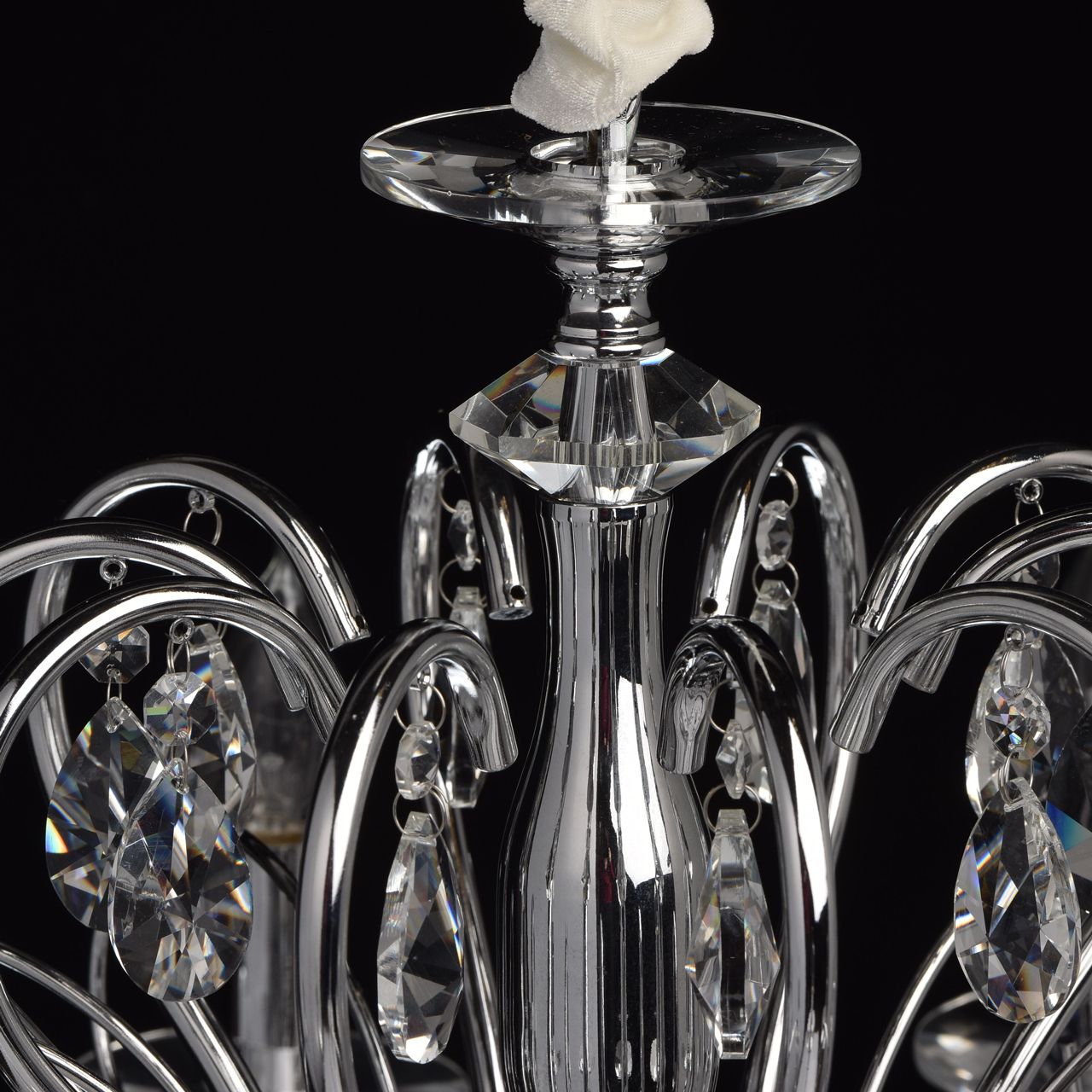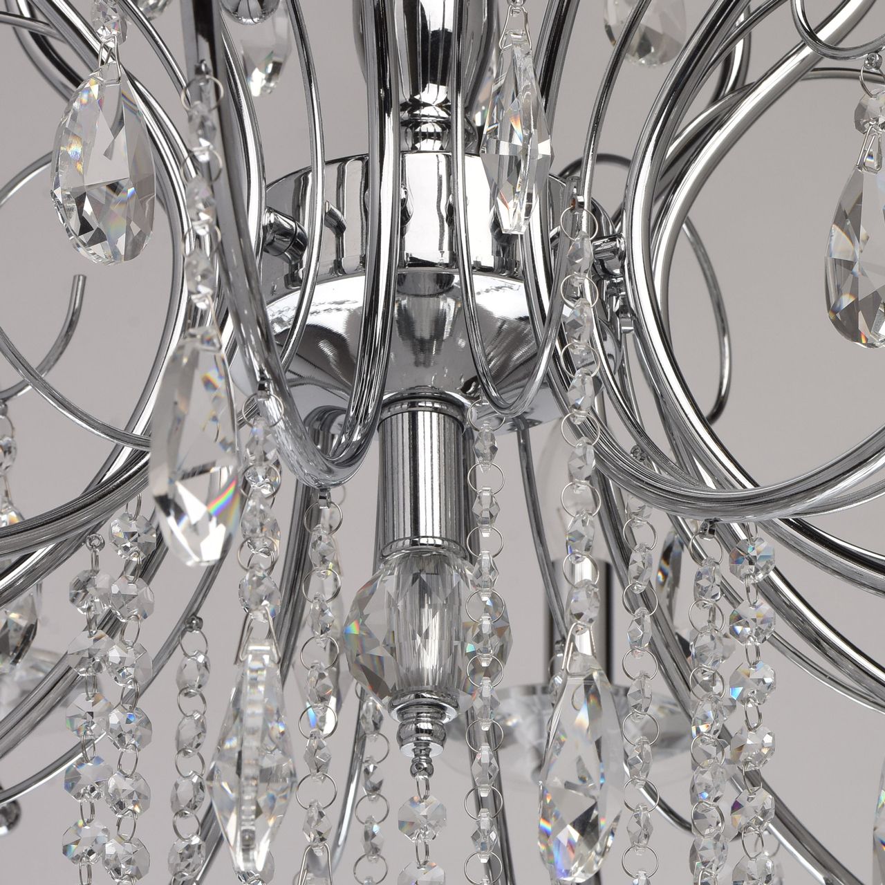 Основание: металл, гальванизировано в цвет хрома. Рожки и декоративные элементы выполнены по технологии проката на роликовом станке. Центральная ось декорирована массивами хрусталя со сложной огранкой. Декоративные розетки выполнены из массива хрусталя. Светильник декорирован подвесками из хрусталя высокого качества формы октагон и миндаль.Тип помещения