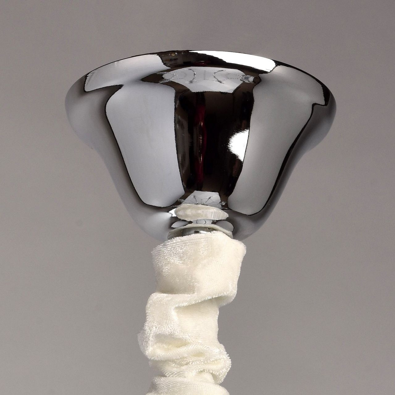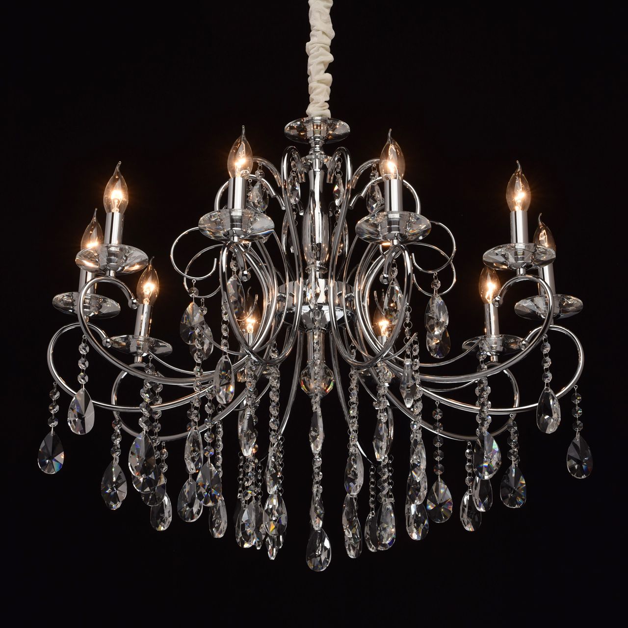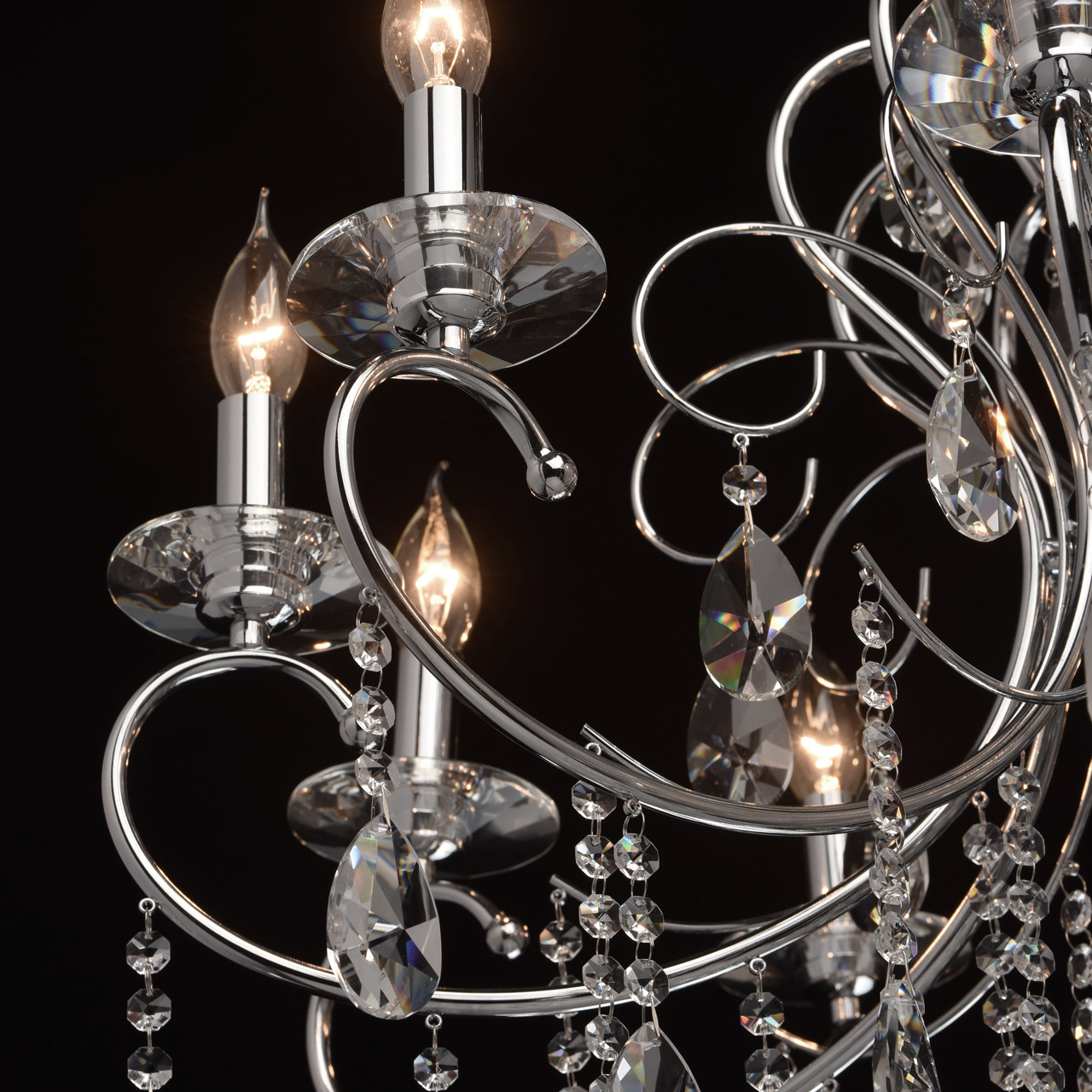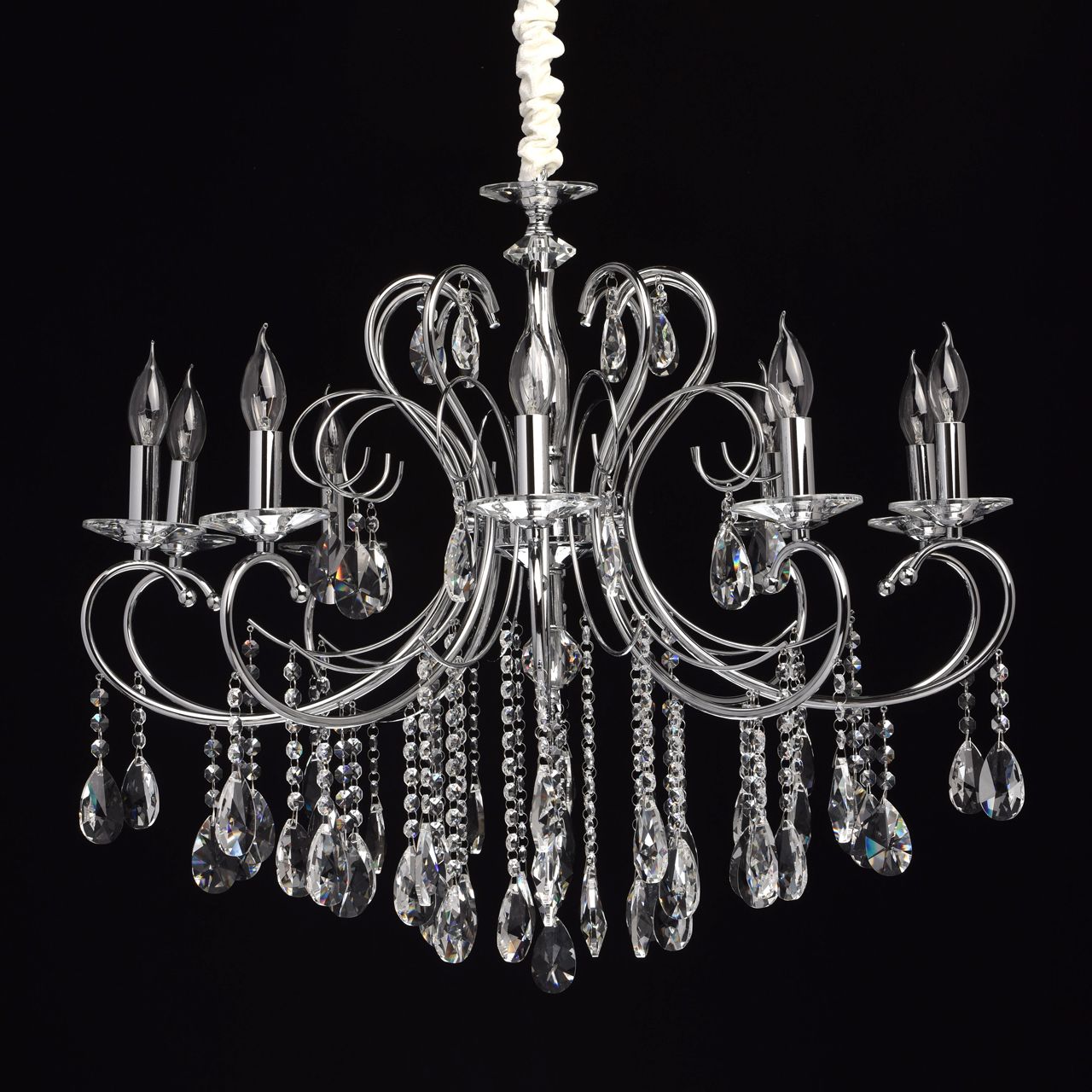Основание: металл, гальванизировано в цвет хрома. Рожки и декоративные элементы выполнены по технологии проката на роликовом станке. Центральная ось декорирована массивами хрусталя со сложной огранкой. Декоративные розетки выполнены из массива хрусталя. Светильник декорирован подвесками из хрусталя высокого качества формы октагон и миндаль.Тип помещения