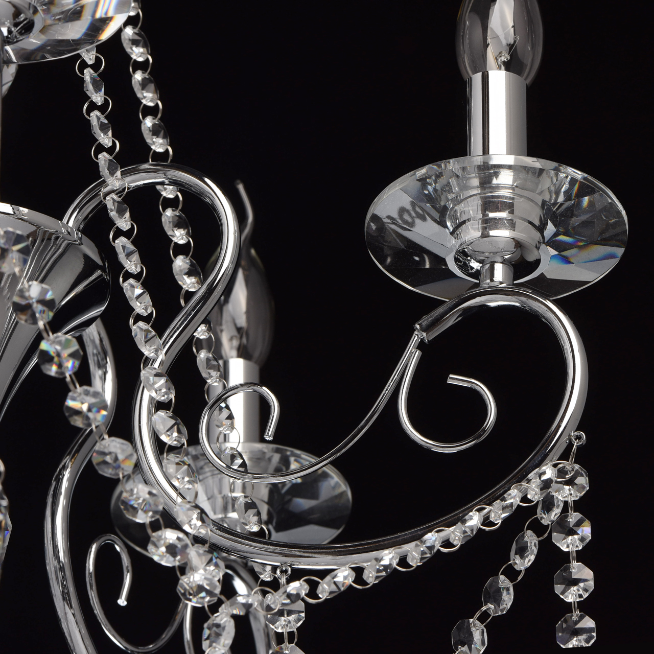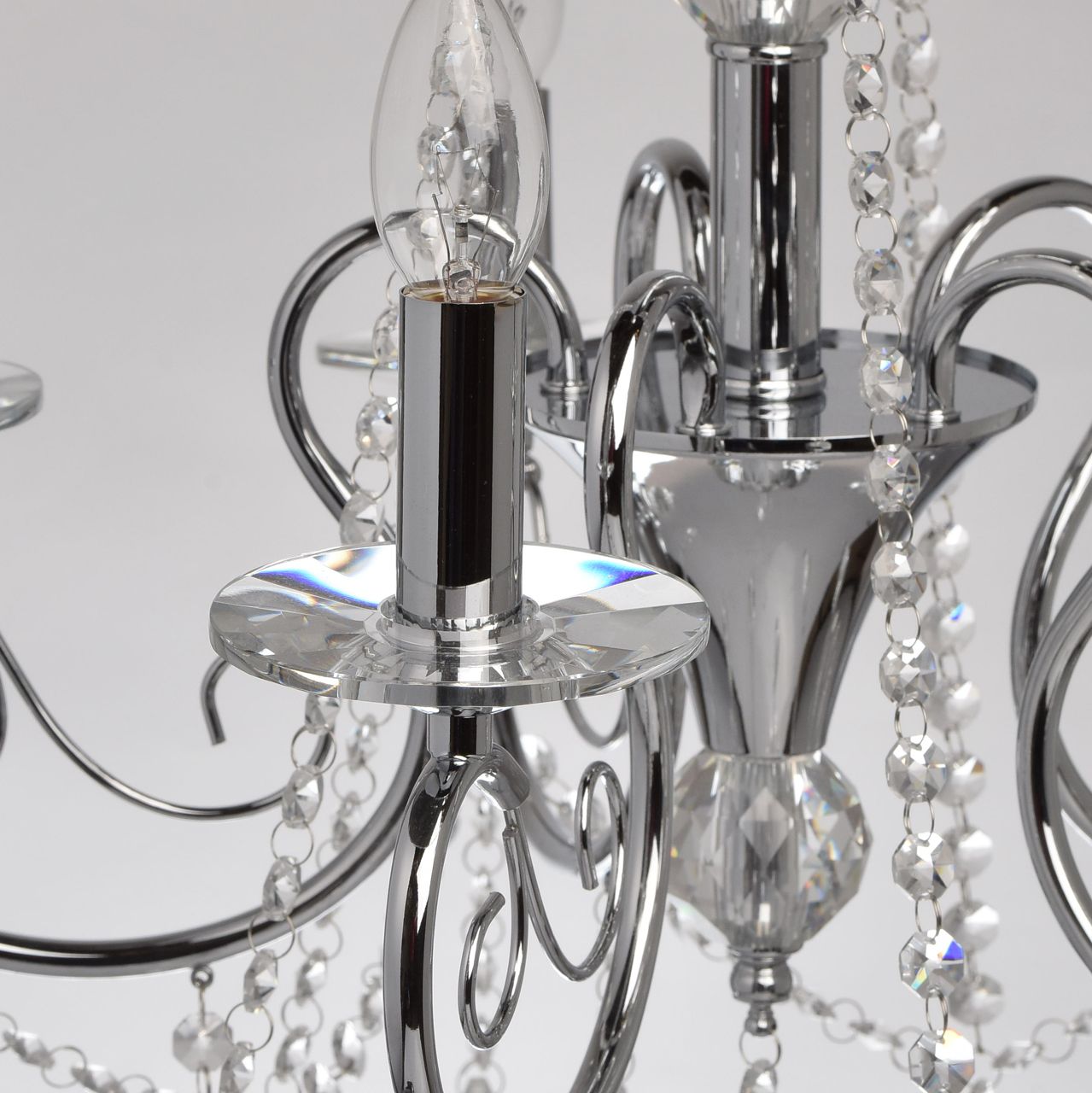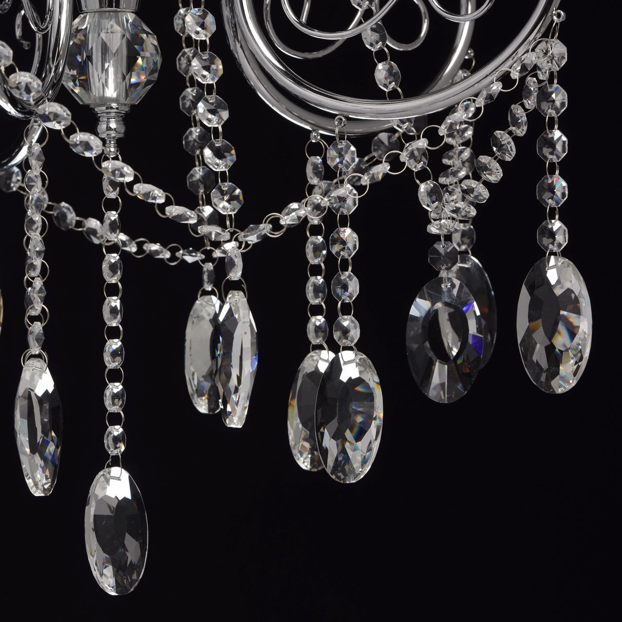 Основание: металл, гальванизировано в цвет хрома. Рожки выполнены по технологии проката на роликовом станке. Декоративные элементы на центральной оси выполнены по технологии токарной обработки. Центральная ось декорирована массивами хрусталя. Декоративные розетки выполнены из массива хрусталя. Светильник декорирован подвесками из хрусталя высокого качества формы октагон и овал.Тип помещения