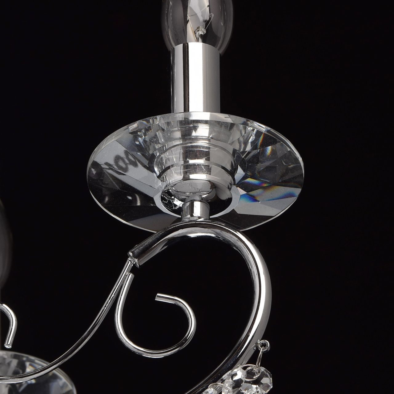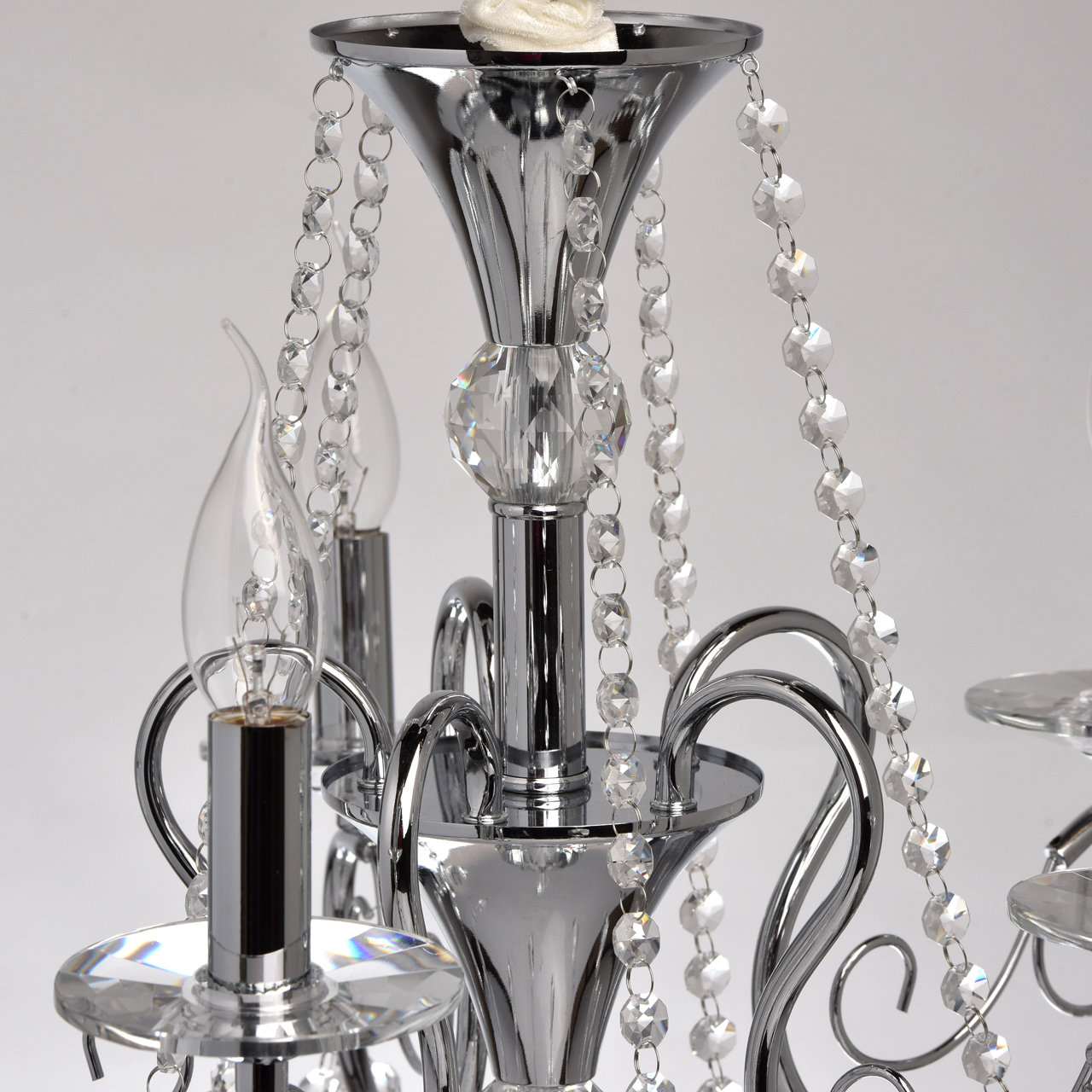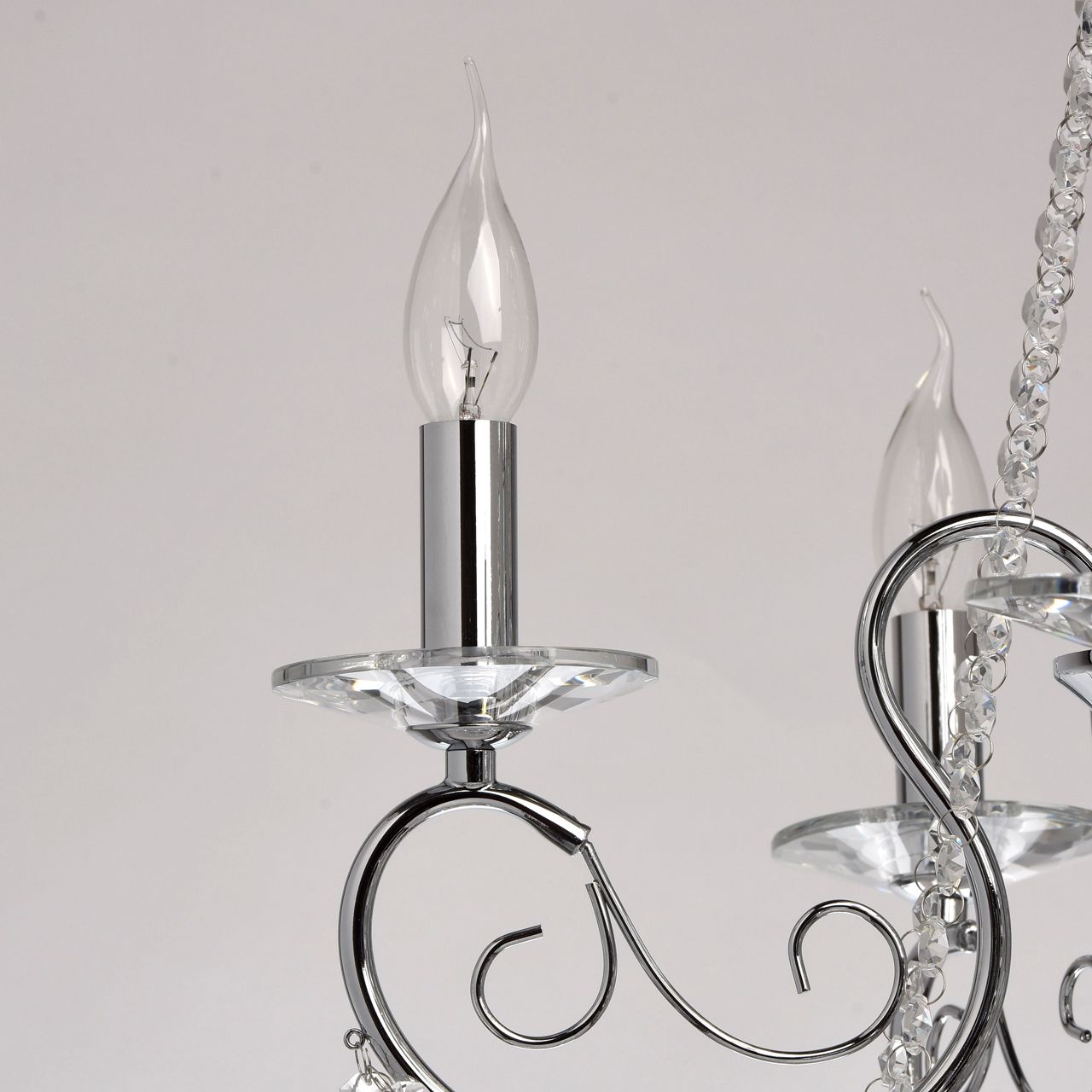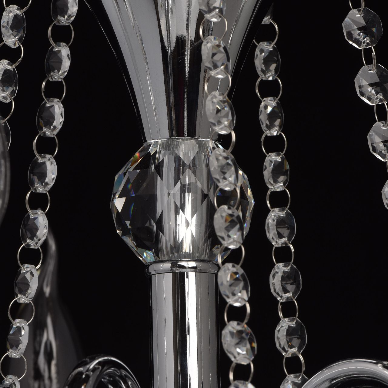 Основание: металл, гальванизировано в цвет хрома. Рожки выполнены по технологии проката на роликовом станке. Декоративные элементы на центральной оси выполнены по технологии токарной обработки. Центральная ось декорирована массивами хрусталя. Декоративные розетки выполнены из массива хрусталя. Светильник декорирован подвесками из хрусталя высокого качества формы октагон и овал.Тип помещения