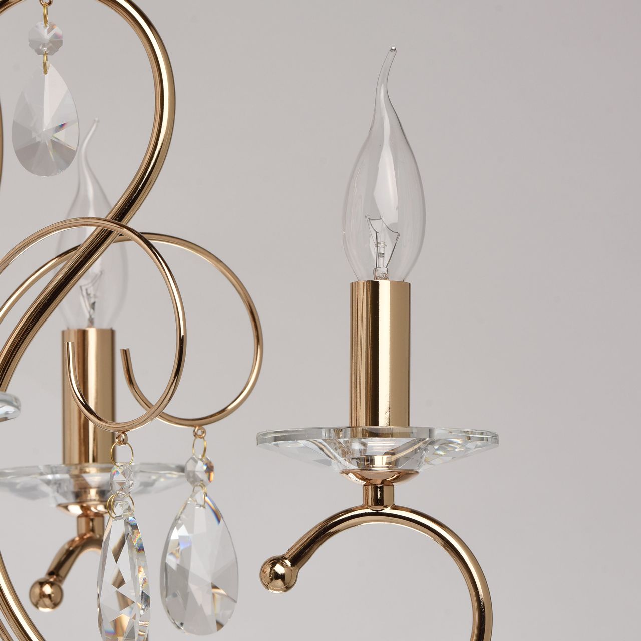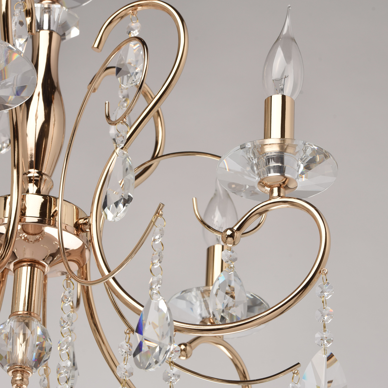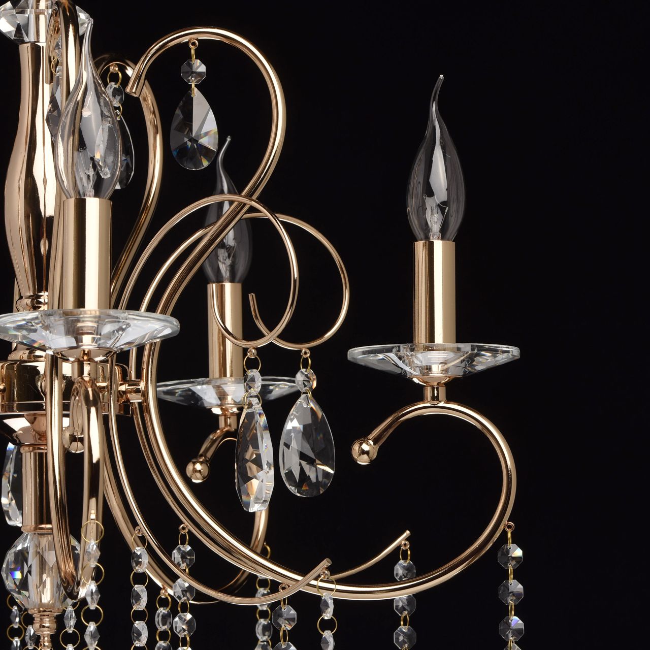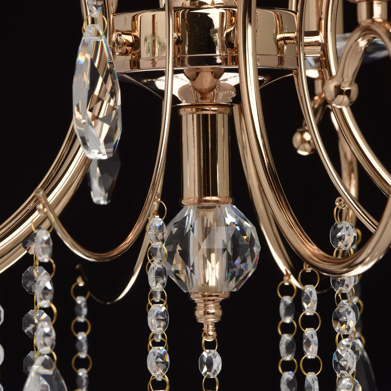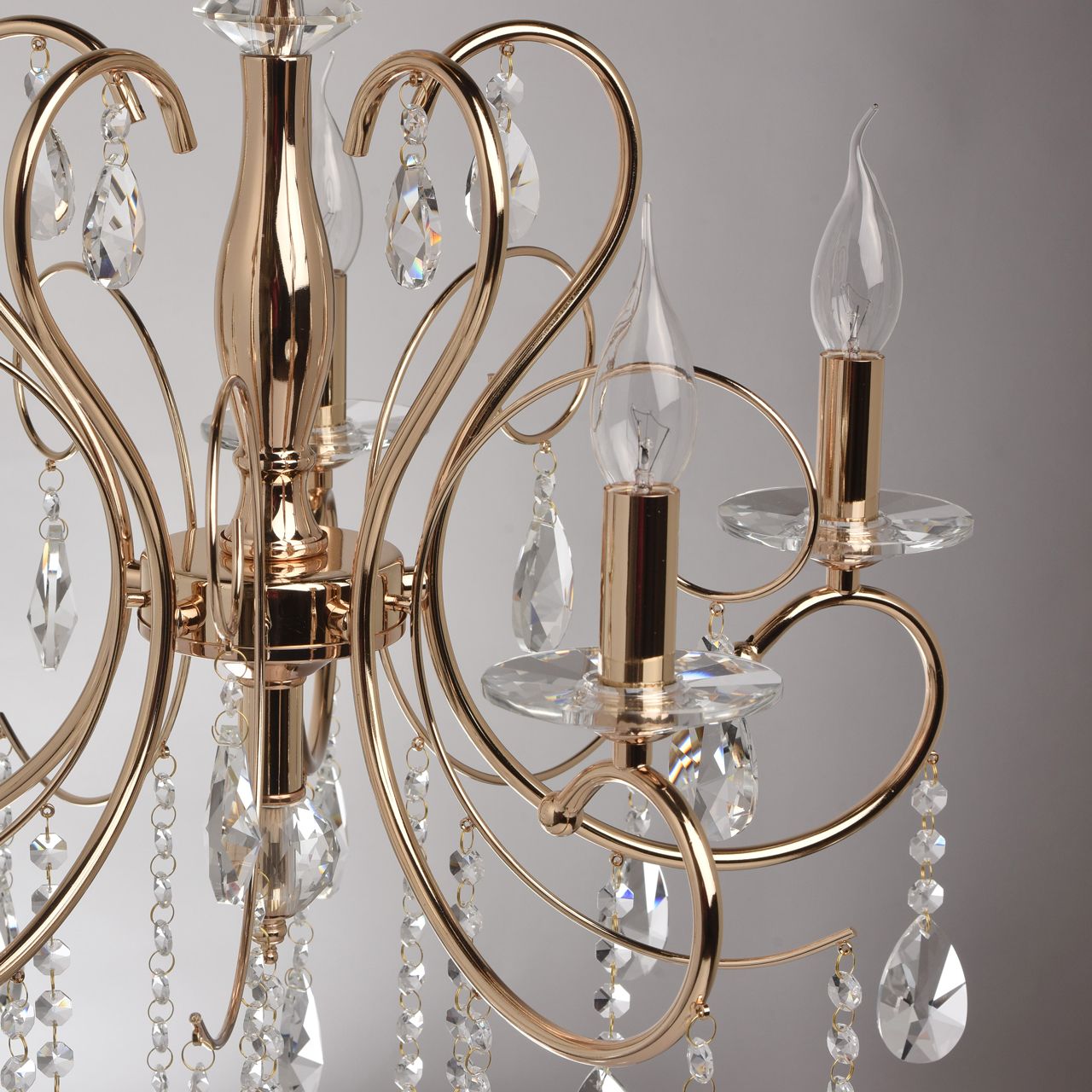 Основание: металл, гальванизировано в цвет французского золота. Рожки и декоративные элементы выполнены по технологии проката на роликовом станке. Центральная ось декорирована массивами хрусталя со сложной огранкой. Декоративные розетки выполнены из массива хрусталя. Светильник декорирован подвесками из хрусталя высокого качества формы октагон и миндаль.Тип помещения