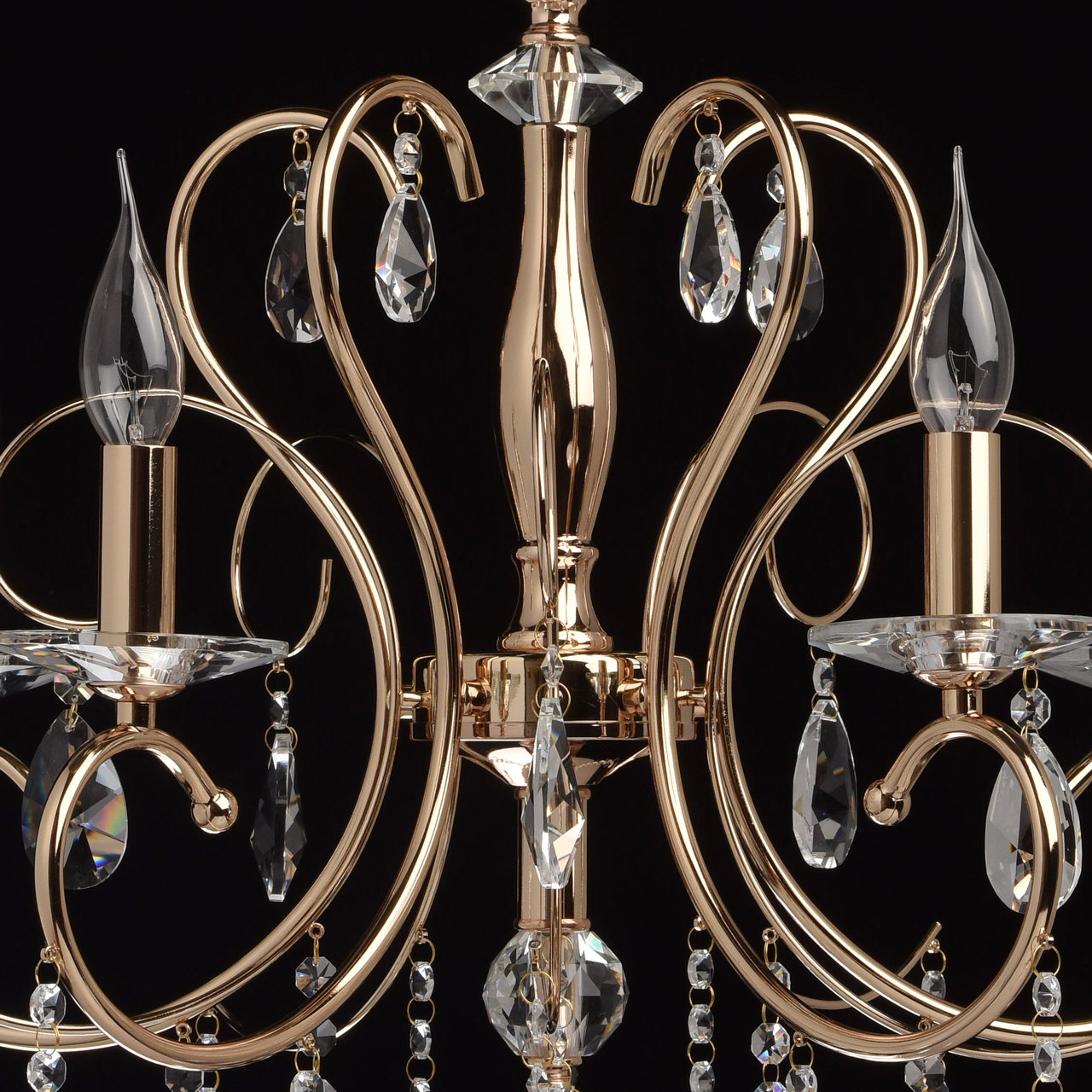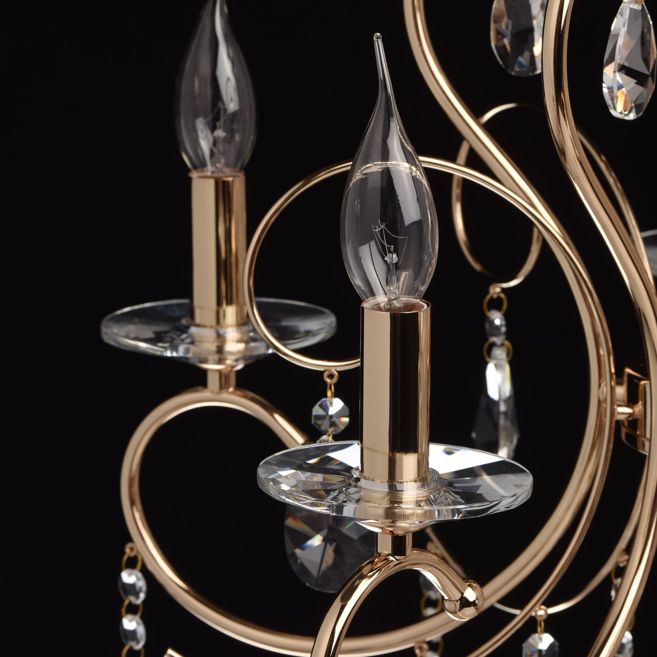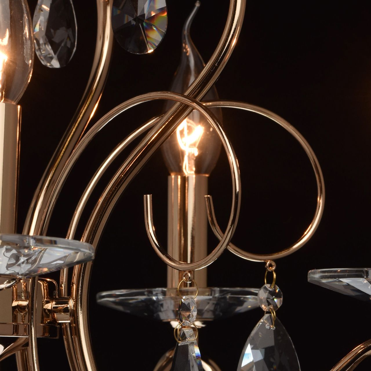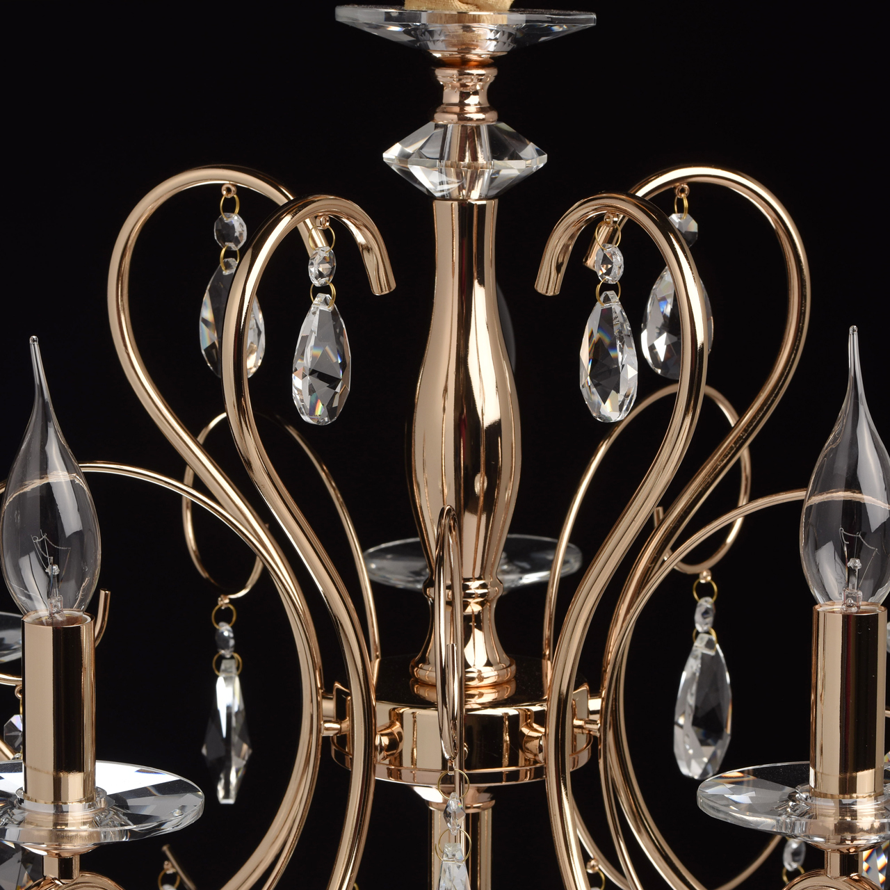 Основание: металл, гальванизировано в цвет французского золота. Рожки и декоративные элементы выполнены по технологии проката на роликовом станке. Центральная ось декорирована массивами хрусталя со сложной огранкой. Декоративные розетки выполнены из массива хрусталя. Светильник декорирован подвесками из хрусталя высокого качества формы октагон и миндаль.Тип помещения