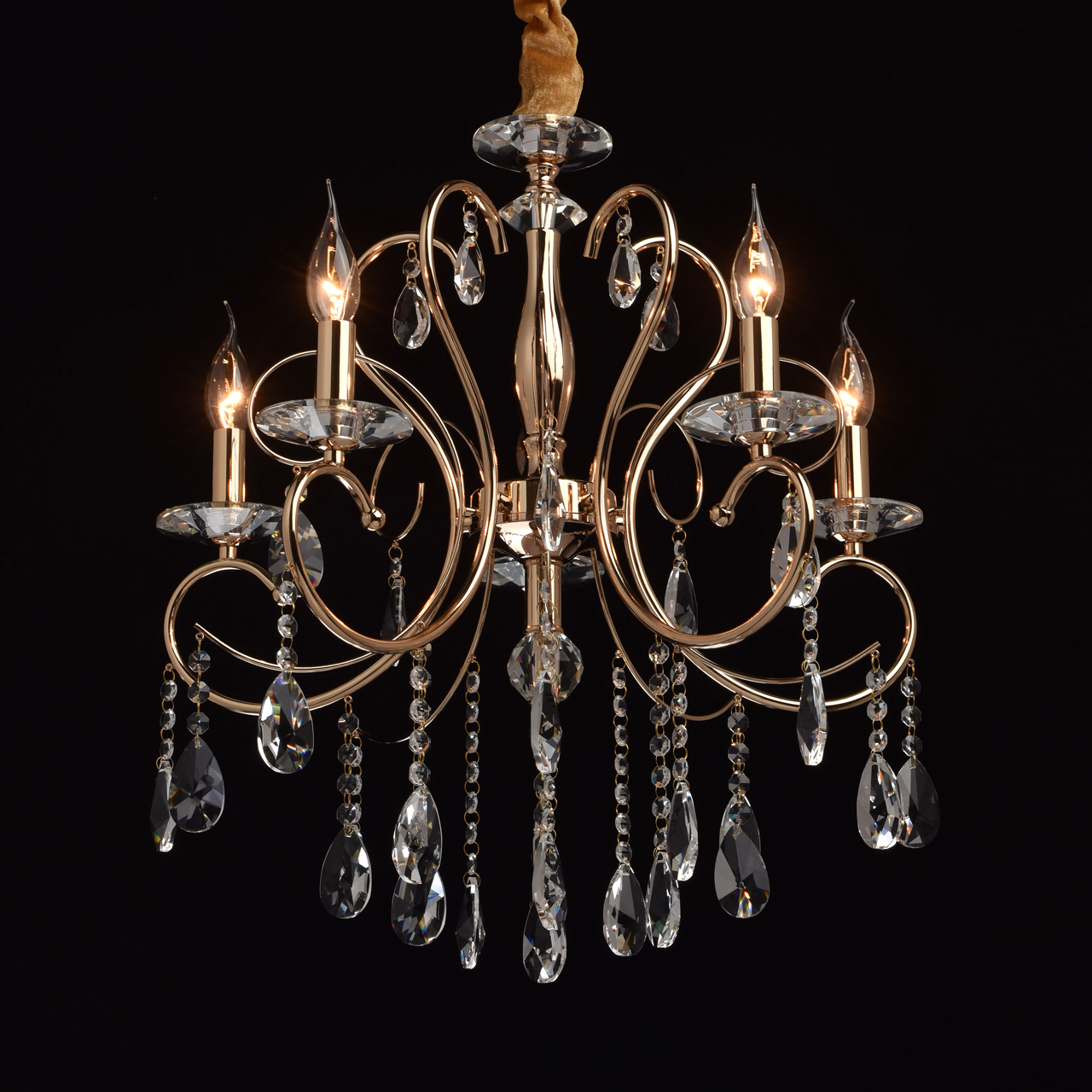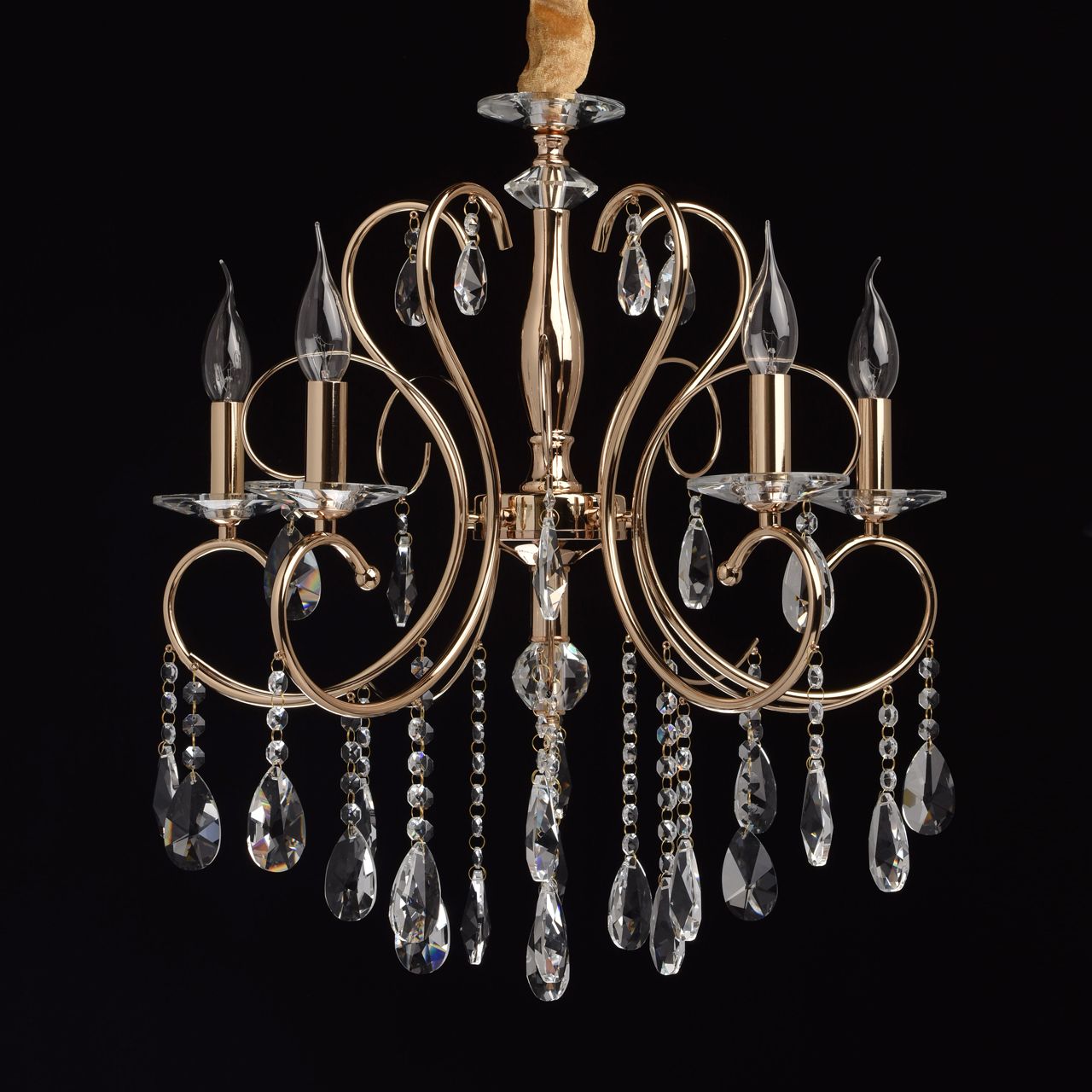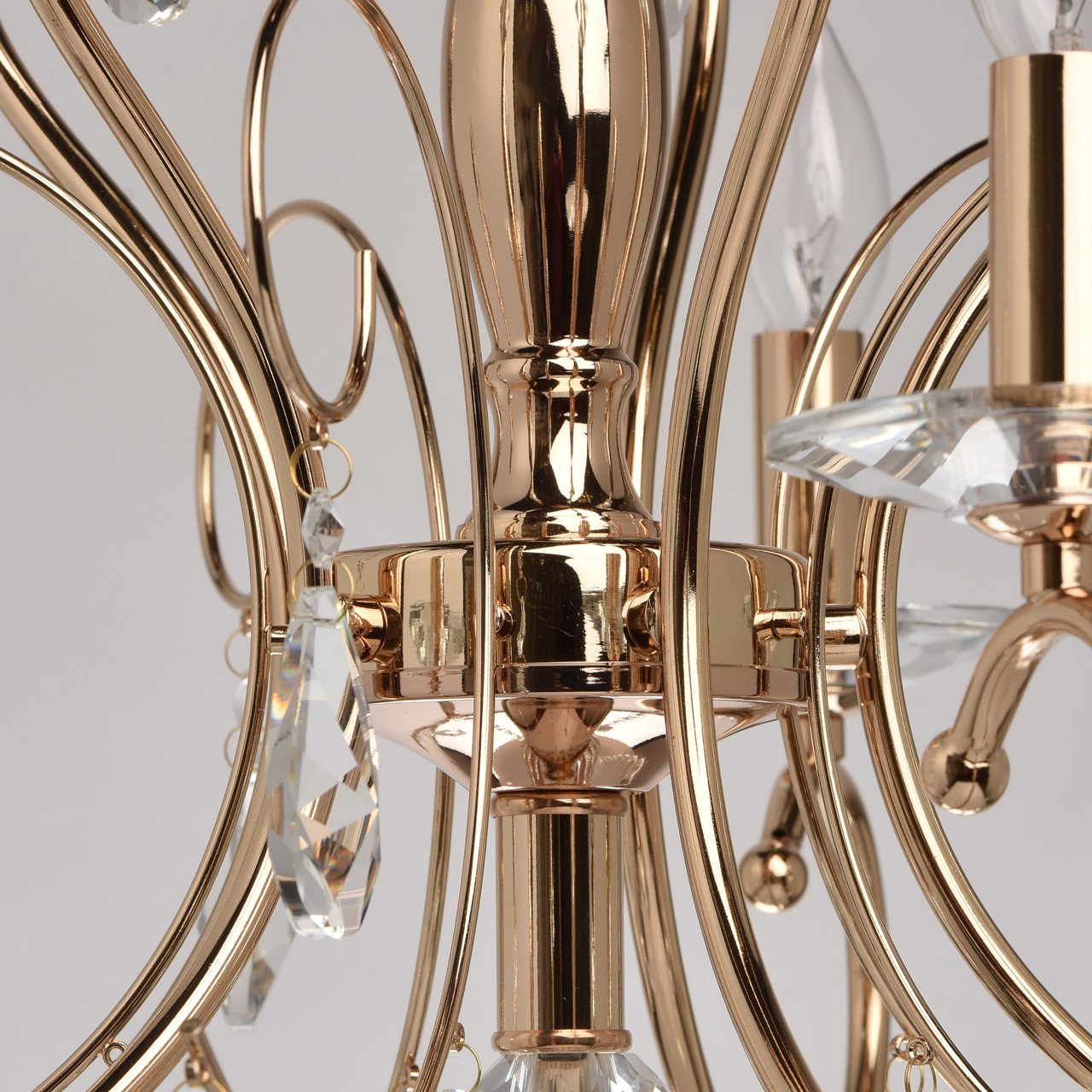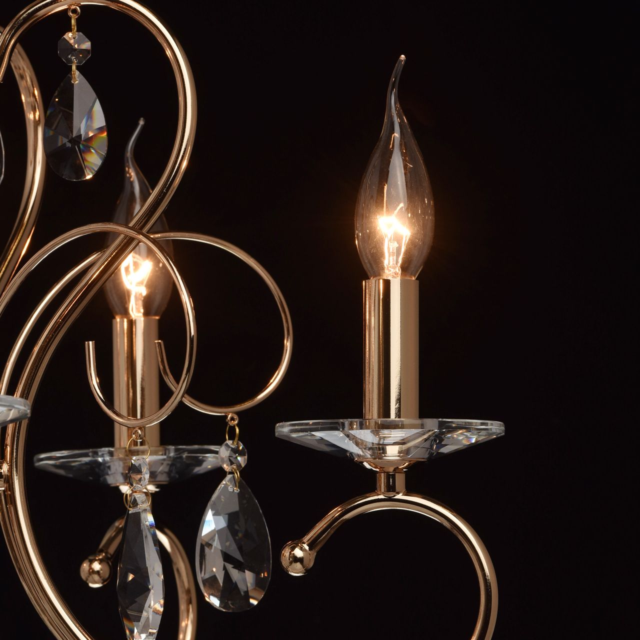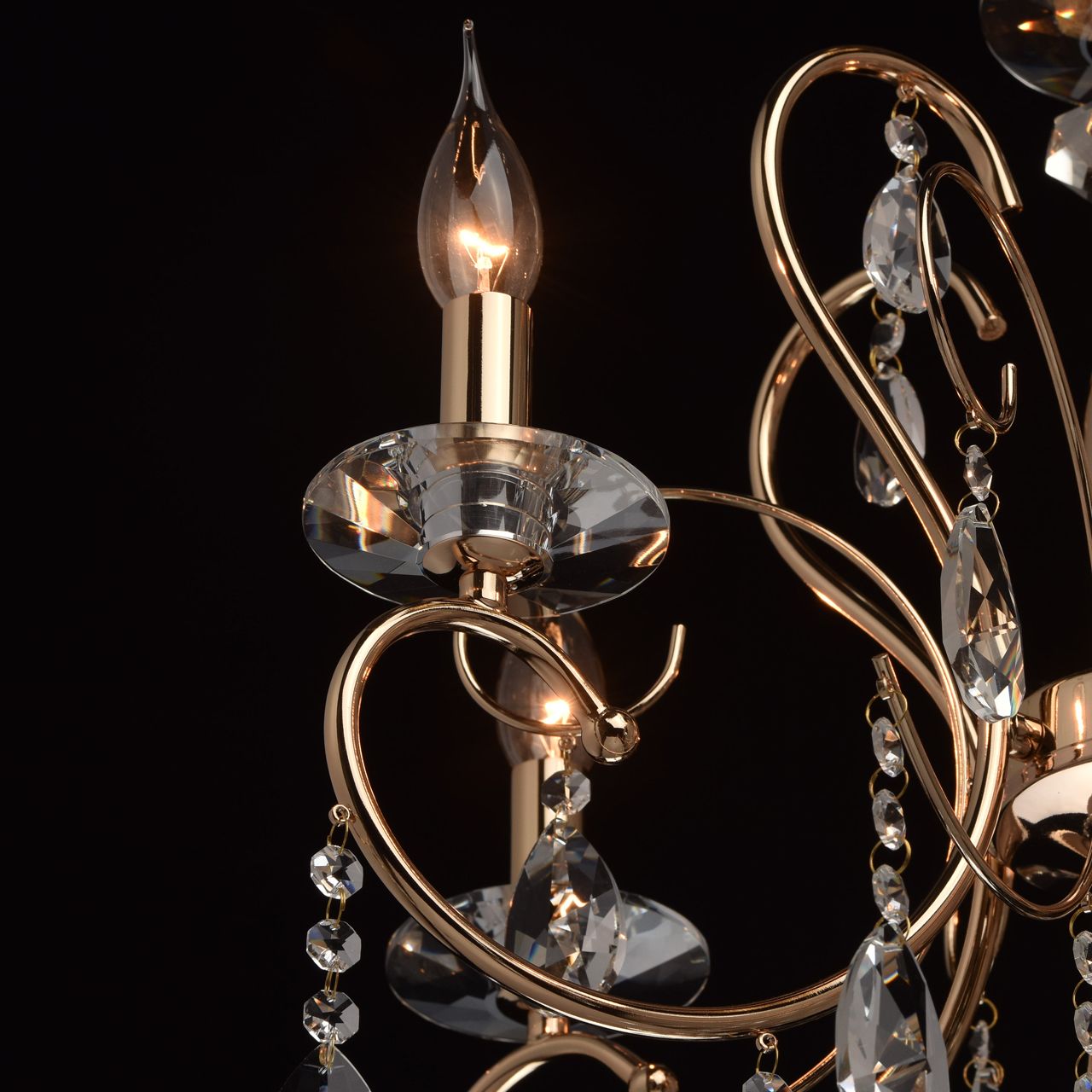 Основание: металл, гальванизировано в цвет французского золота. Рожки и декоративные элементы выполнены по технологии проката на роликовом станке. Центральная ось декорирована массивами хрусталя со сложной огранкой. Декоративные розетки выполнены из массива хрусталя. Светильник декорирован подвесками из хрусталя высокого качества формы октагон и миндаль.Тип помещения