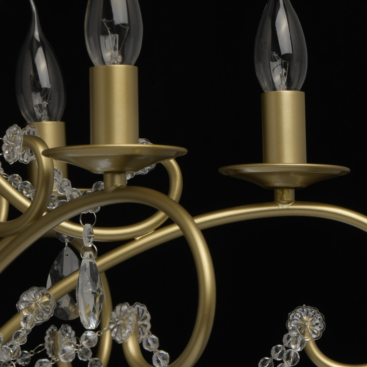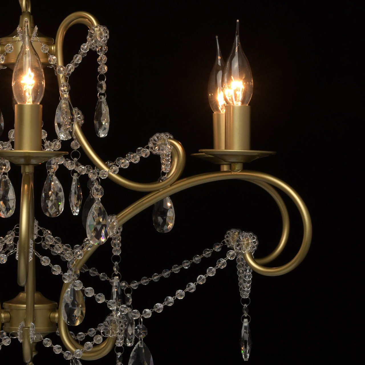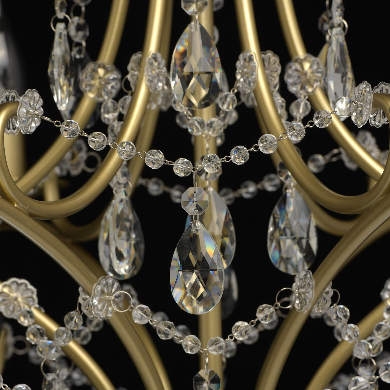 Основание выполнено из сплава металла и гальванизировано в цвет золота. Потолочная чаша, корпус - прессование. Декоративные элементы - прокат на роликовом станке. Декор - прозрачный хрусталь формы шара, октагона, миндаль и декоративные бусины.Тип помещения