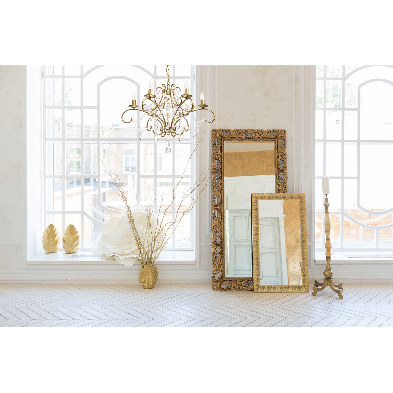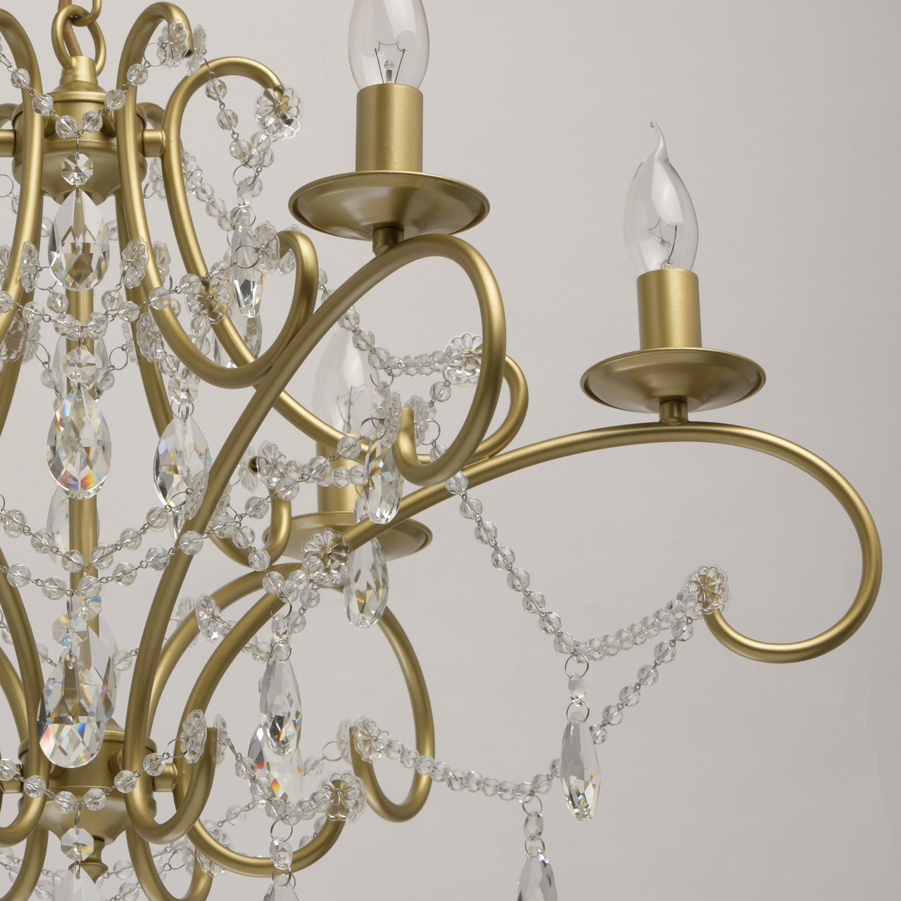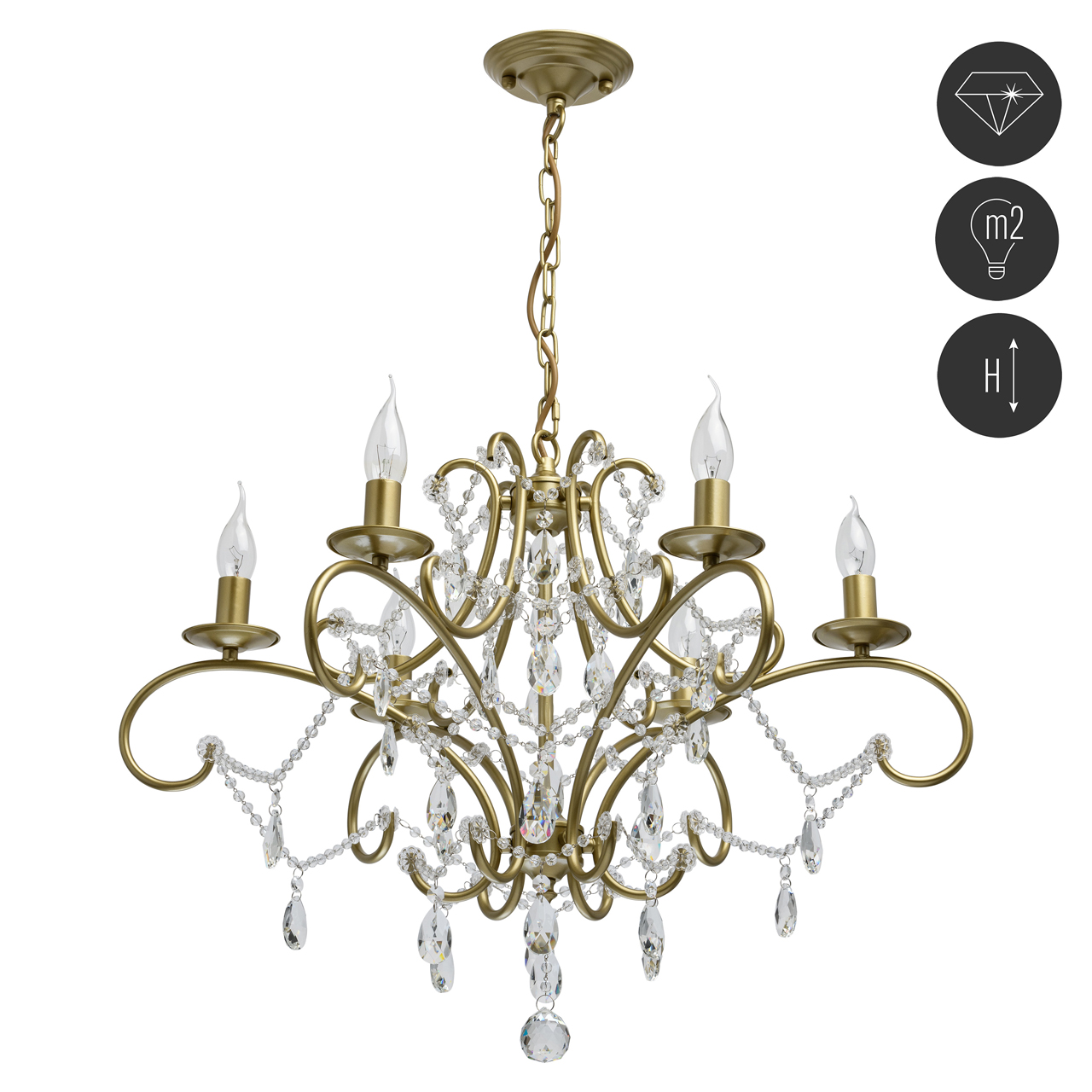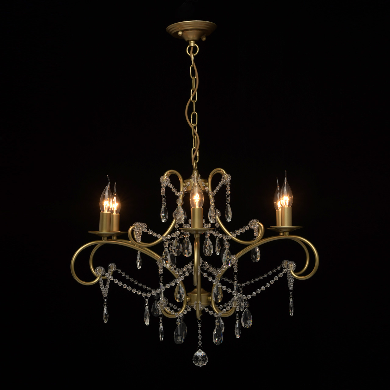Основание выполнено из сплава металла и гальванизировано в цвет золота. Потолочная чаша, корпус - прессование. Декоративные элементы - прокат на роликовом станке. Декор - прозрачный хрусталь формы шара, октагона, миндаль и декоративные бусины.Тип помещения