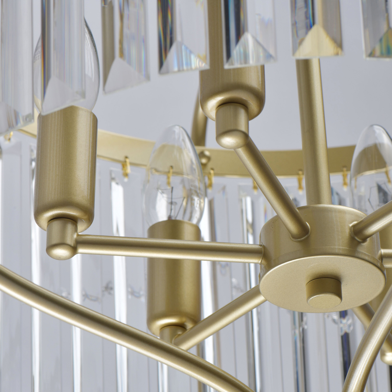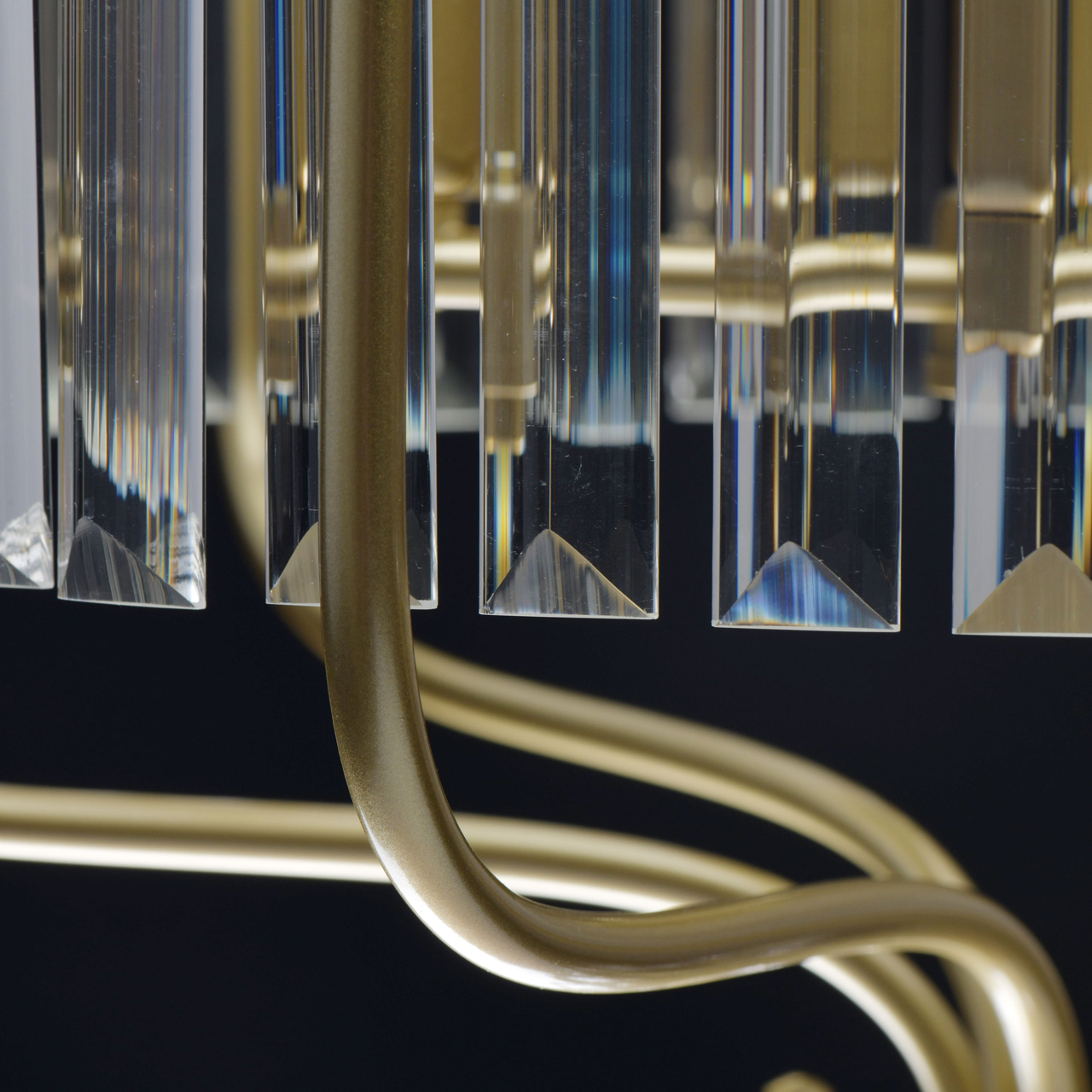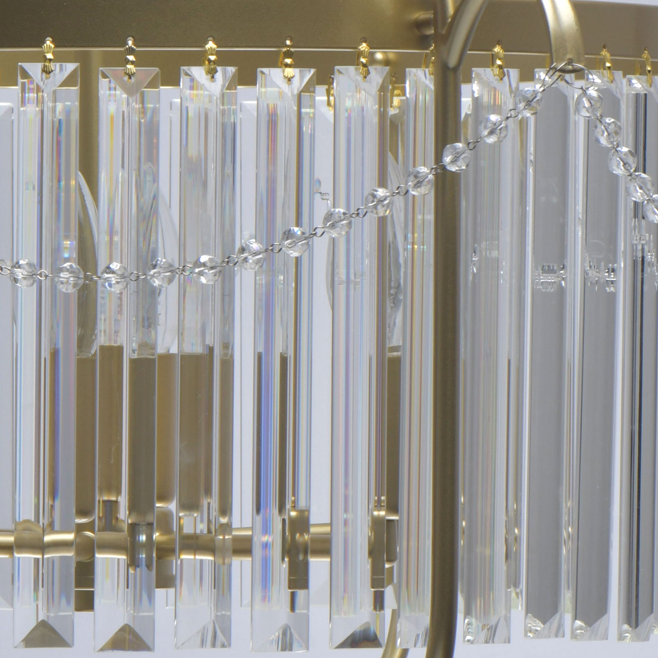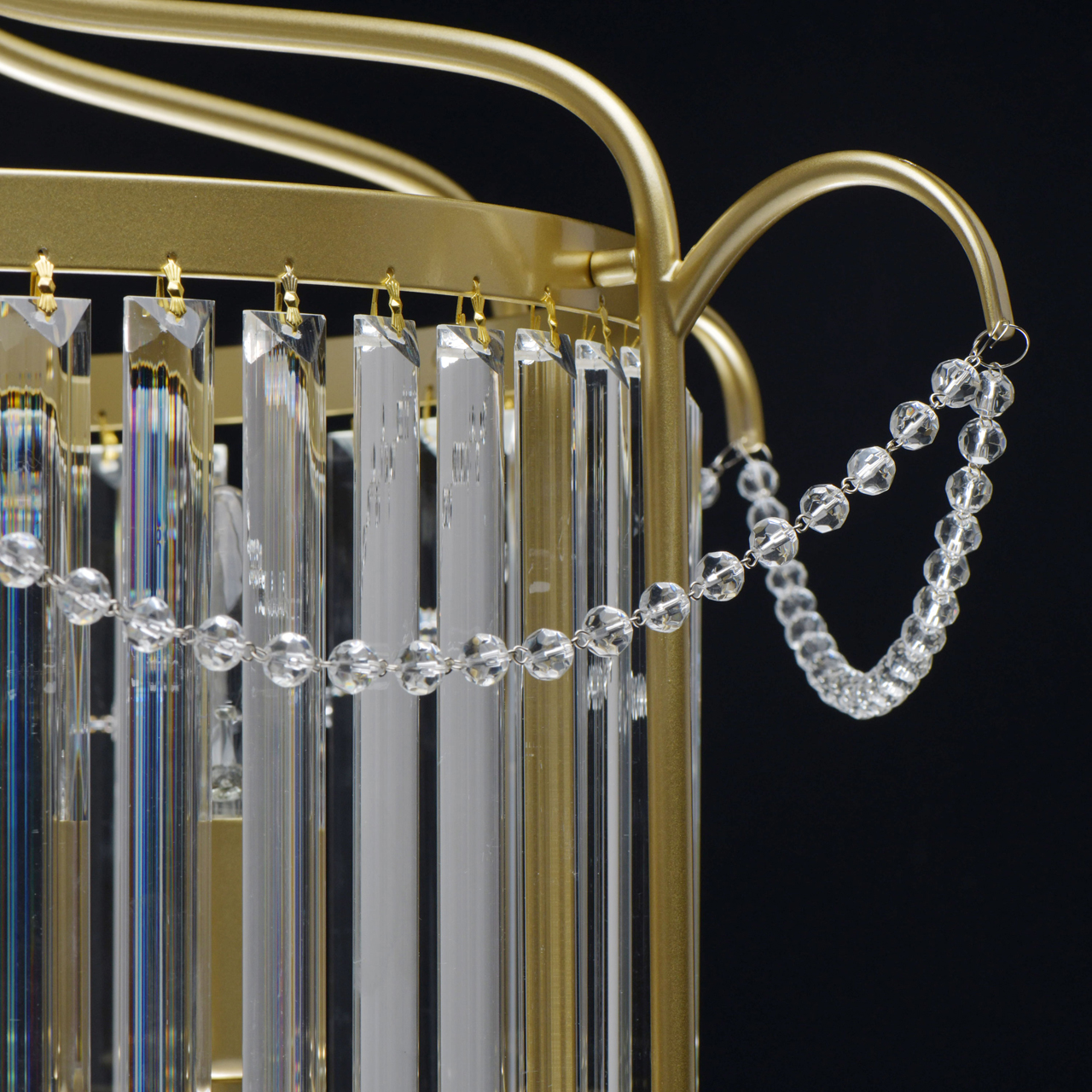 Основание светильника выполнено из металла и окрашено в цвет перламутрового золота. Светильник декорирован прозрачным хрусталем прямоугольной формы.Тип помещения