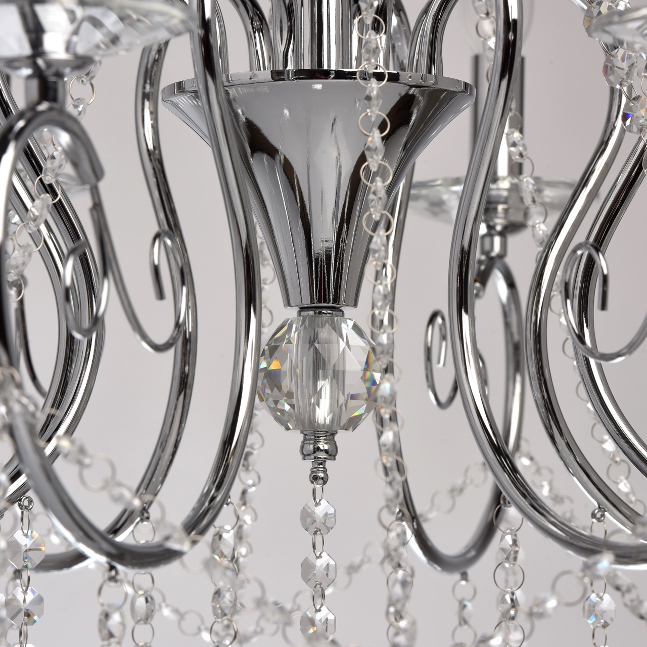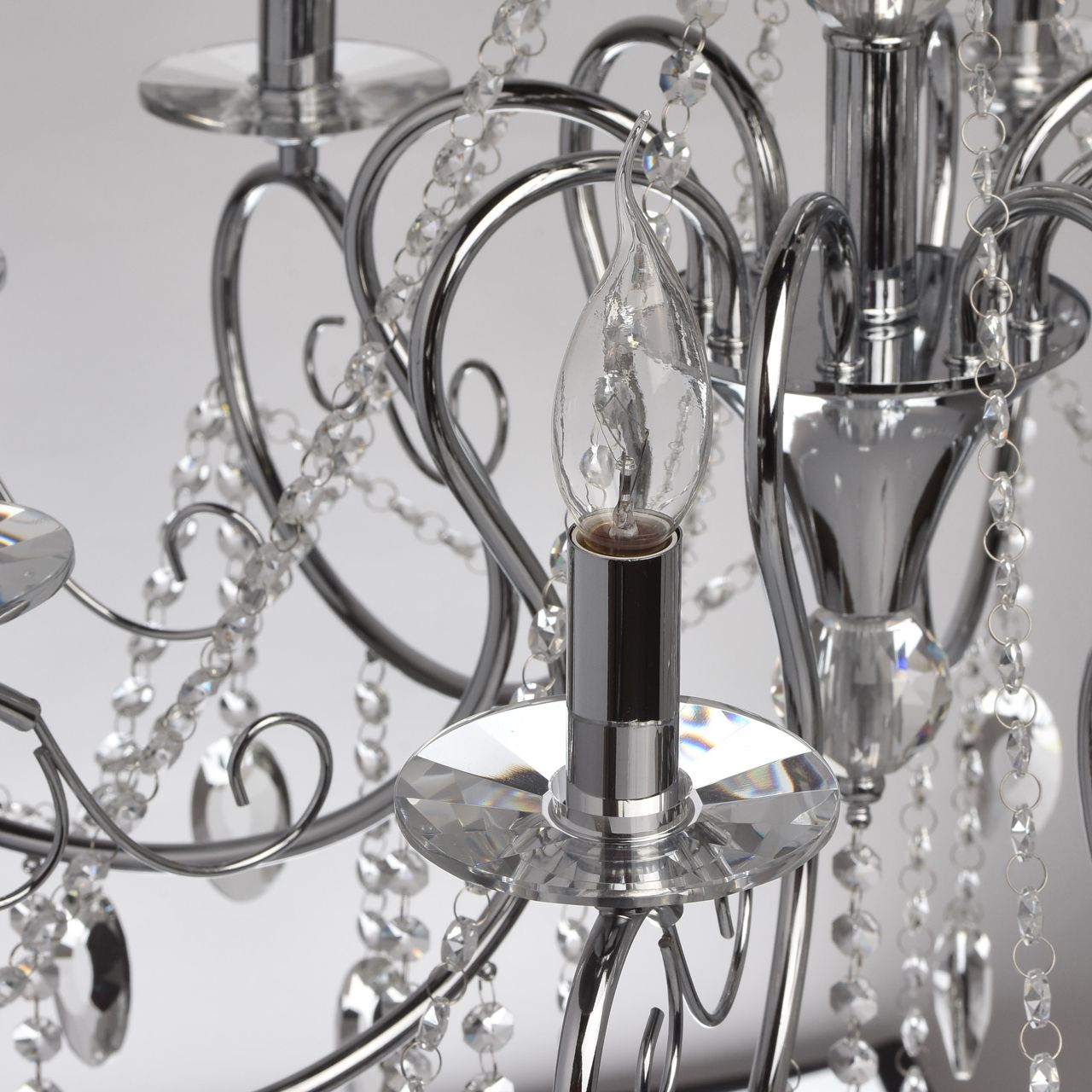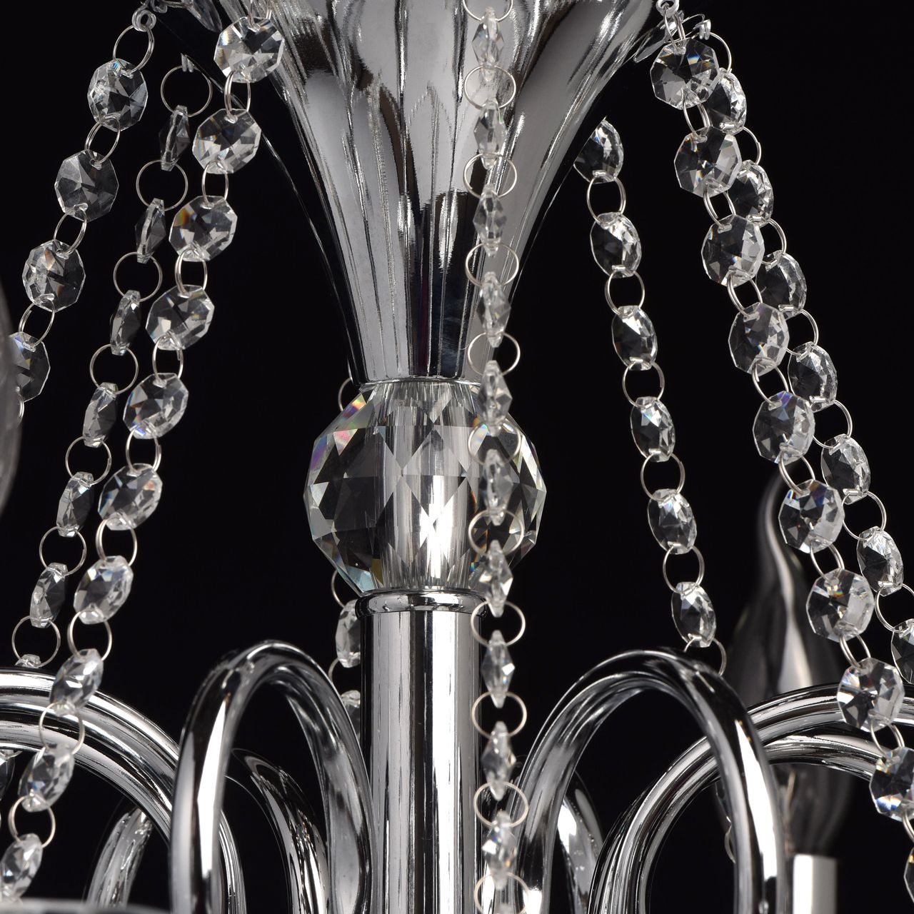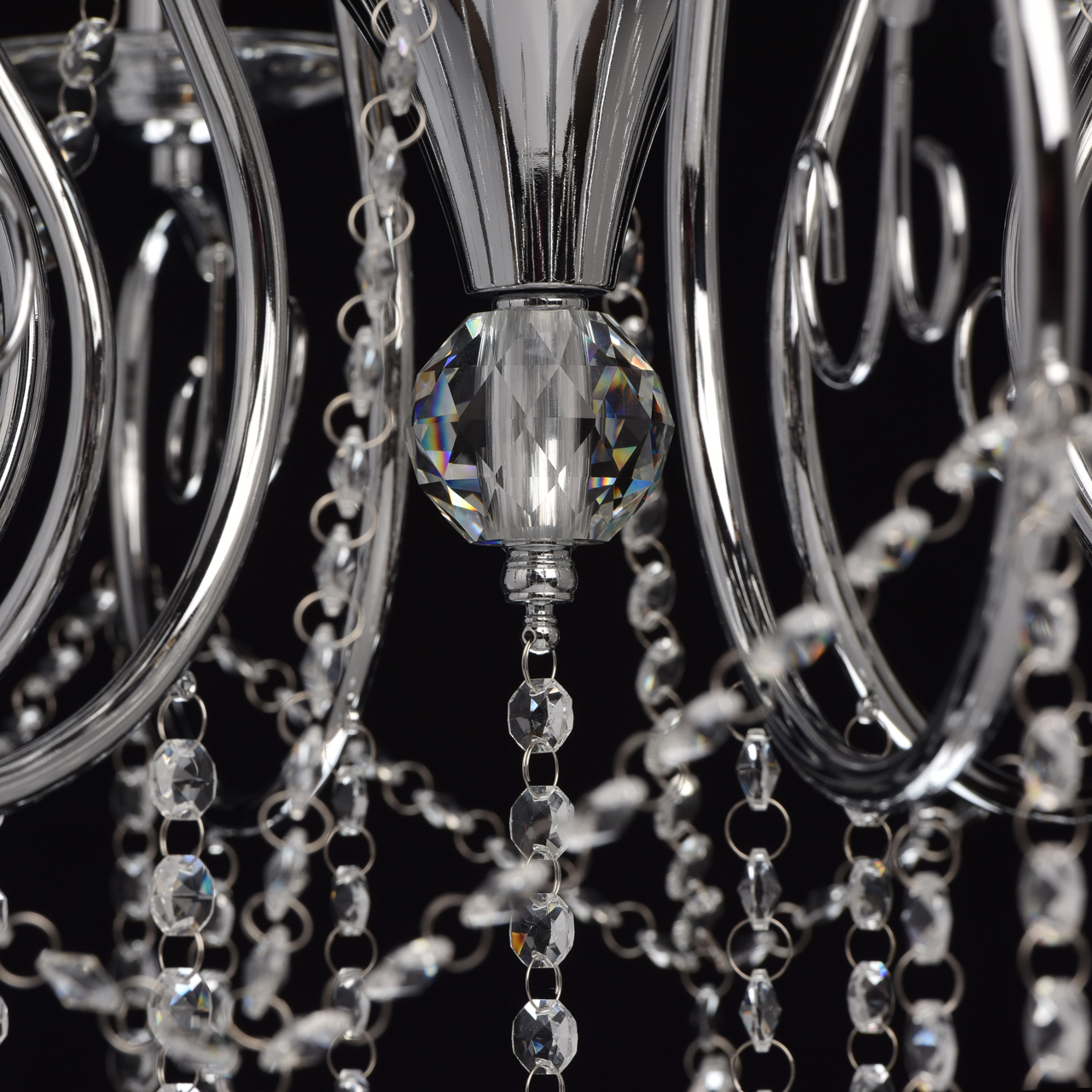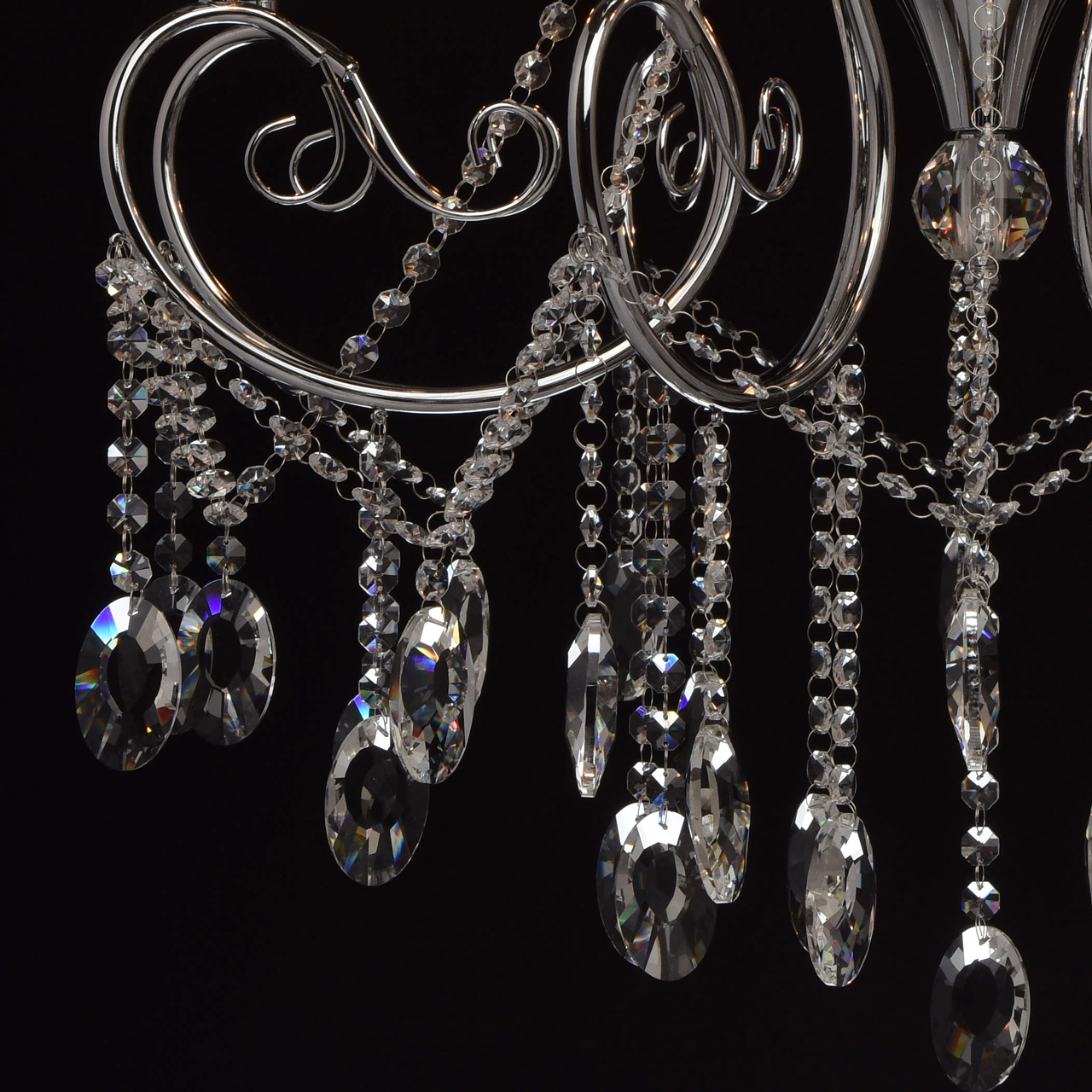 Основание: металл, гальванизировано в цвет хрома. Рожки выполнены по технологии проката на роликовом станке. Декоративные элементы на центральной оси выполнены по технологии токарной обработки. Центральная ось декорирована массивами хрусталя. Декоративные розетки выполнены из массива хрусталя. Светильник декорирован подвесками из хрусталя высокого качества формы октагон и овал.Тип помещения