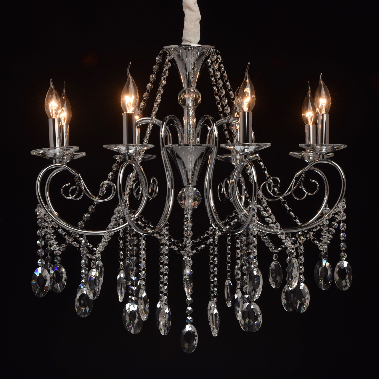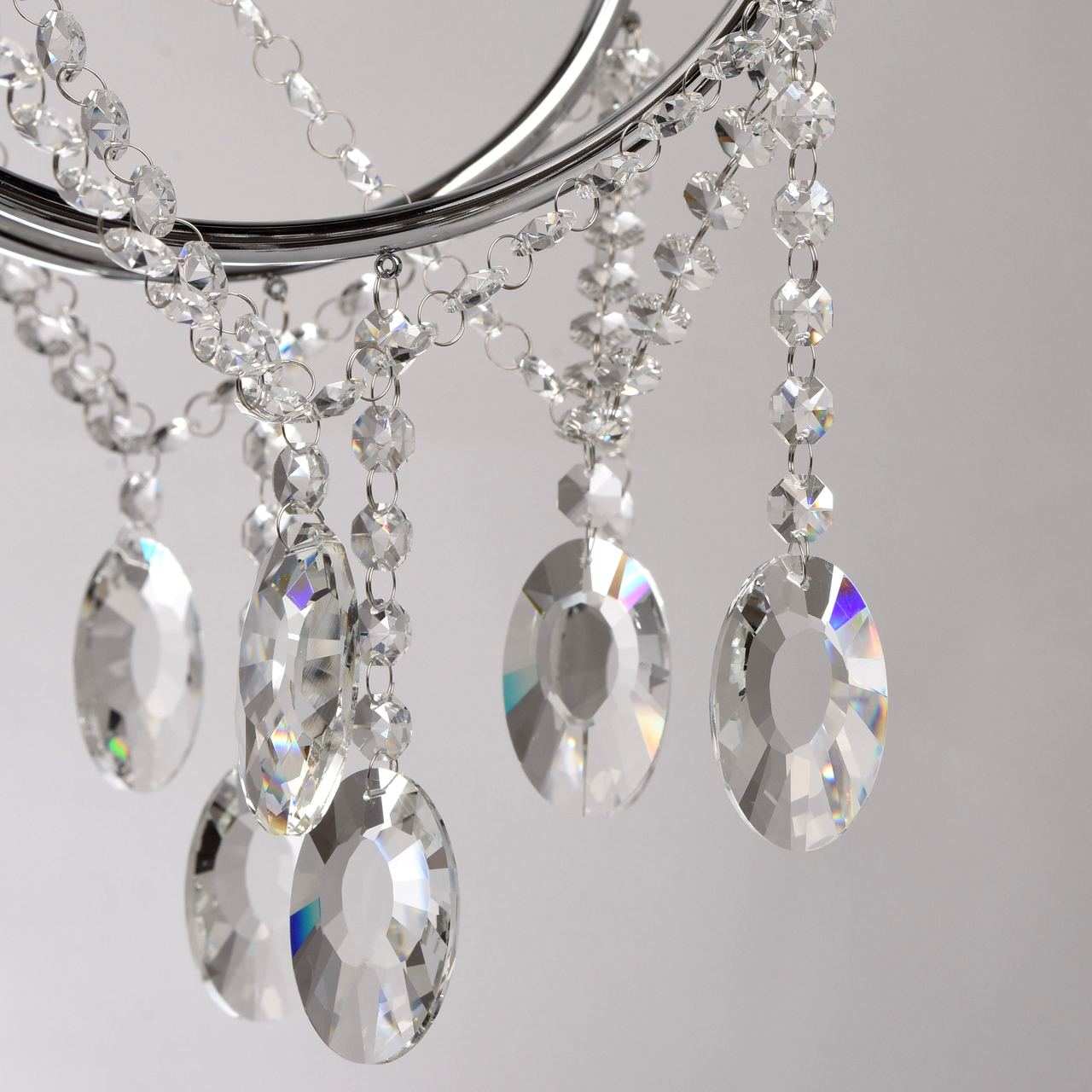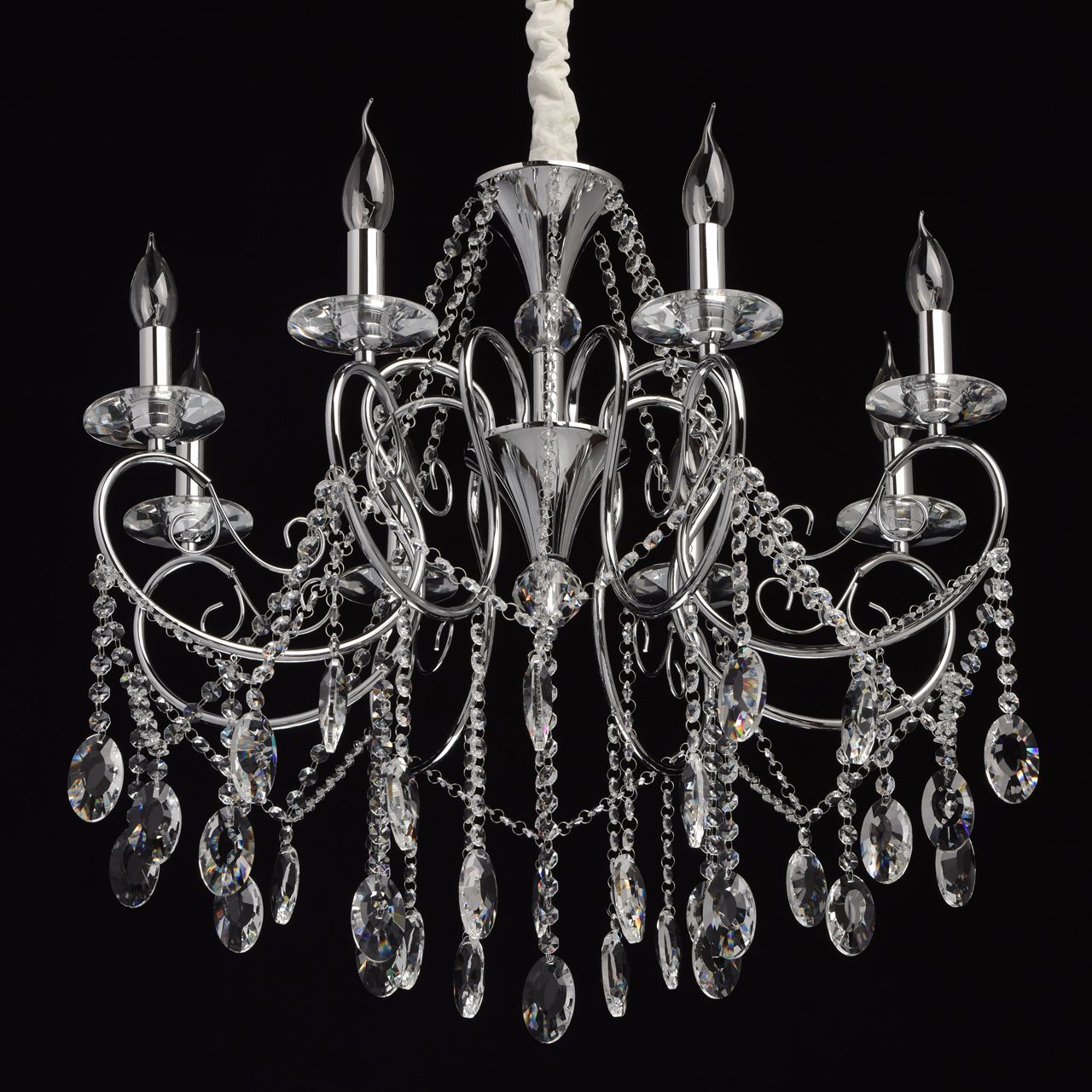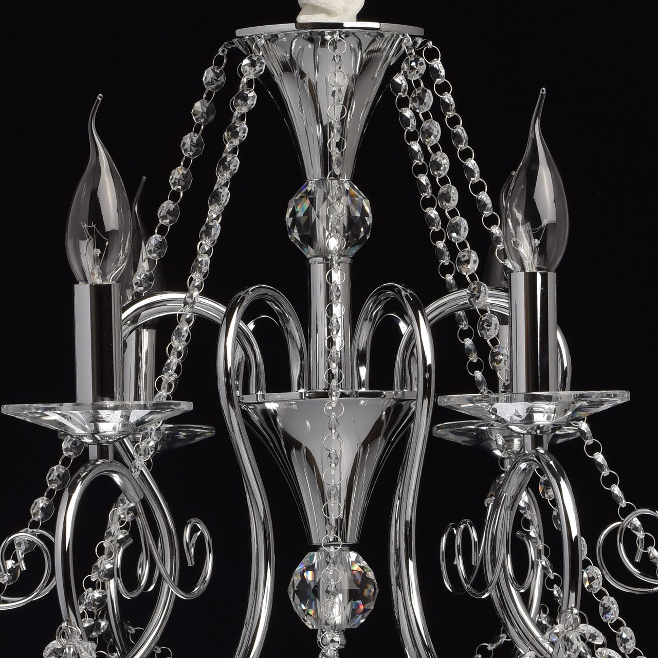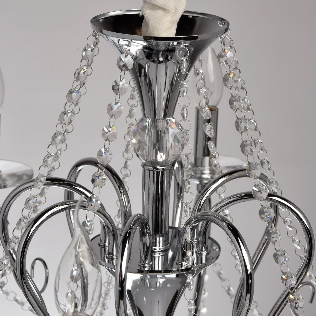 Основание: металл, гальванизировано в цвет хрома. Рожки выполнены по технологии проката на роликовом станке. Декоративные элементы на центральной оси выполнены по технологии токарной обработки. Центральная ось декорирована массивами хрусталя. Декоративные розетки выполнены из массива хрусталя. Светильник декорирован подвесками из хрусталя высокого качества формы октагон и овал.Тип помещения