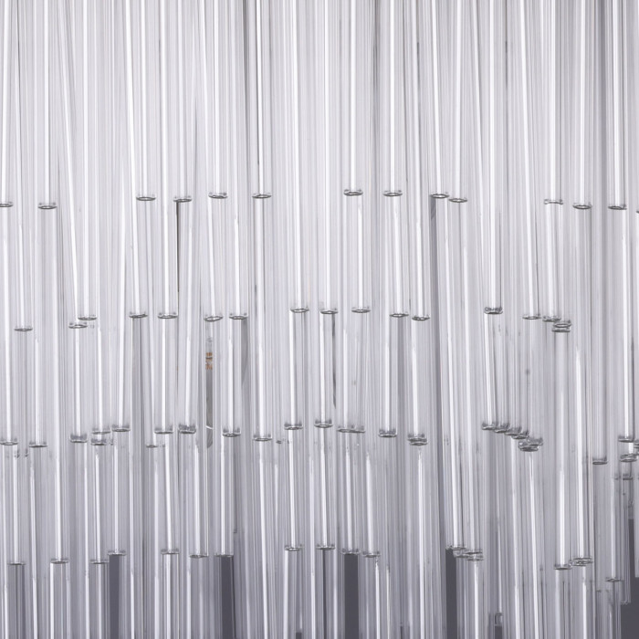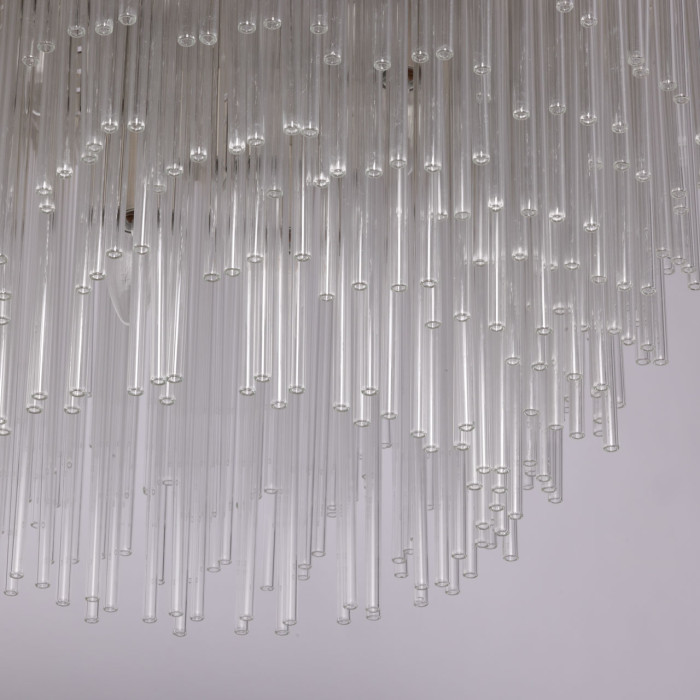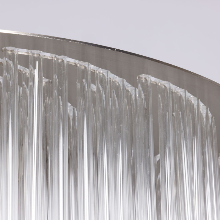 Гальваника в цвет никеля сочетается с современными интерьерами. Стеклянный декор создает уникальную игру света и тени, что придает люстре особый шарм и уникальность. Люстра создает приятную атмосферу, идеально подходящую для расслабляющих вечеров или романтических ужинов. Заменяемые источники света удобны в эксплуатации.Металлическое основание подвесной люстры гальванизировано в цвет никеля. Светильник декорирован прозрачными стеклянными трубочками.