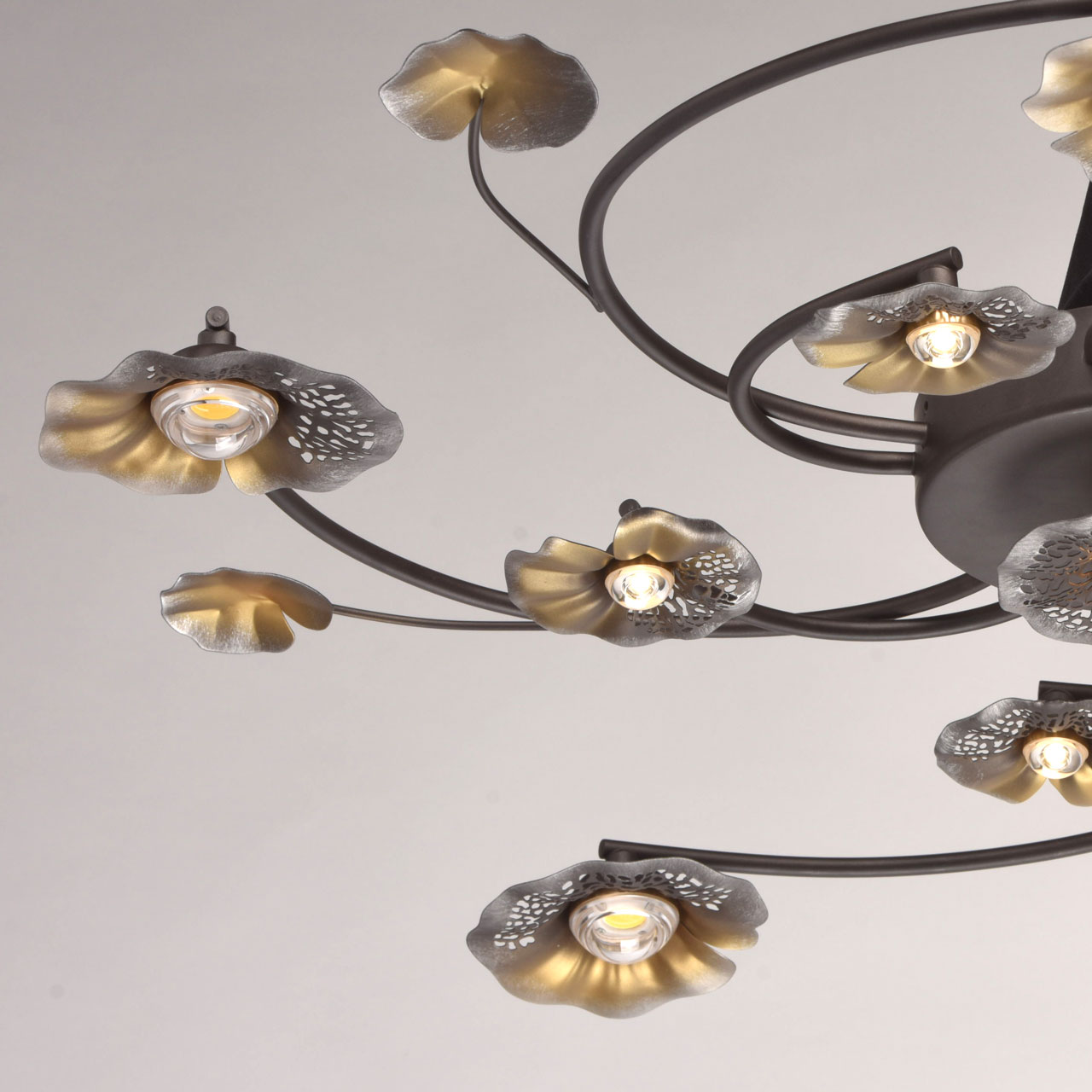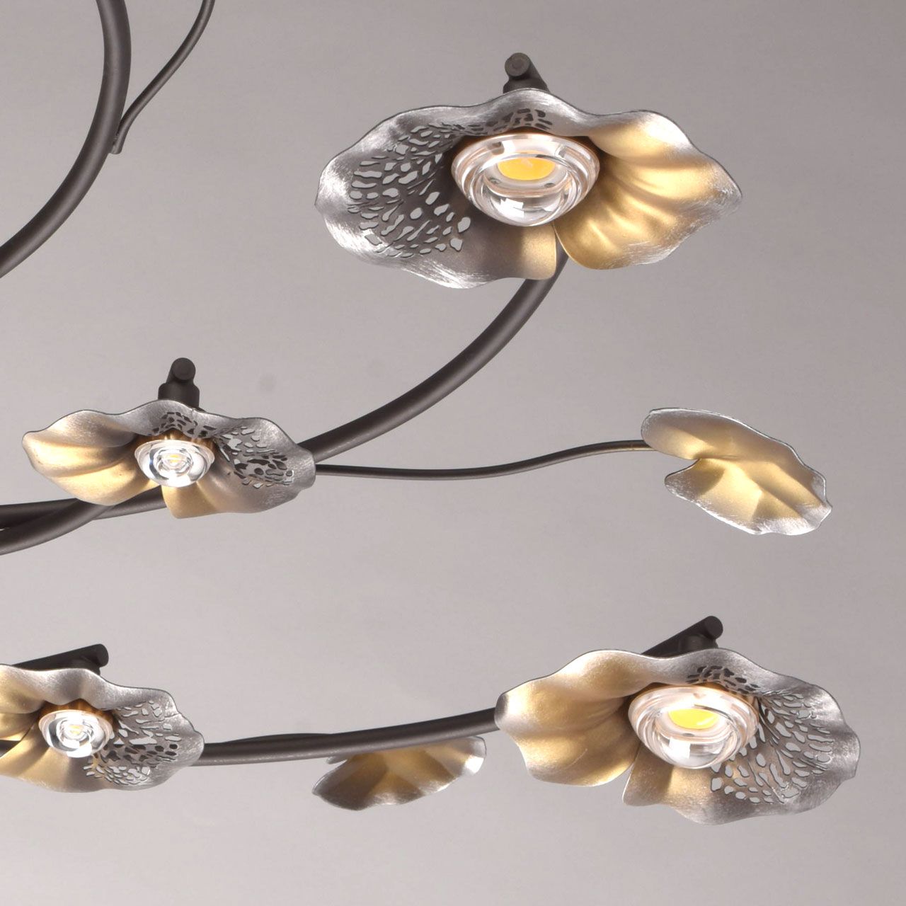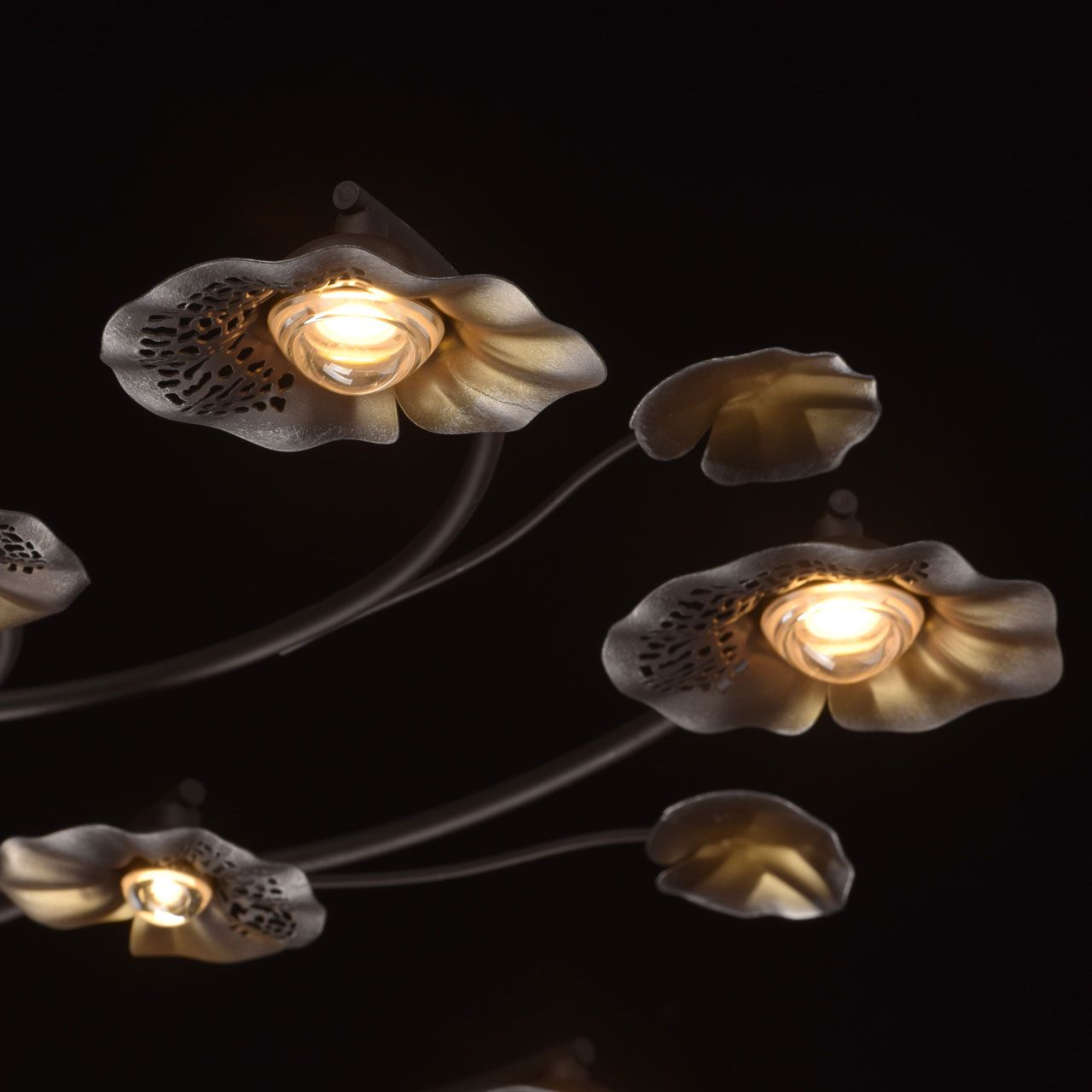 Основание светильника выполнено из сплава металла и окрашено в цвет кофе. Декоративные плафоны выполнены из сплава металла и окрашены в цвет серебра и бронзы. Светодиодные источники света типа СОВ не закрыты.Тип помещения