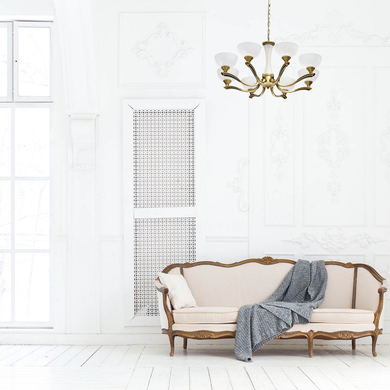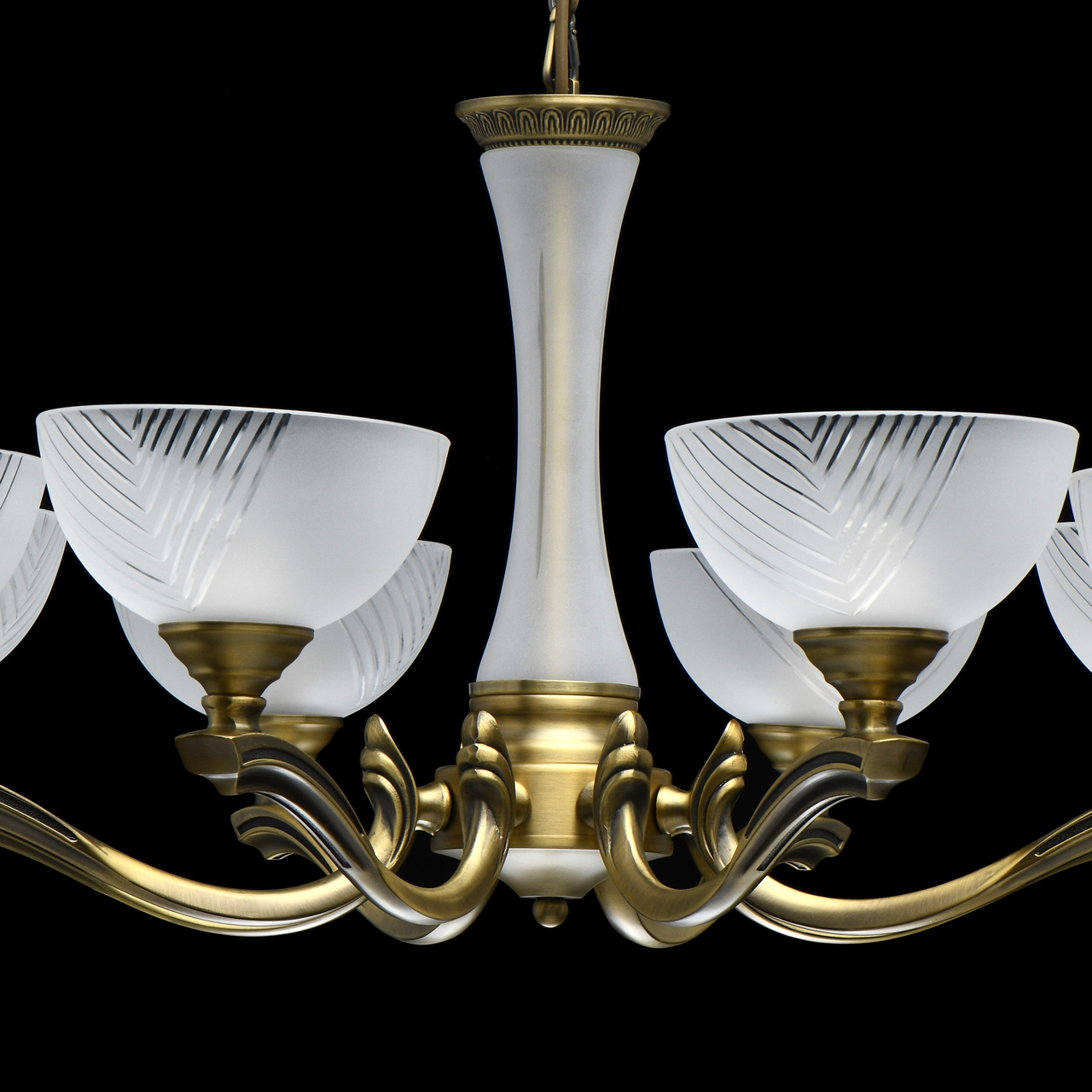 Основание светильника выполнено из комбинации сплавов металлов и гальванизировано в цвет античной бронзы. Рожки выполнены по технологии художественного литья. Светильник декорирован стеклянными плафонами, обработанными по технологии пескоструйного матирования. На плафоны нанесен геометрический рисунок с помощью алмазного резца.Тип помещения