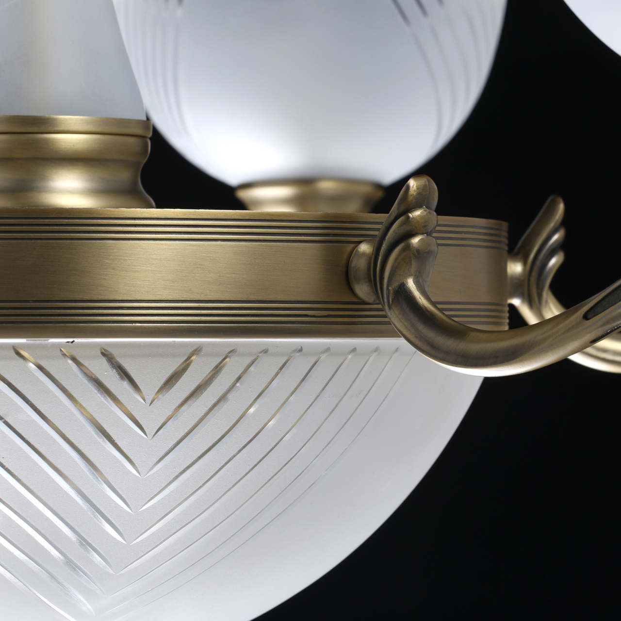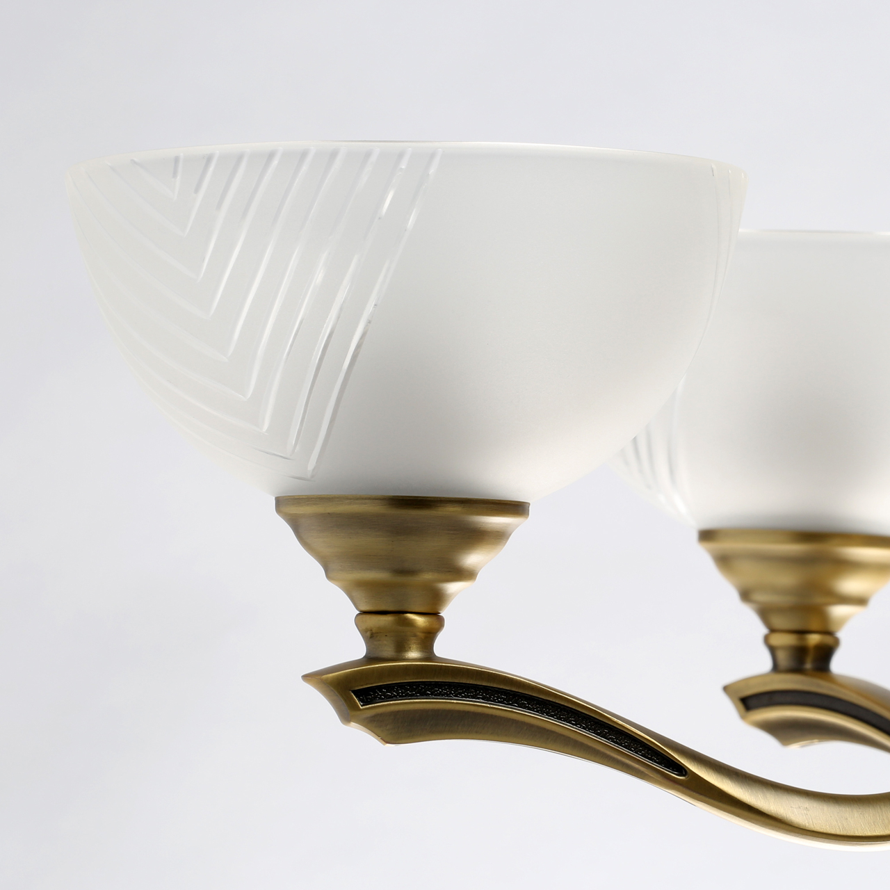Основание светильника выполнено из комбинации сплавов металлов и гальванизировано в цвет античной бронзы. Рожки выполнены по технологии художественного литья. Светильник декорирован стеклянными плафонами, обработанными по технологии пескоструйного матирования. На плафоны нанесен геометрический рисунок с помощью алмазного резца.Тип помещения