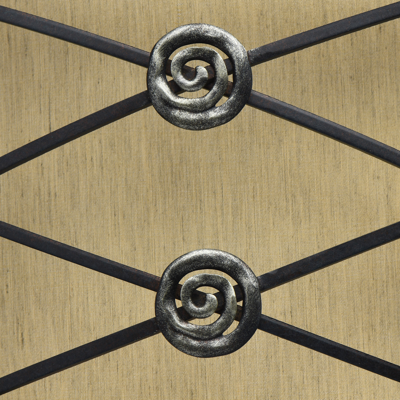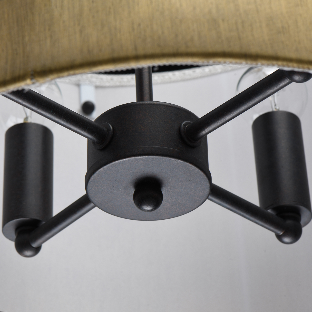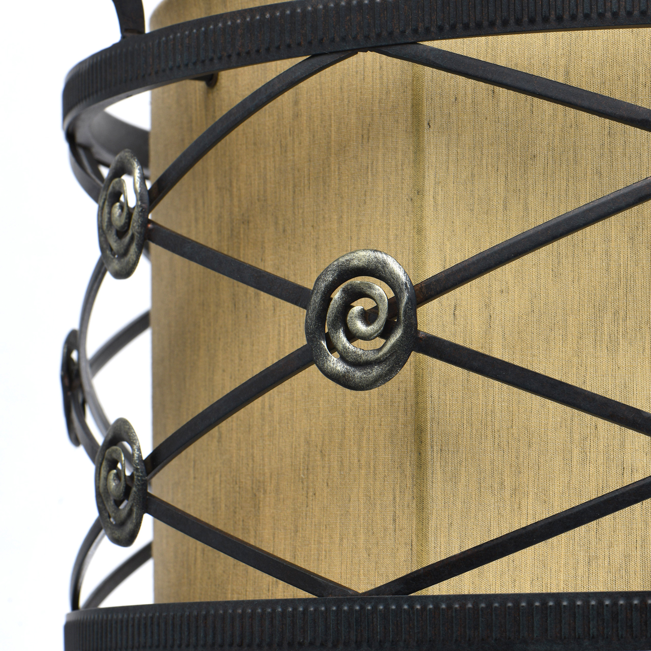 Основание светильника выполнено из металла и окрашено в темно-коричневый цвет. Декоративные элементы выполнены по технологии ковка и окрашены в цвет серебра. Светильники дополняет фактурный текстильный абажур желтого цвета.Тип помещения