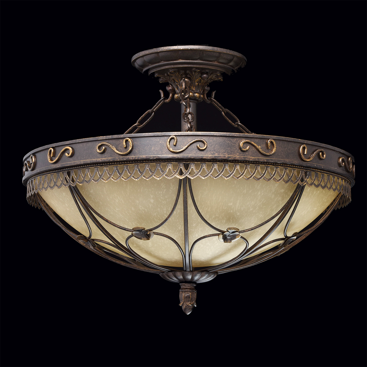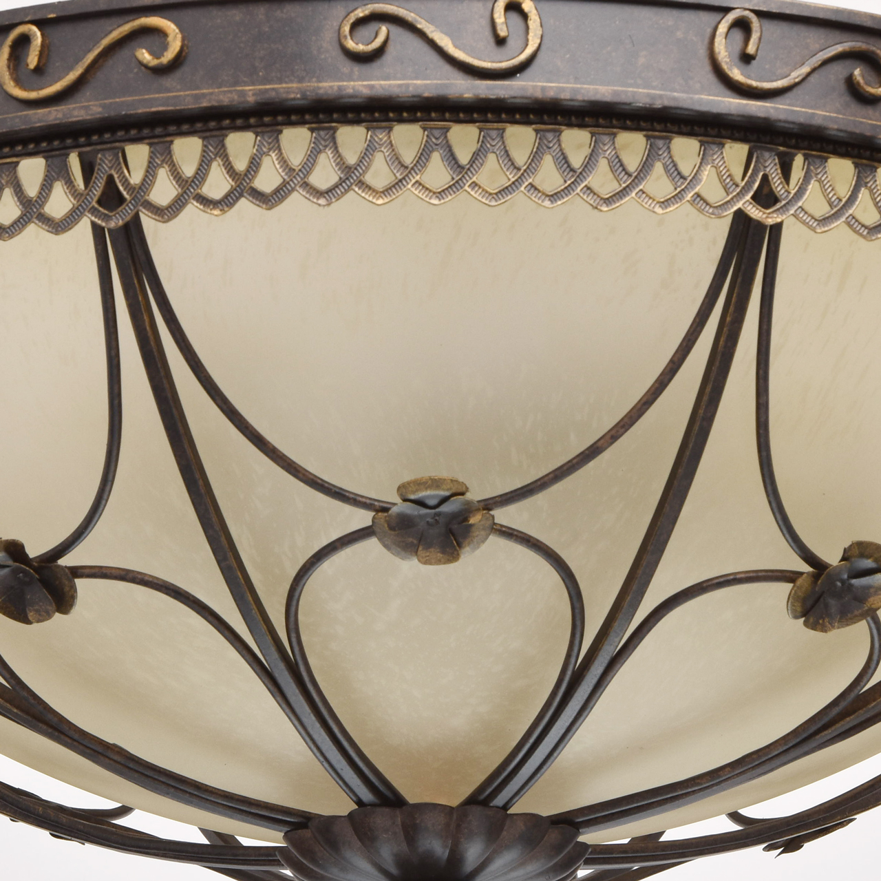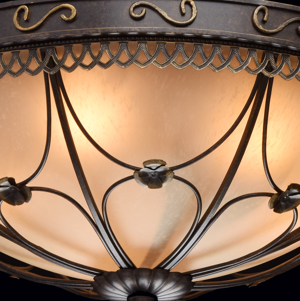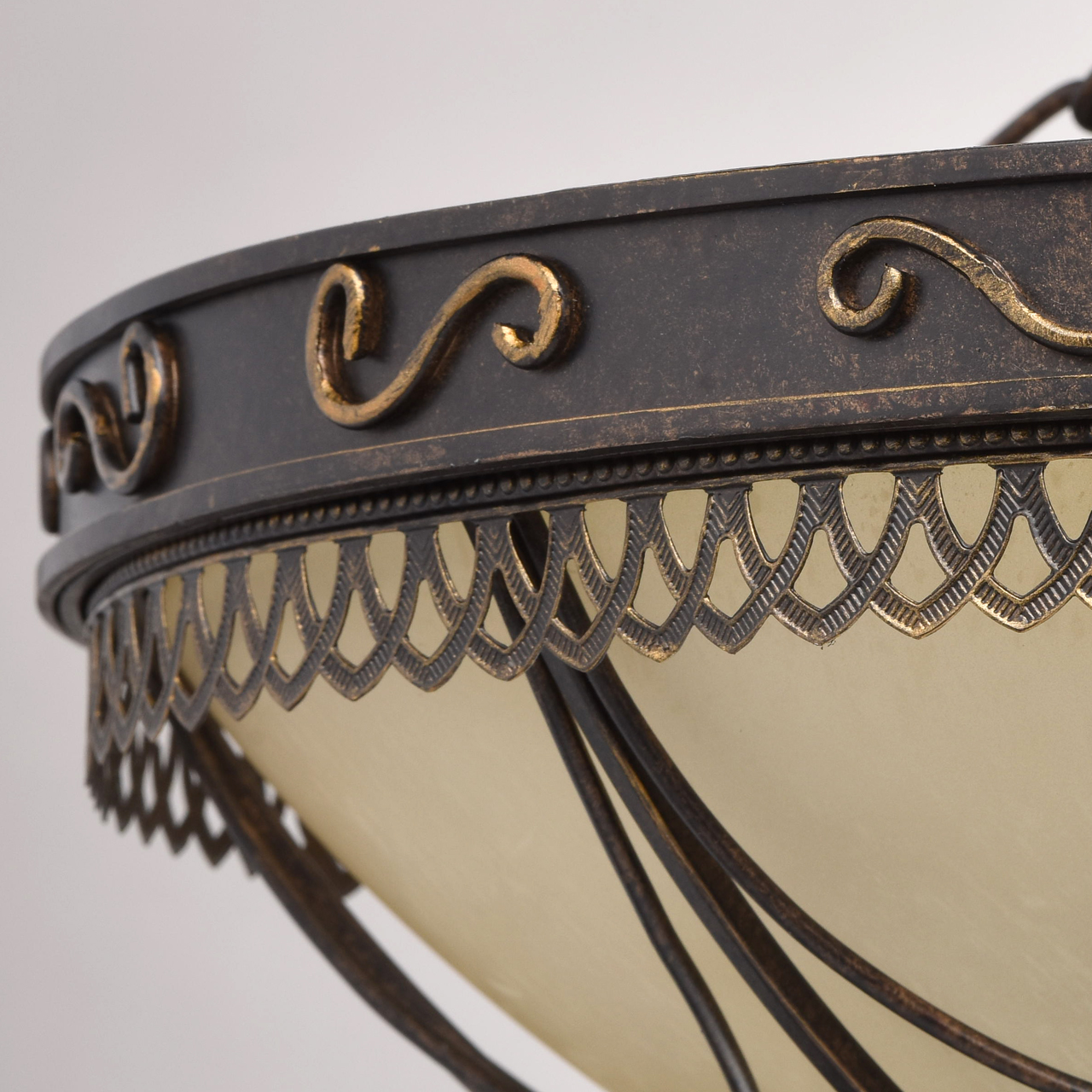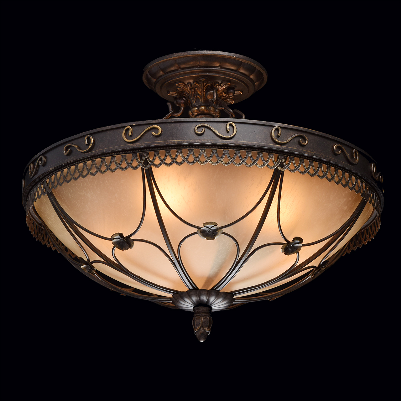 Потолочный светильник Айвенго запоминается необычным декором в виде паутинки из кованого металла поддерживающей объёмный стеклянный плафон искусно декорированный под старину. Компактный светильник украсит небольшие тематические помещения под стиль Кантри или станет отличным вариантом для зонального освещения.Преимущества модели