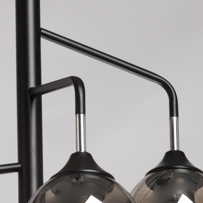 Стильная люстра подойдет как в современный интерьер, так и в интерьеры в стиле лофт. Черный цвет основания эффектно выделяет люстру на потолке. Градиентная гальваника плафонов создает мягкое освещение. Заменяемые источники света удобны в эксплуатации. Возможность регулировать комфортную высоту.Металлическое основание подвесной люстры окрашено в черный цвет. Отдельные элементы основания гальванизированы в цвет хрома. Стеклянные плафоны выдуваются в форму и гальванизированы в дымчатый цвет по принципу градиента - от основания плафона к краю цвет истончается.