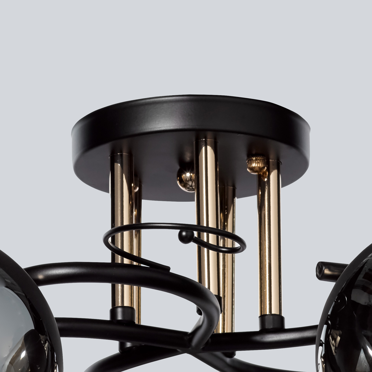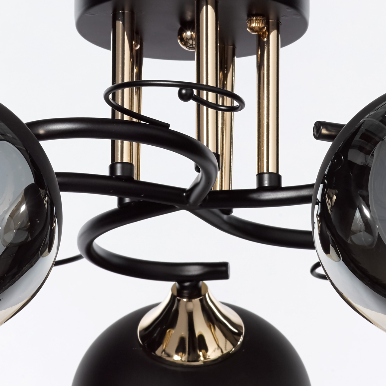 Трендовое сочетание металлов черного цвета и золота. Двуцветные тонированные плафоны создают яркий акцент. Компактная высота модели идеальна для стандартной высоты потолка. Заменяемые источники света удобны в эксплуатации.Преимущества модели