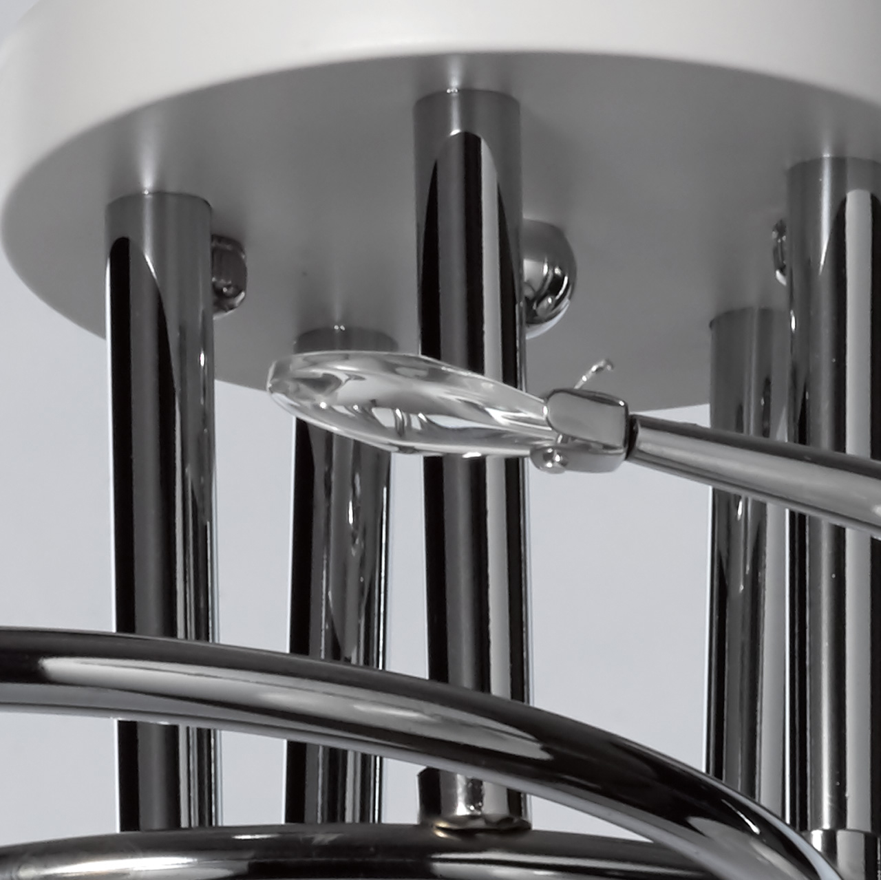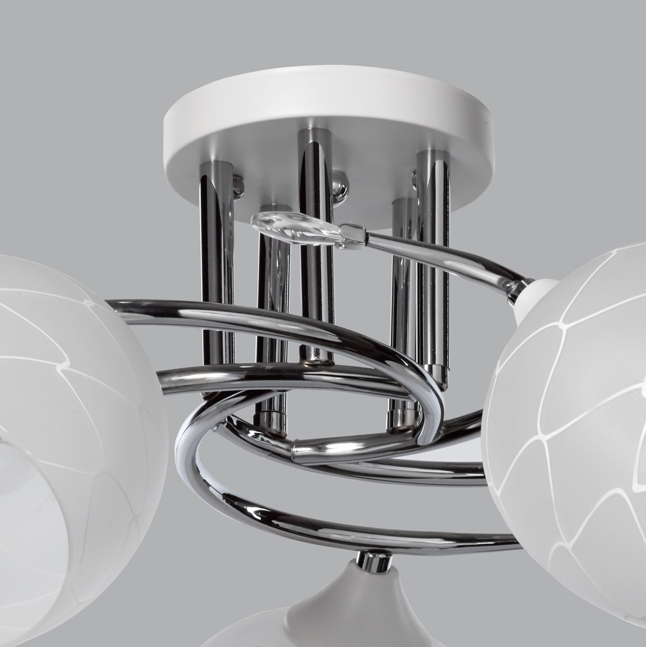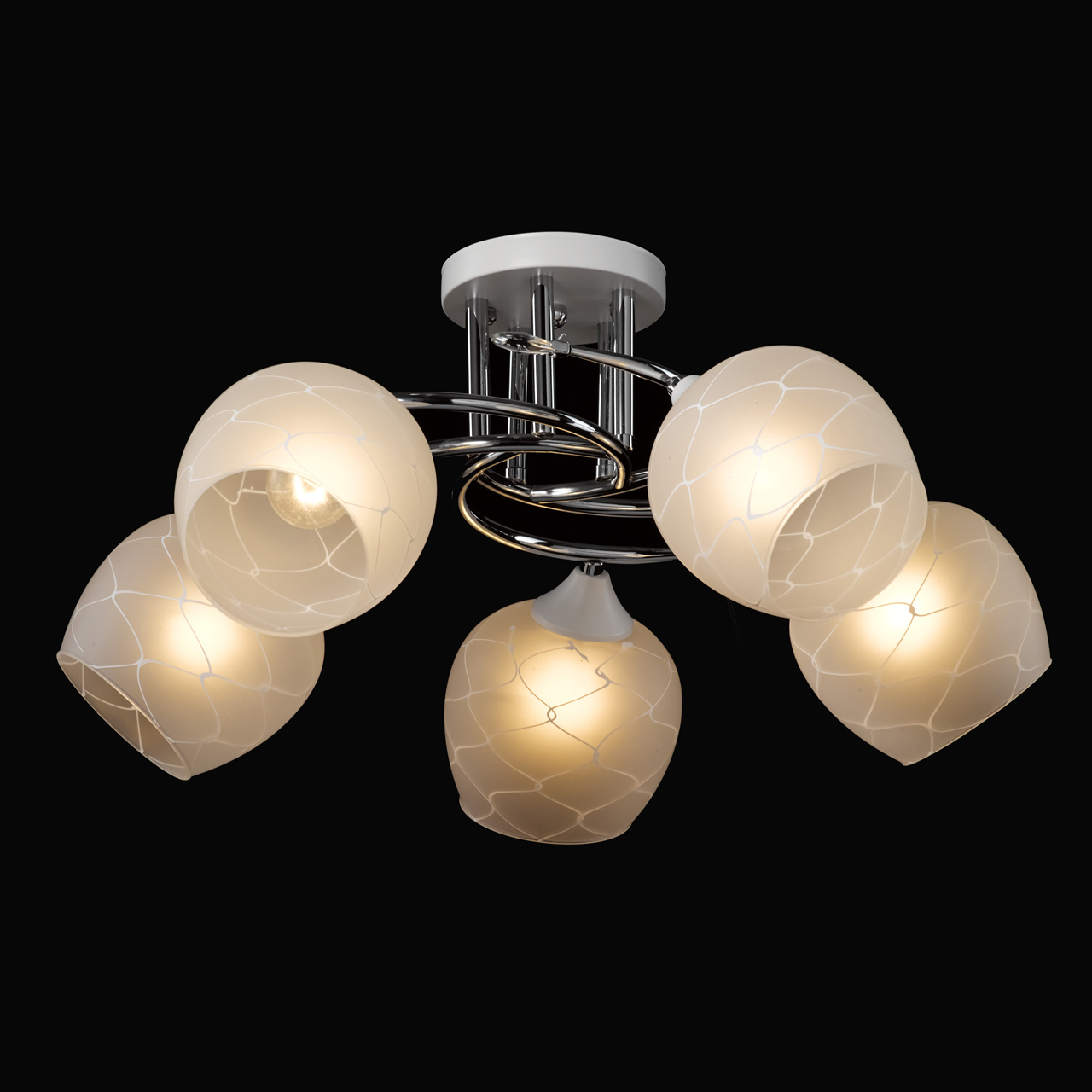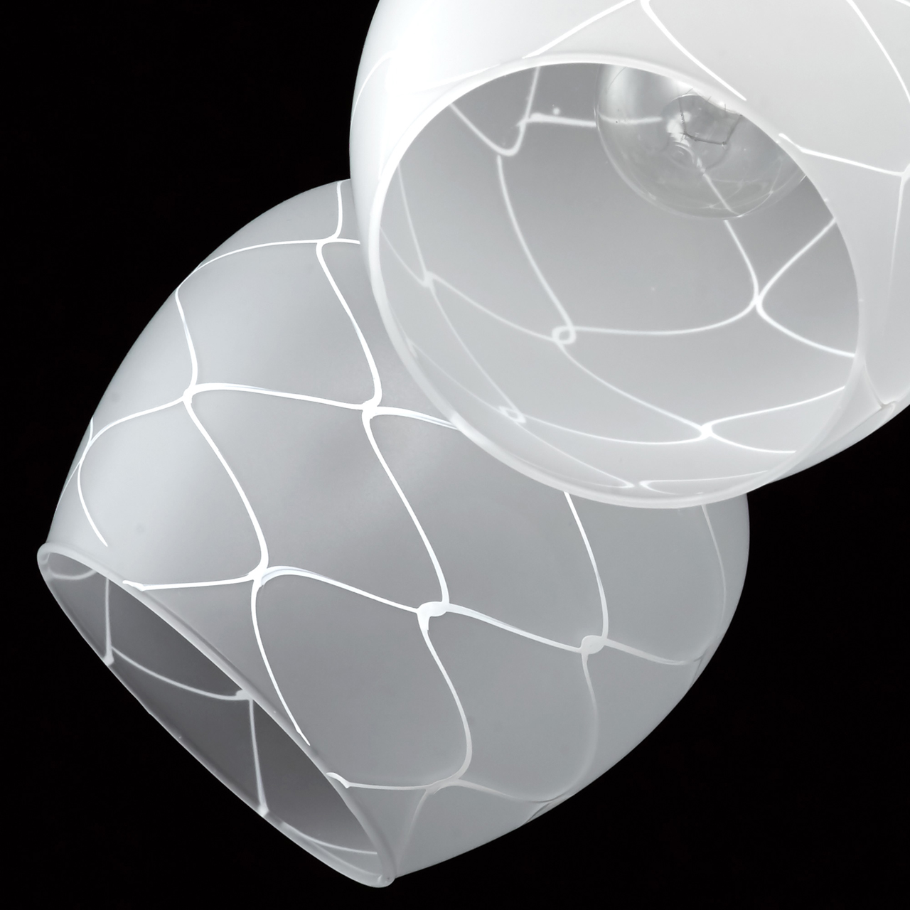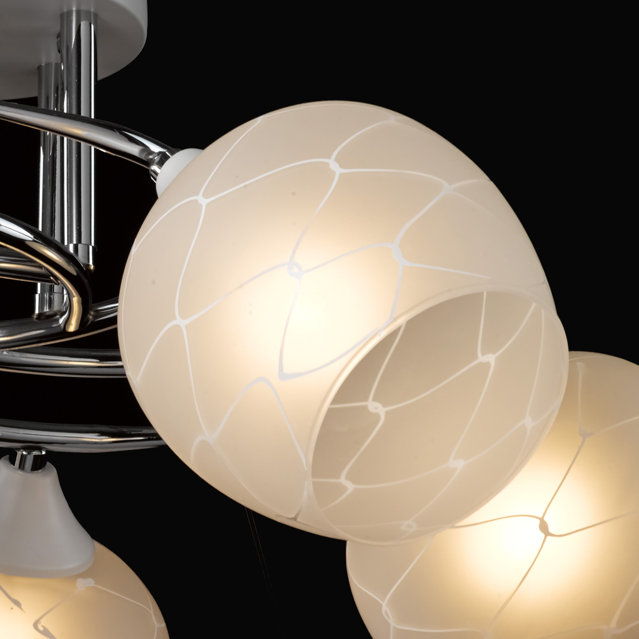 Основание светильника выполнено из металла и гальванизировано в цвет хрома. Отдельные элементы основания окрашены в белый цвет. На стеклянные матированные плафоны белой краской нанесен рисунок в виде пересекающихся линий. Светильник декорирован прозрачным хрустальным стеклом.Тип помещения