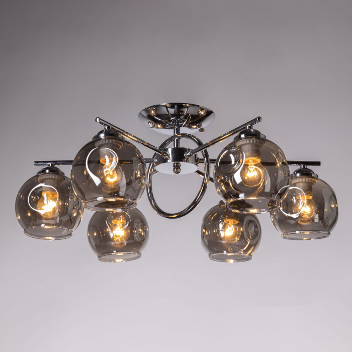 Современный дизайн в стиле хай-тек. Цвет плафонов дымчатый металлик мягко рассеивает свет. Компактный размер потолочной люстры позволяет сохранить пространство комнаты при стандартном потолке. Заменяемые источники света удобны в эксплуатации.Металлическое основание светильника гальванизировано в цвет хрома. Потолочная люстра декорирована выдувными вручную стеклянными плафонами. Плафоны гальванизированы в дымчатый металлизированный цвет.