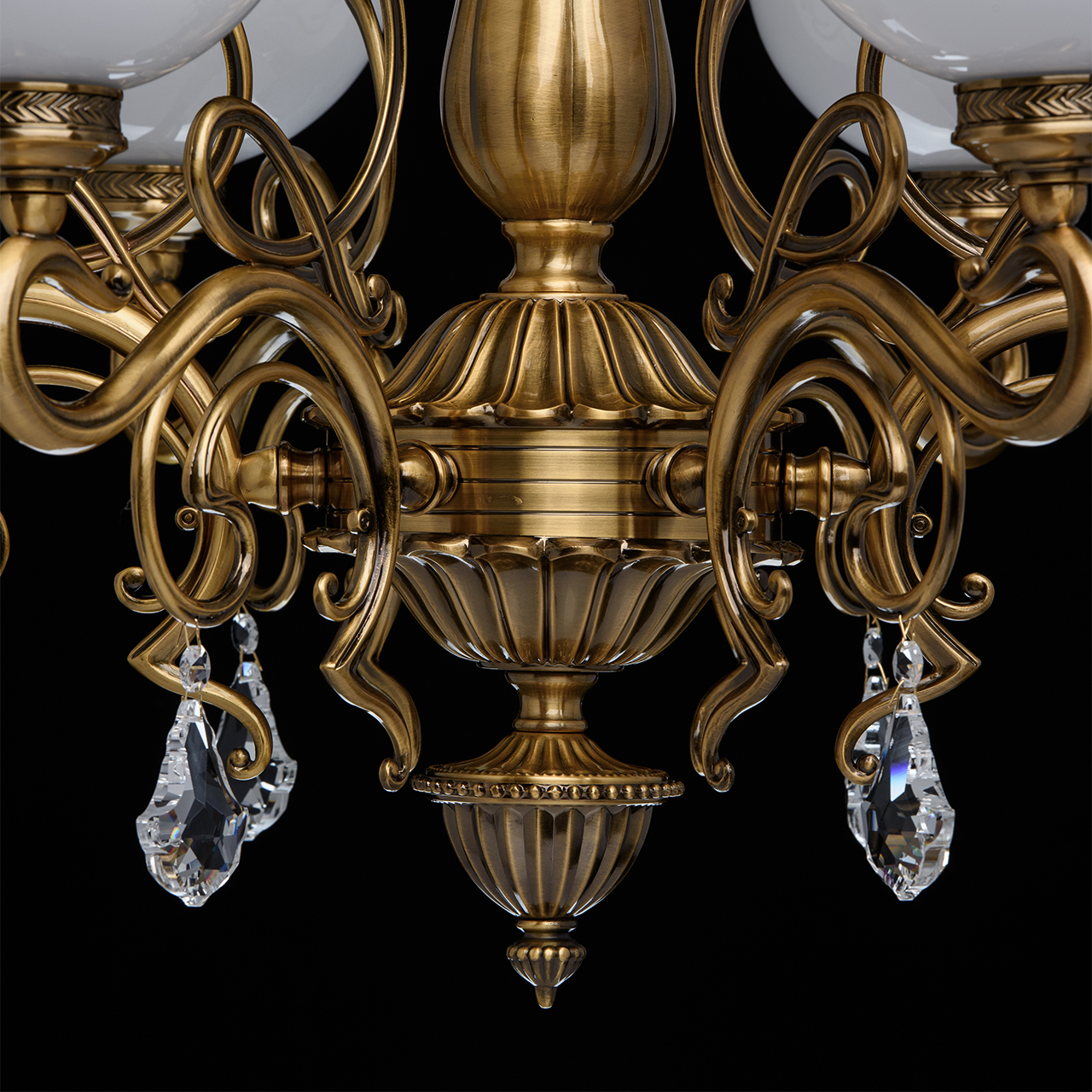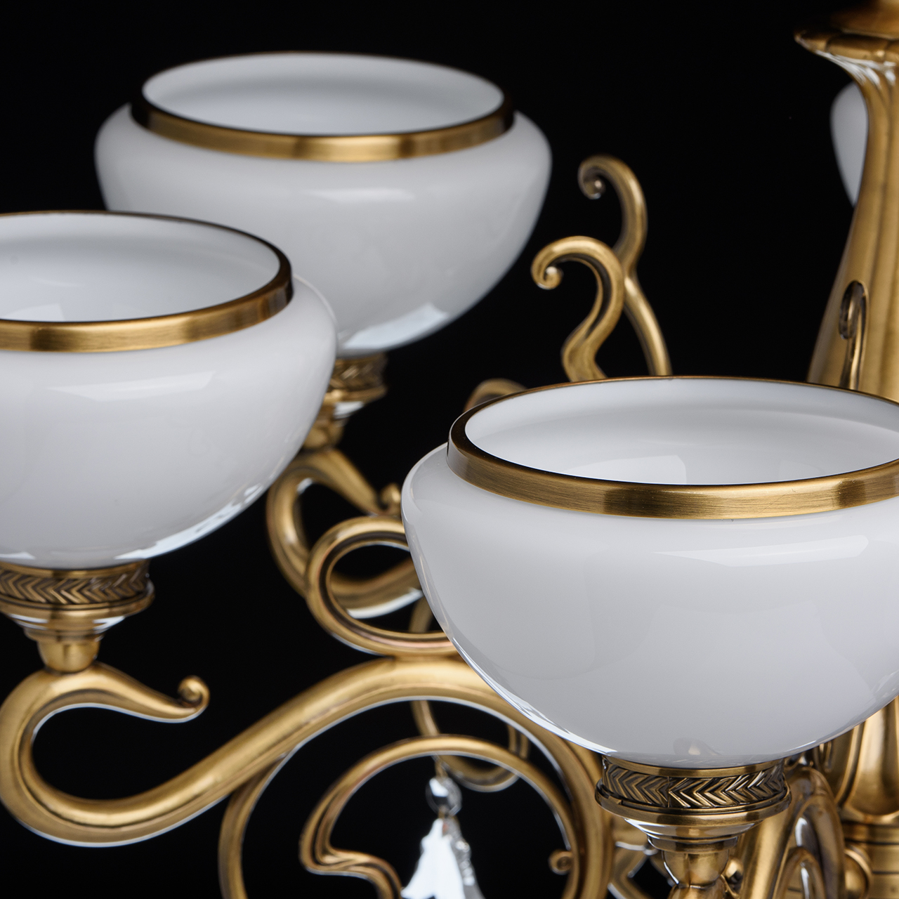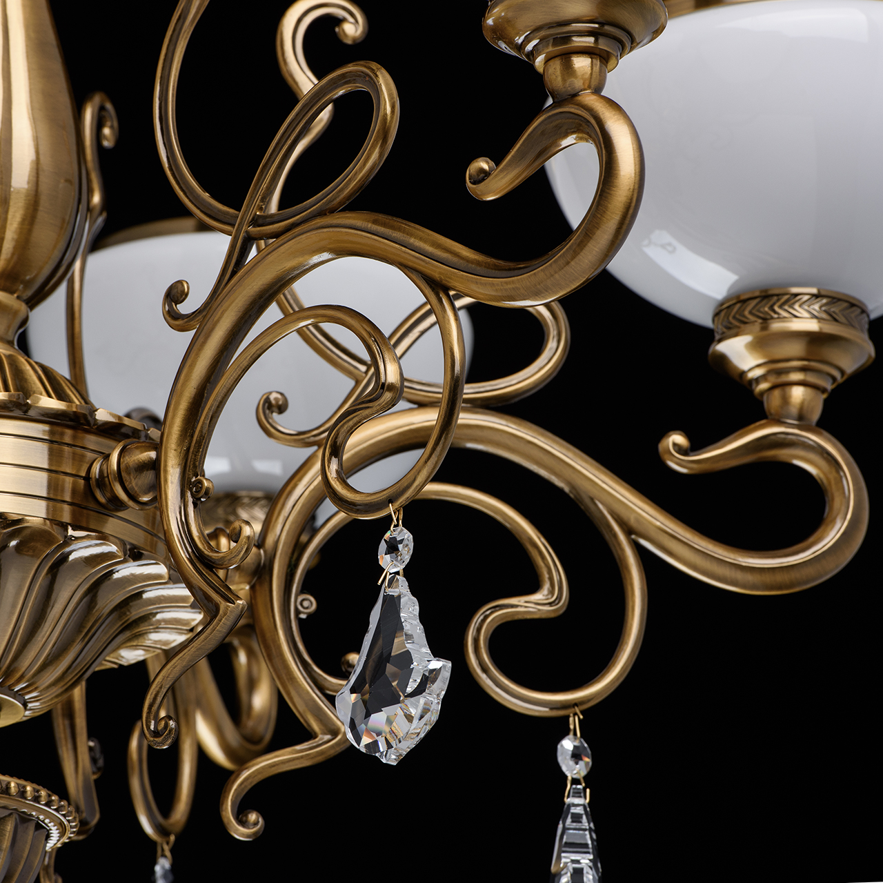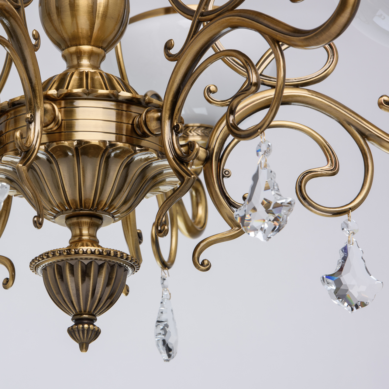 Металлическое основание цвета античной медовой бронзы, плафоны из опалового стекла, декоративные подвески из хрусталяТехнология производства