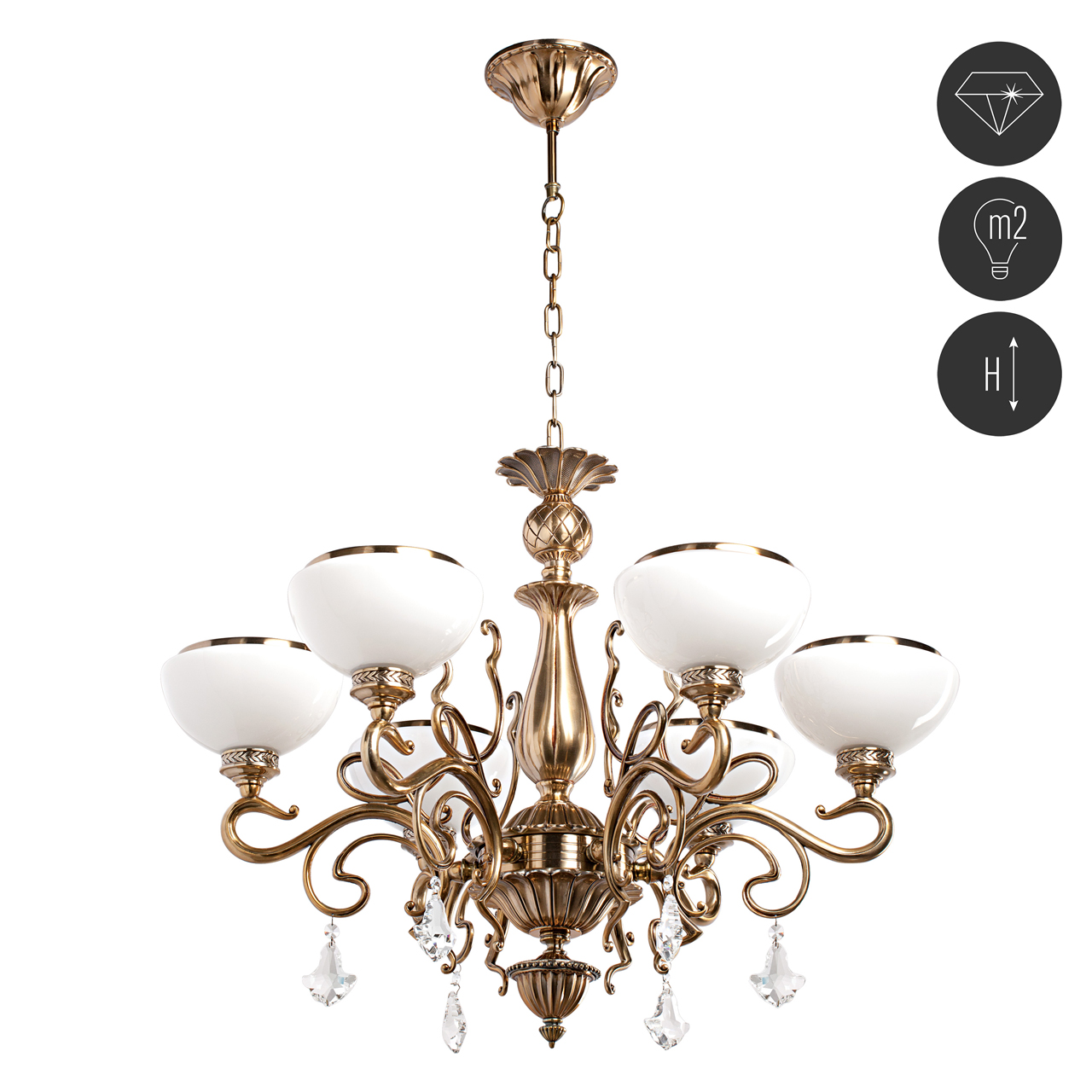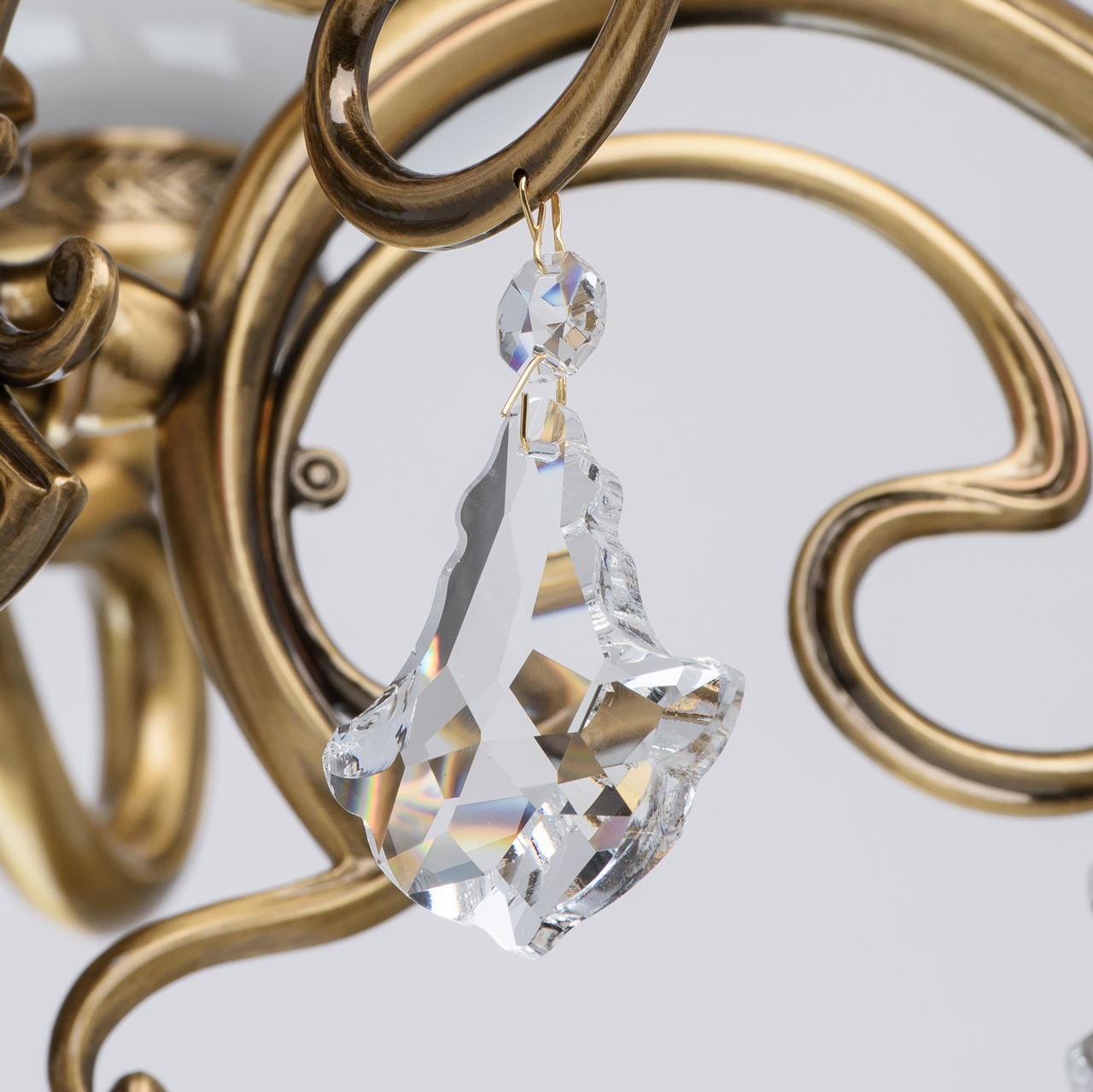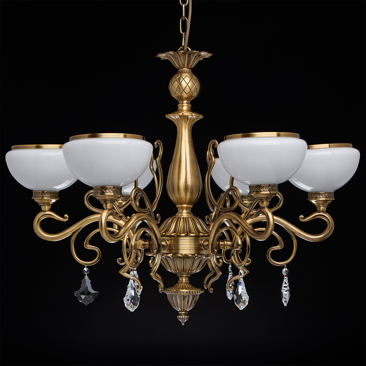 Металлическое основание цвета античной медовой бронзы, плафоны из опалового стекла, декоративные подвески из хрусталяТехнология производства