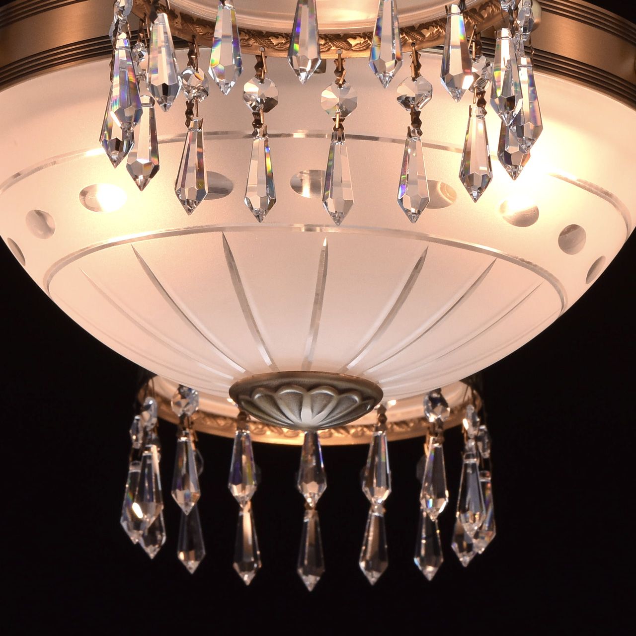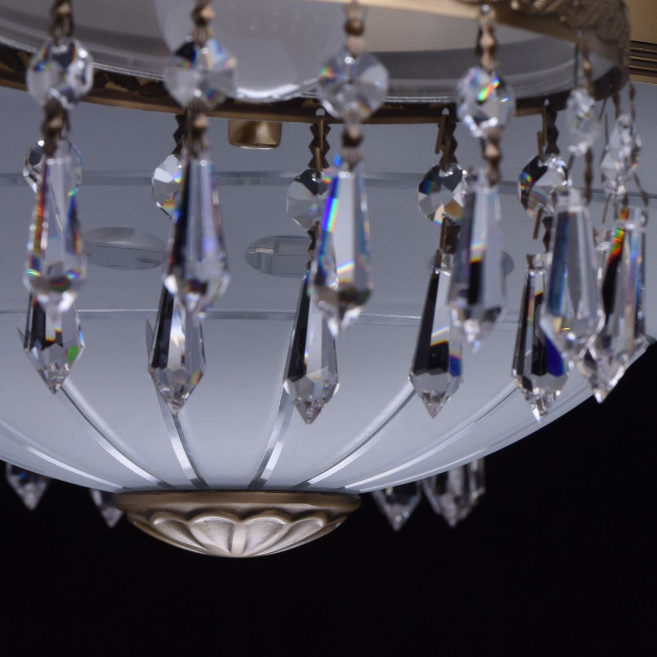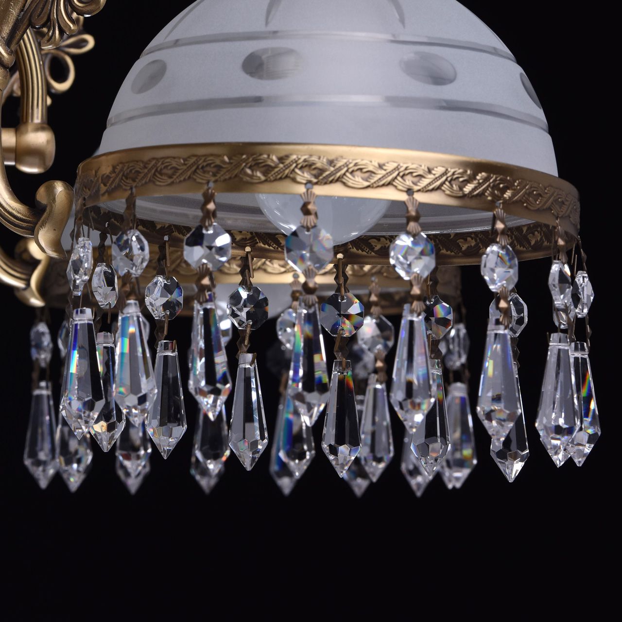 Основание из латуни, стеклянные плафоны с резным узором, декоративные подвески из хрусталя высочайшего качества.Технология производства