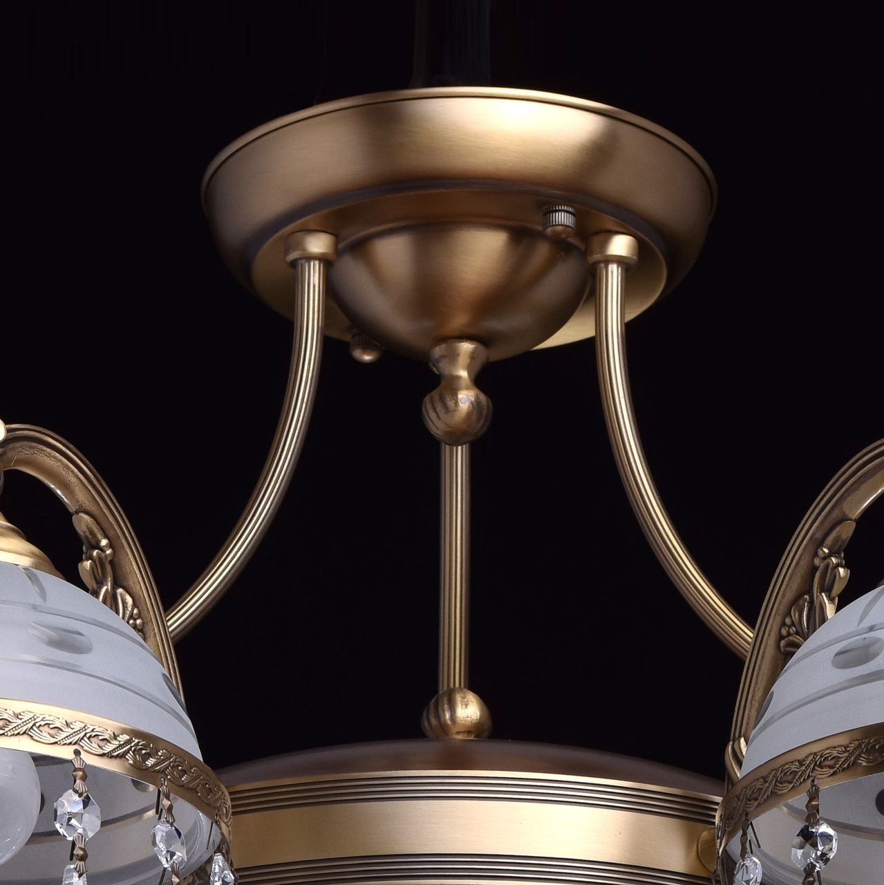 Арматура светильника выполнена из латуни с последующим патинированием и покрытием защитным лаком. Рожки изготовлены по технологии художественного литья. Плафоны декорированы чеканкой из латуни, также покрытой патиной и защитным лаком. Плафоны выполнены из стекла, обработанного пескоструйным матированием, рисунок нанесен алмазной резьбой. Светильник декорирован хрустальными подвесками сложной огранки.Тип помещения