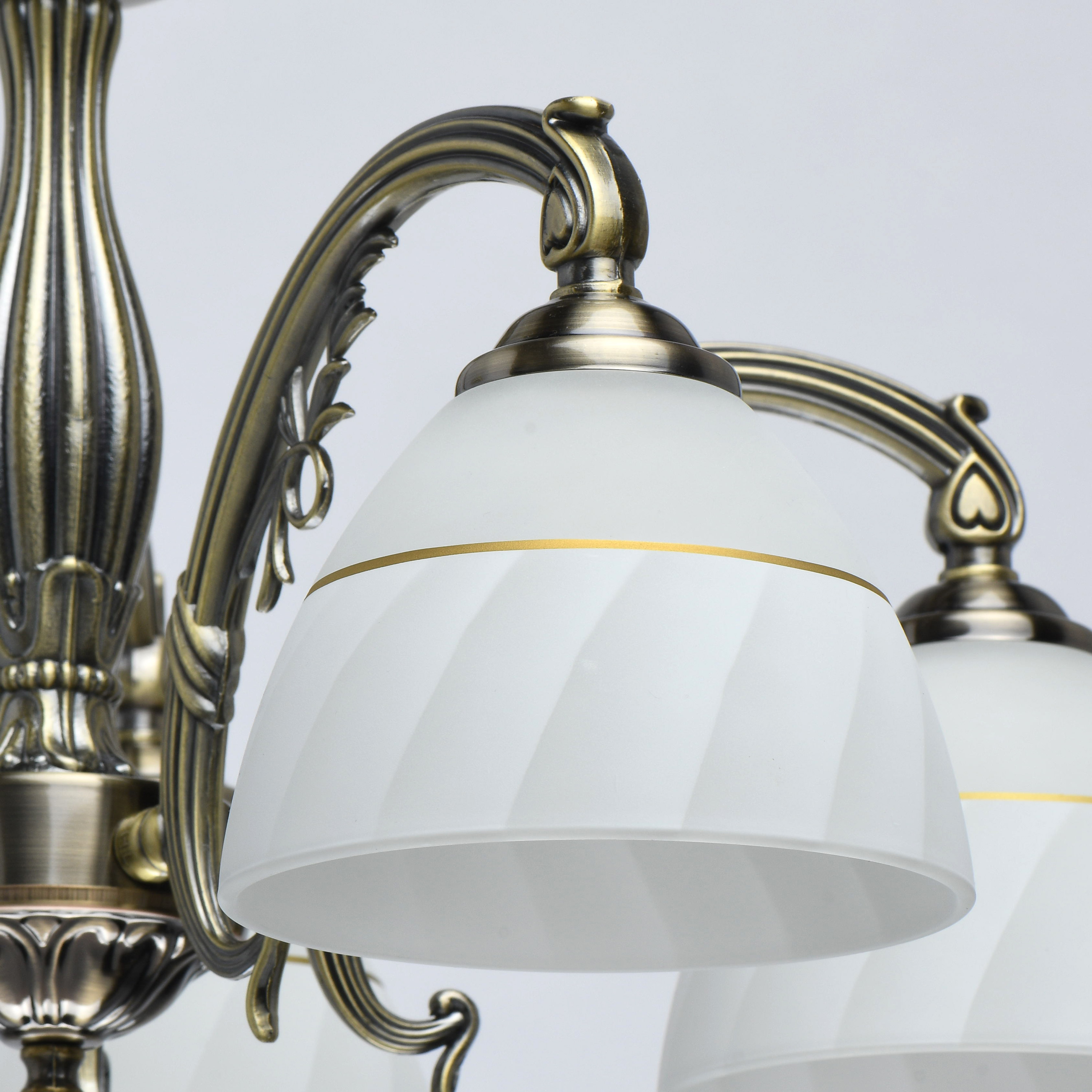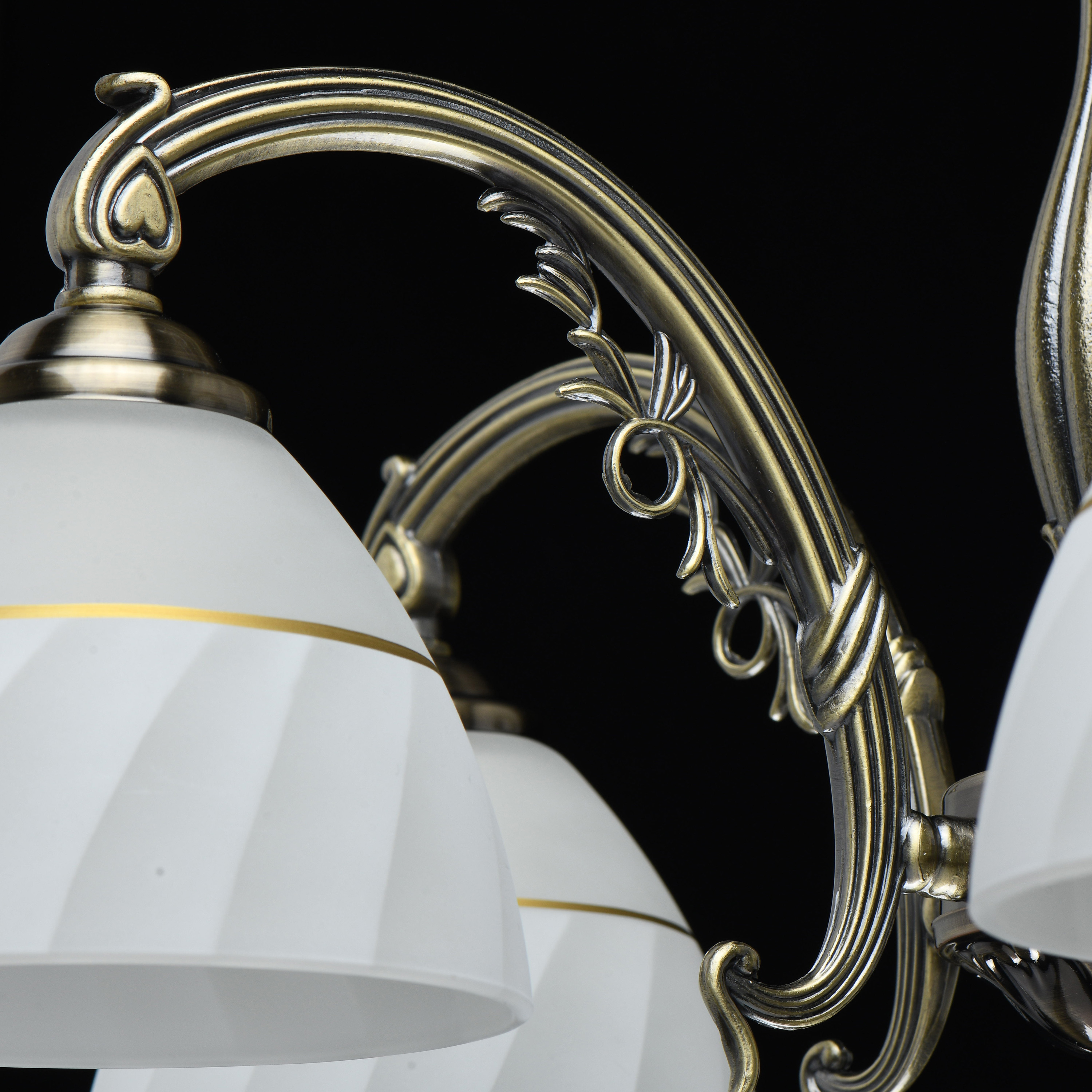Основание светильника выполнено из комбинации сплавов металлов и гальванизировано в цвет античной бронзы. Центральная ось и рожки выполнены по технологии художественного литья из сплава алюминия. Светильник декорирован стеклянными плафонами, матированными по трафарету. На плафон нанесена декоративная полоса золотого цвета.Тип помещения