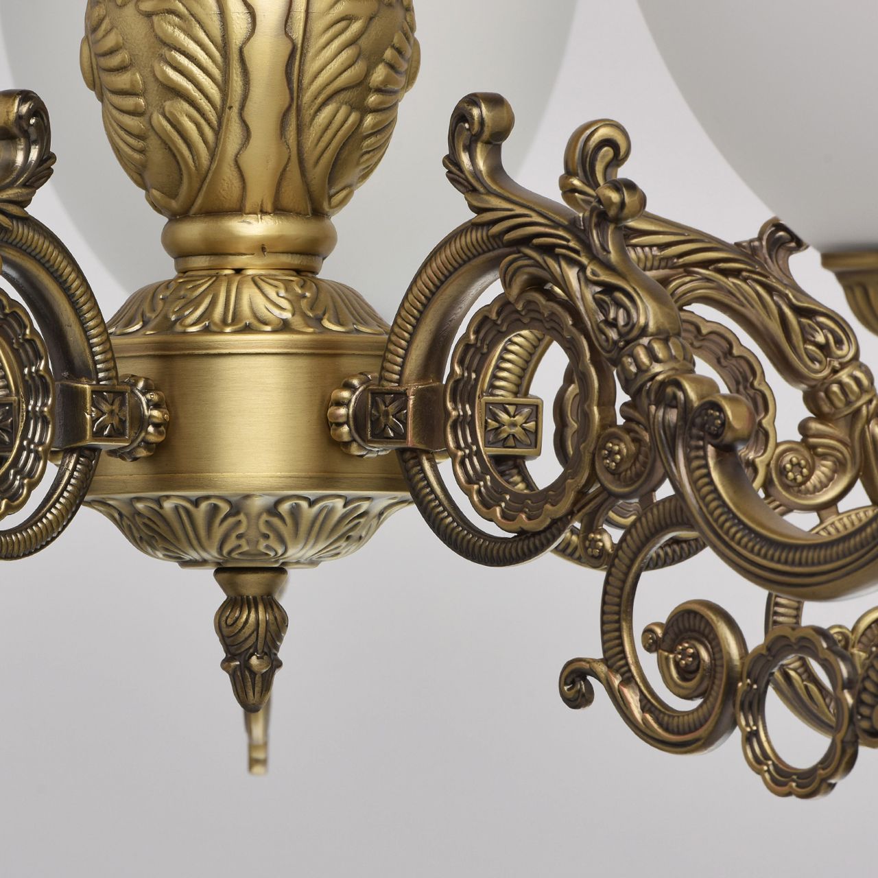 Роскошная люстра из коллекции «Ариадна» выполнена в лучших традициях классического стиля. Матовое Металлическое основание цвета античной бронзы гармонично сочетается с широкими плафонами. Выполненные из матового белого стекла, они идеально подчеркивают бронзовый оттенок. В тон основанию и декор рожков, а множество изящных завитков придают композиции особенную грациозность.Преимущества модели