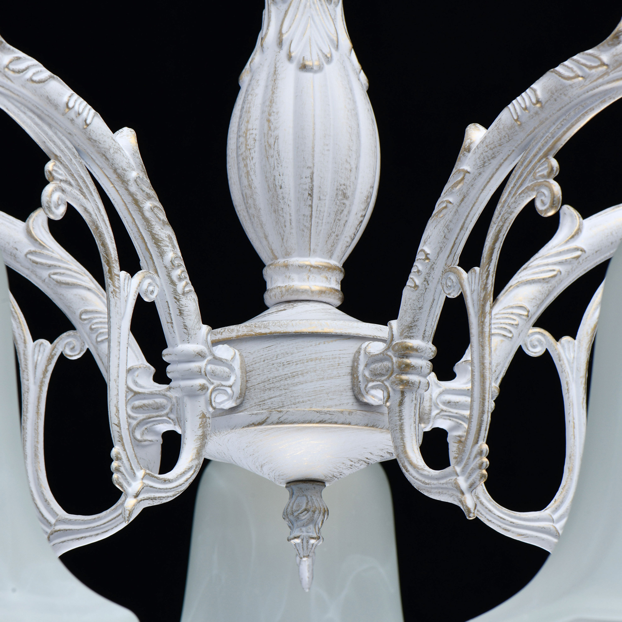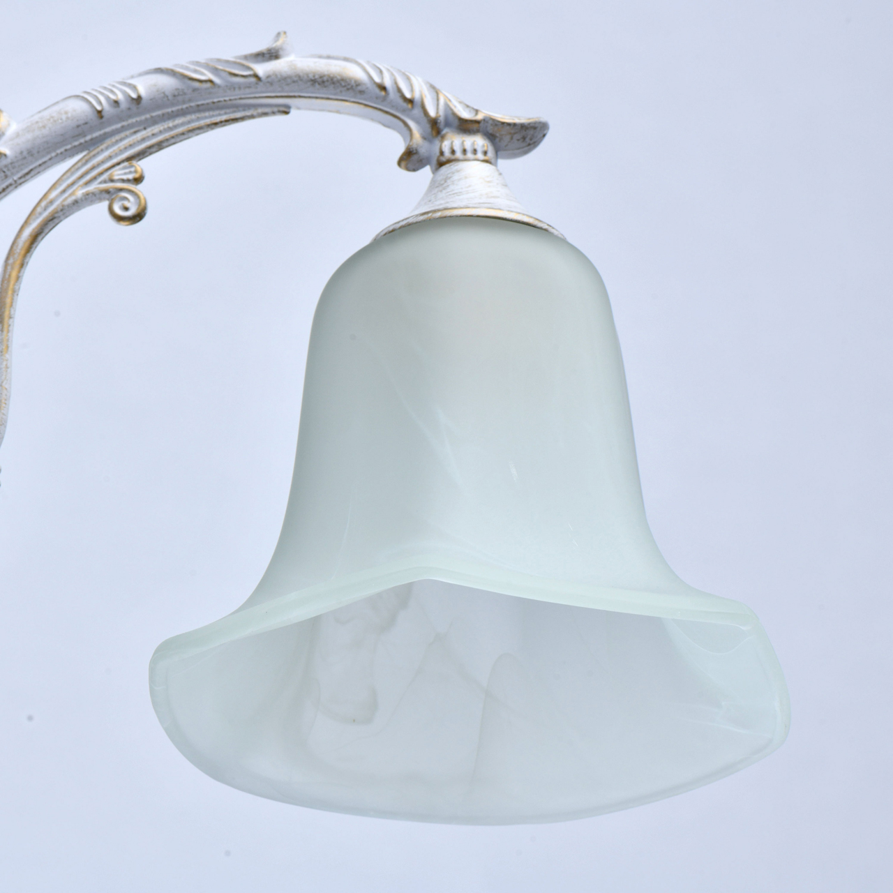 Основание светильника выполнено из сплава алюминия по технологии художественное литье и обработано по технологии хай-лайт, где основной слой белого цвета, а декоративный - золотого. Светильник декорирован плафонами из алебастрового стекла.Тип помещения