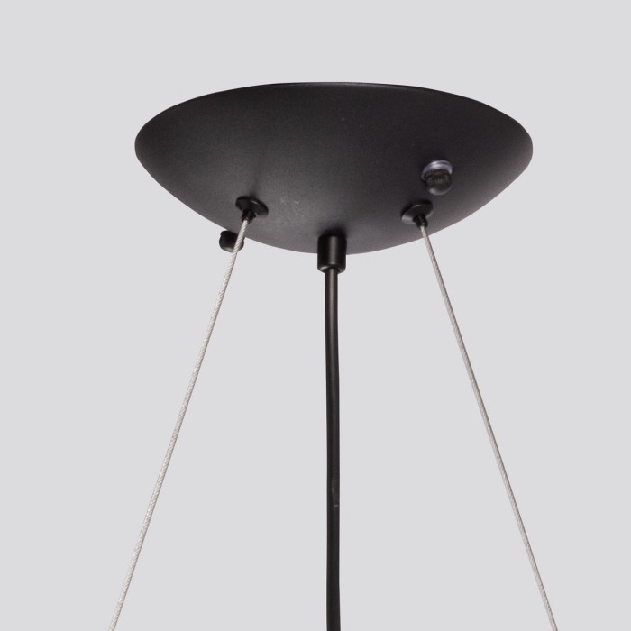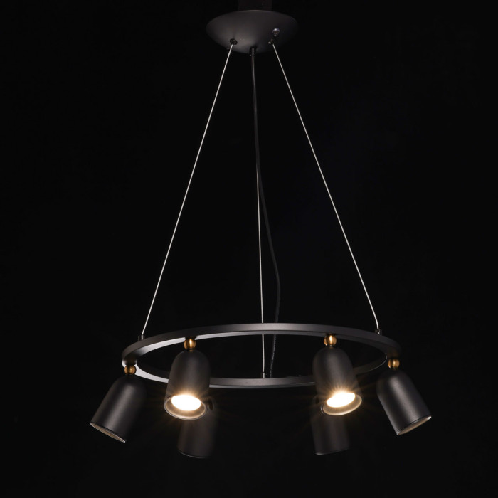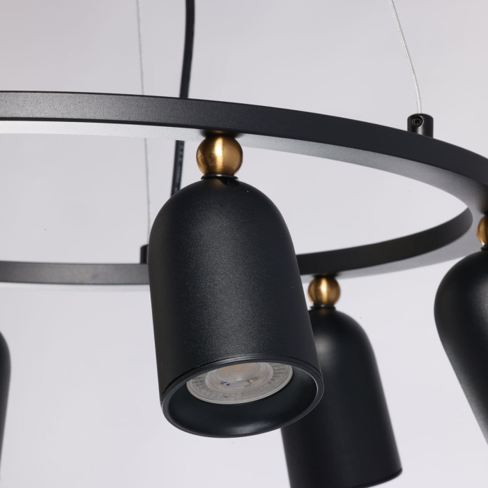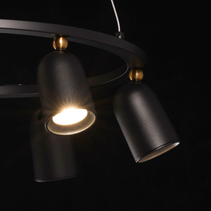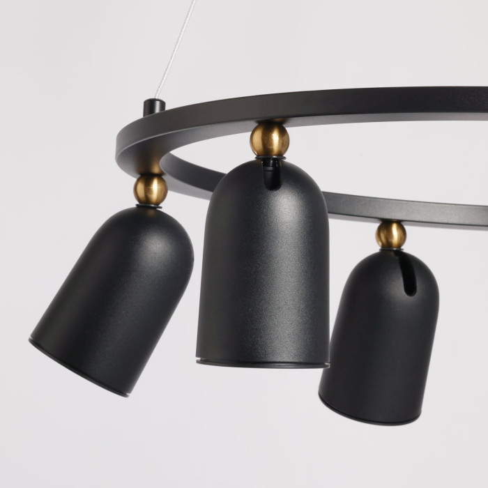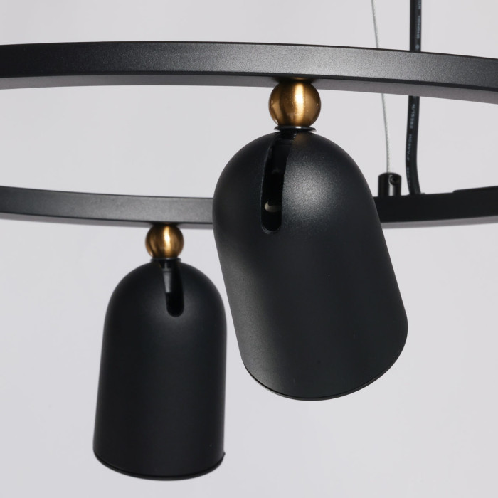 Черный цвет придает люстре брутальности и строгости. Для дополнительного декоративного эффекта, плафоны декорированы металлической сферой. Контрастное сочетание черного цвета и декора цвета латуни добавляет люстре изысканности. Поворотные плафоны позволяют направлять световой поток в нужную сторону, что создает комфортное освещение. Вариативность световых решений и фактур подчеркнет стиль и индивидуальность интерьера. Возможность регулировать высоту. Заменяемые источники света удобны в эксплуатации.Металлическое основание подвесной люстры окрашено в черный цвет. Корпус плафонов выполнен из сплава алюминия и окрашен в цвет основания. Светильник декорирован металлическими сферами, гальванизированными в цвет латуни.