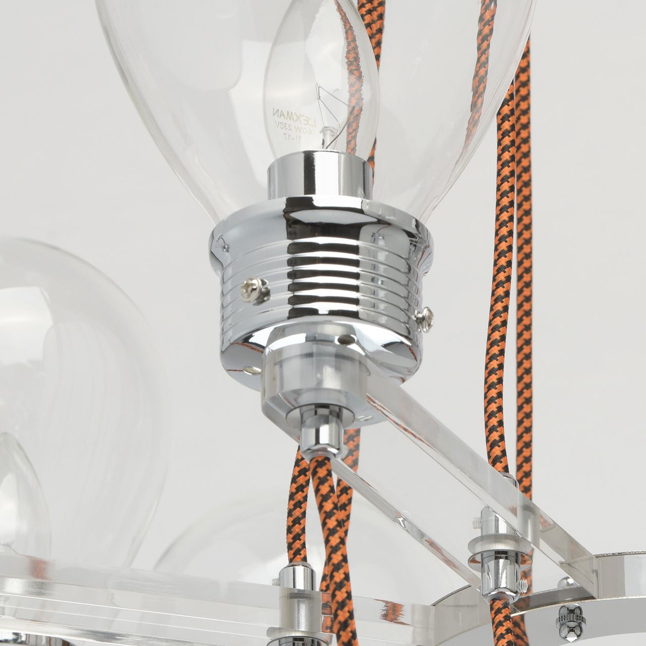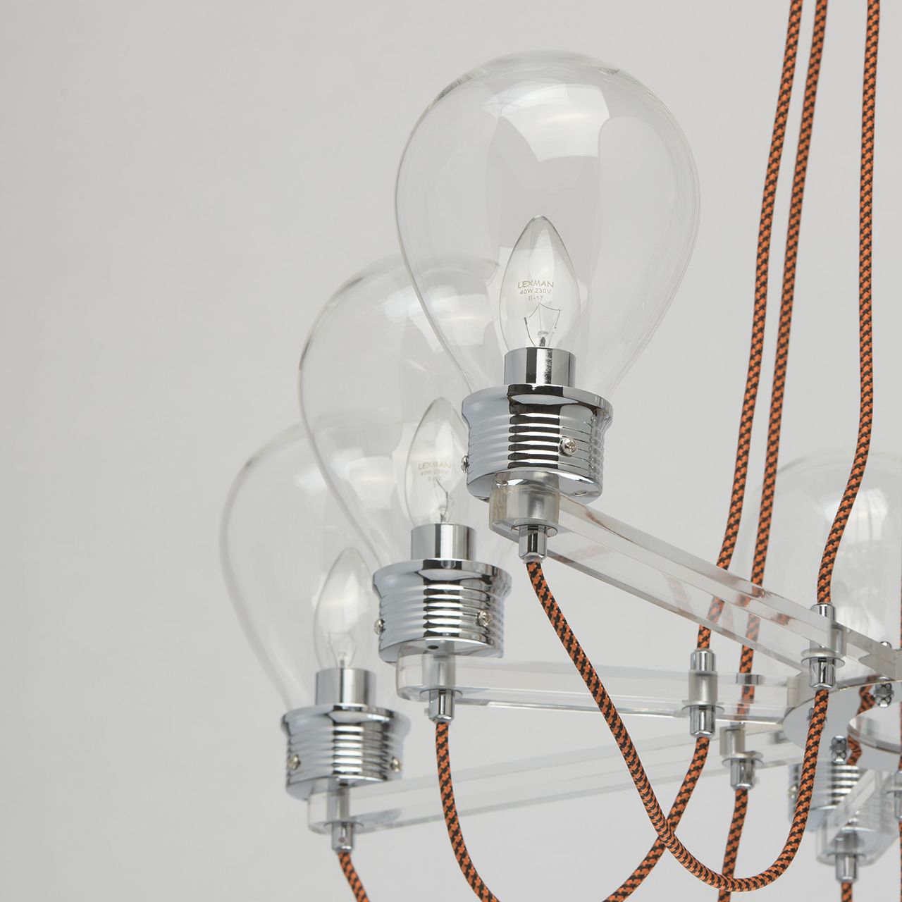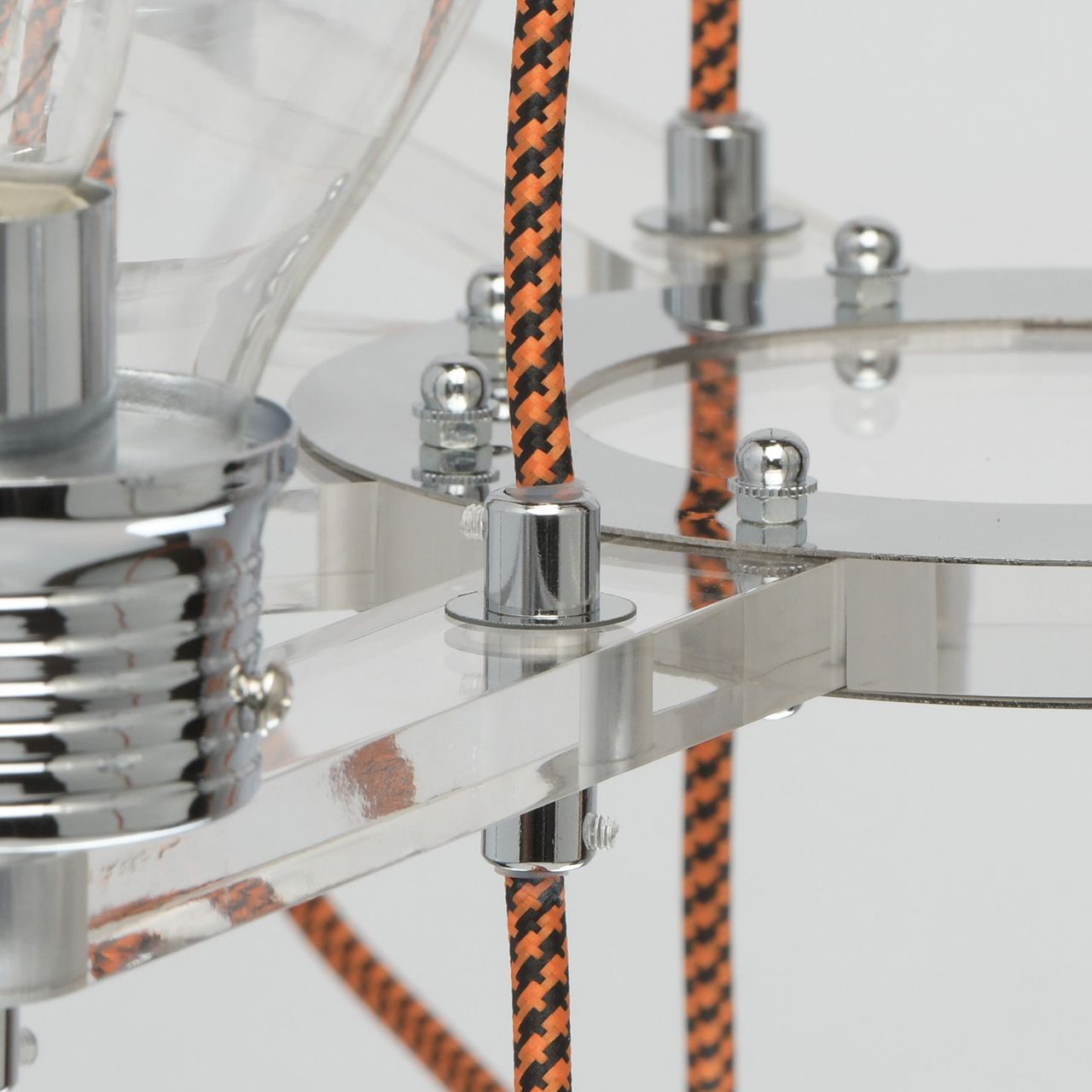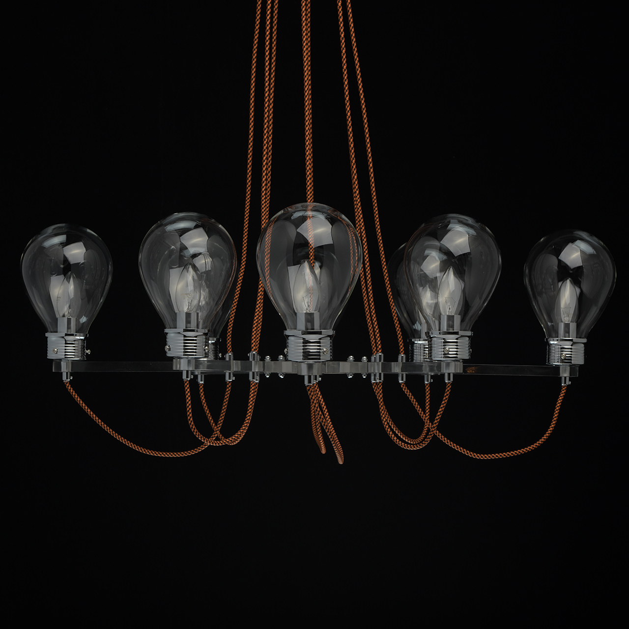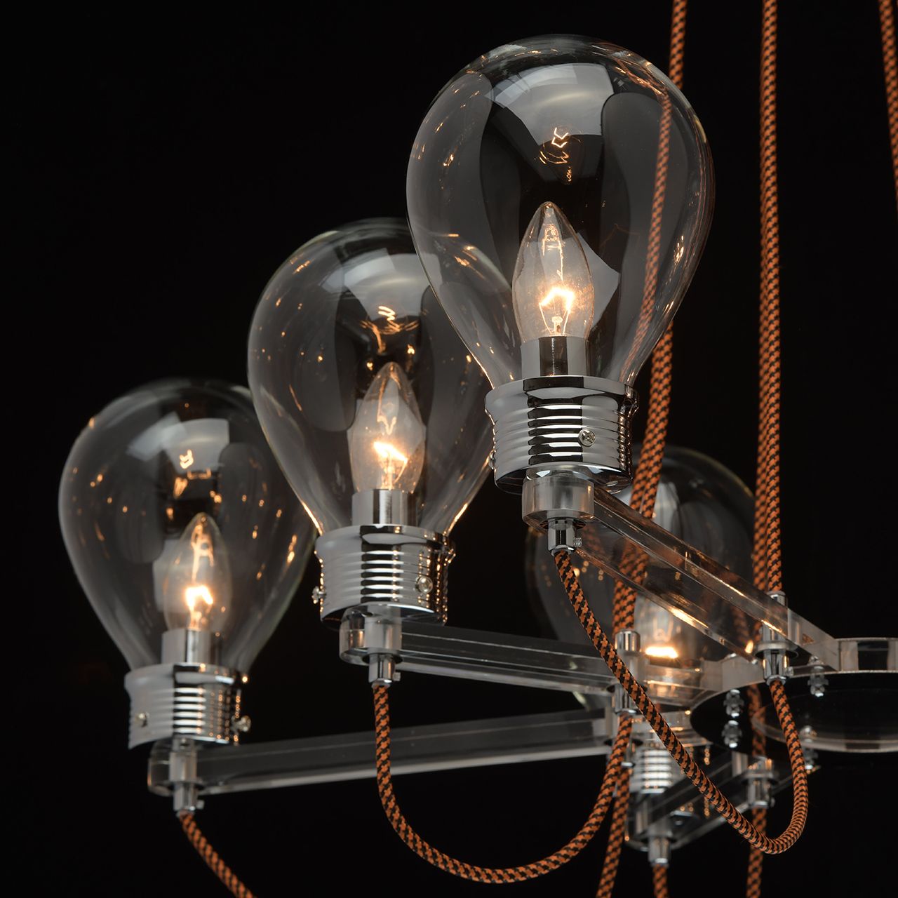 Трендовый дизайн светильника в лучших традициях лофта отлично дополнит индустриальную обстановку. Основание из металла цвета хрома подчеркнуто прозрачными акриловыми рожками. Однако главная изюминка композиции – это оригинальные плафоны, выполненные в форме прозрачных стеклянных лампочек. Композиция выглядит очень эффектно и необычно. Дополнительный декор в виде декоративного шнура в текстильной оплетке красного цвета добавляет светильнику оригинальности.Преимущества модели