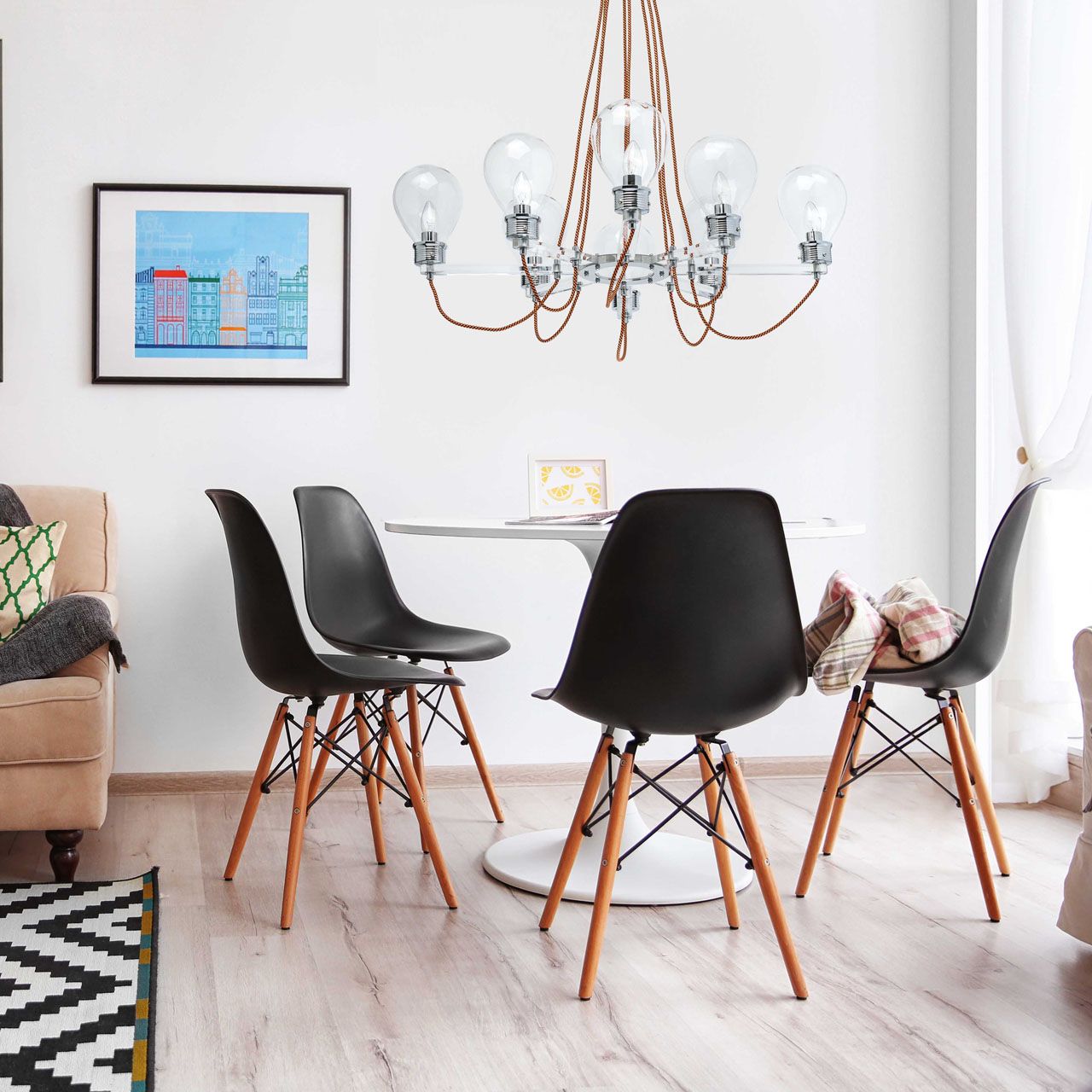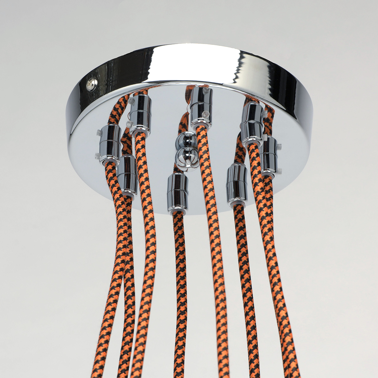 Оригинальный промышленный дизайн актуален в современных минималистичных интерьерах и вдохнет свежий взгляд в такие традиционные стили, как лофт, хай-тек. Декор светильника заключен в конструкции плафонов в виде крупных ламп накаливания с имитацией подведенных проводов. Оригинальная цветная текстильная оплетка декоративных проводов скрывает стержень светильника. Источники света в прозрачных плафонах направлены вверх, что обеспечивает яркий отраженный свет большой площади освещения. Широкая семья дает возможность комплексно осветить помещения разных размеров в едином стиле.Стилевые решения интерьера