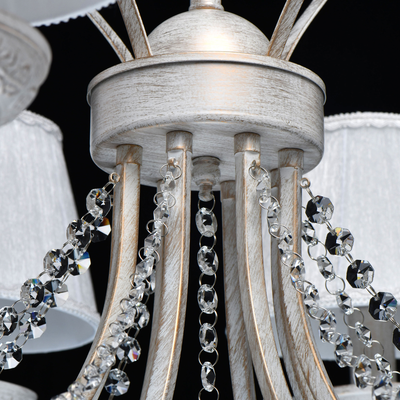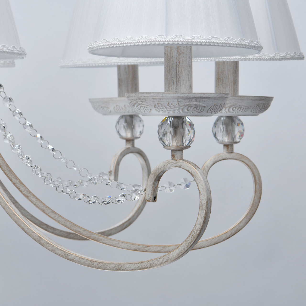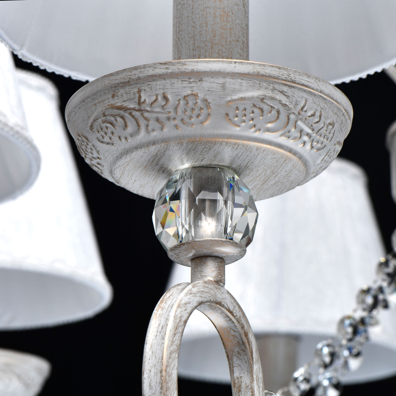 Основание светильника выполнено из металла и окрашено по технологии хай-лайт, где основной слой белого цвета, а декоративный слой цвета золота. На декоративных розетках чеканка флористического орнамента. Абажуры с термостойким акрилом внутри и белым текстилем снаружи отделаны кантом и прошиты. Декор из прозрачного хрусталя.Тип помещения