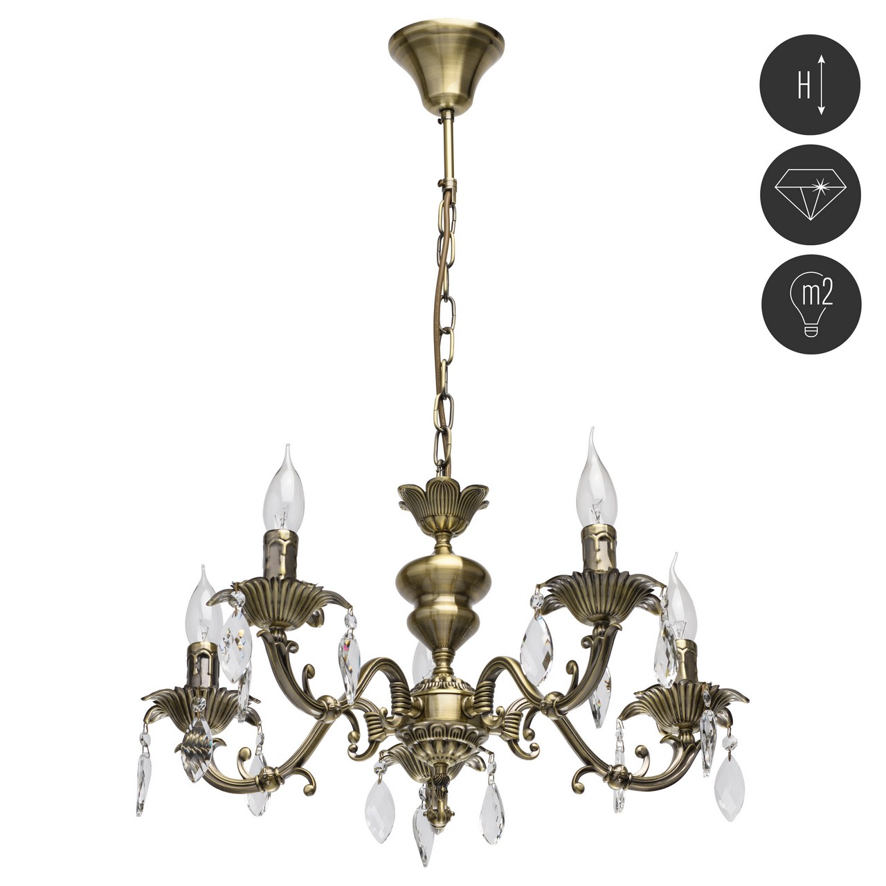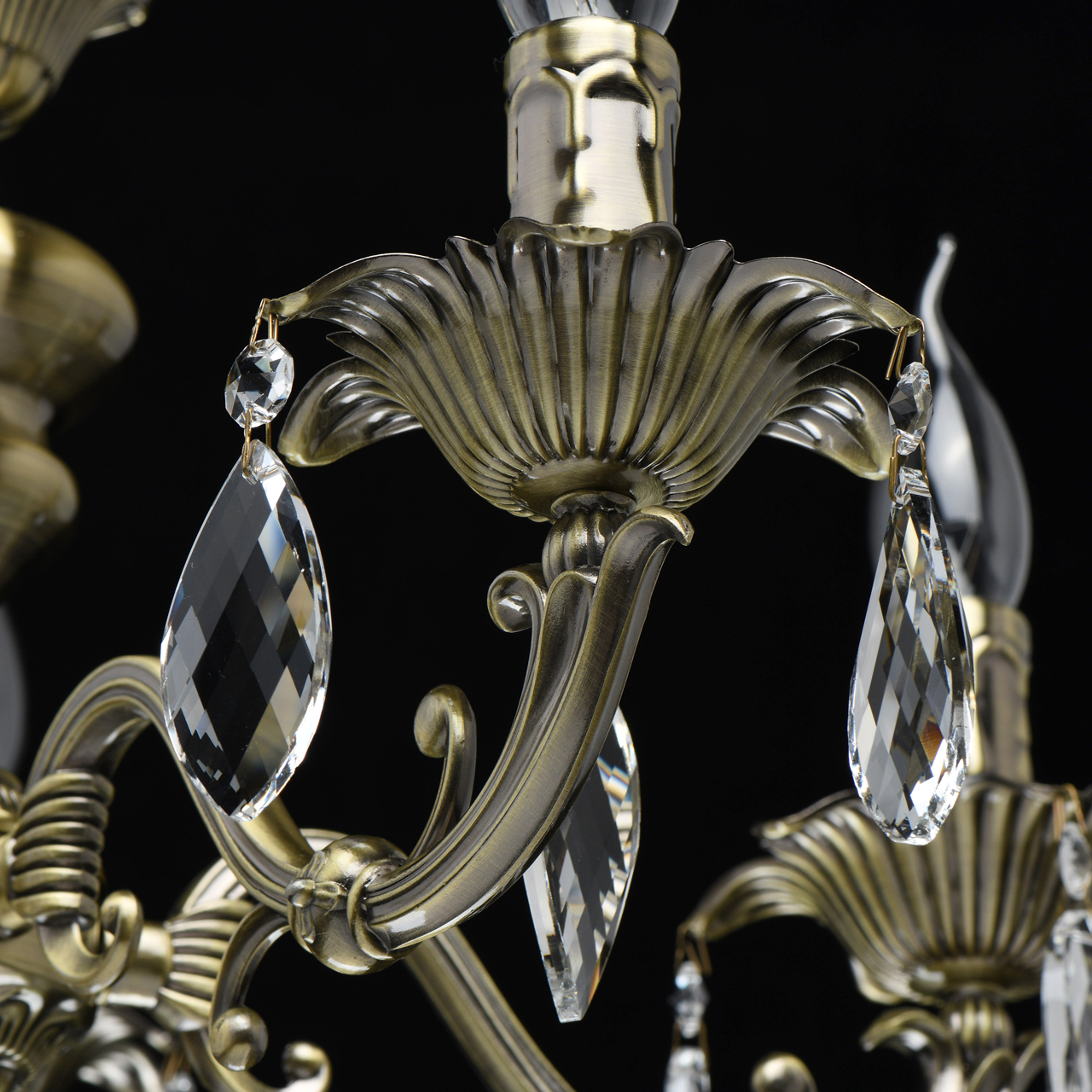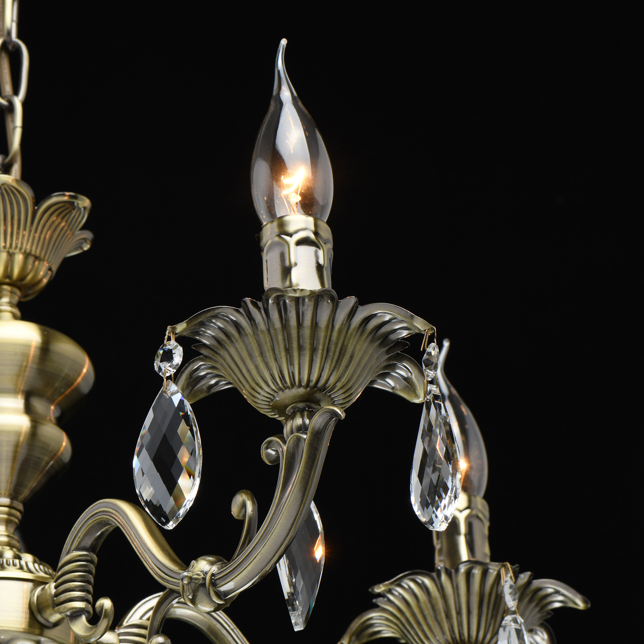 Классическая форма свечи цвета античной бронзы со старинной патиной для интерьеров в традиционном стиле. Хрустальные подвески на резной розетке придают легкости конструкции. Декор художественного литья на рожках и основании модели. Возможность регулировать высоту светильника за счет звеньев цепи.Стилевые решения интерьера