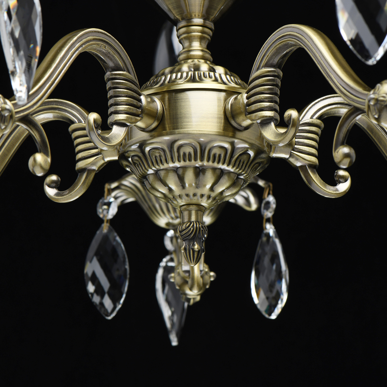 Основание светильника выполнено из комбинации сплавов металлов и гальванизировано в цвет античной бронзы. Рожки выполнены из сплава алюминия по технологии художественного литья. Светильник декорирован прозрачным хрусталем.Тип помещения