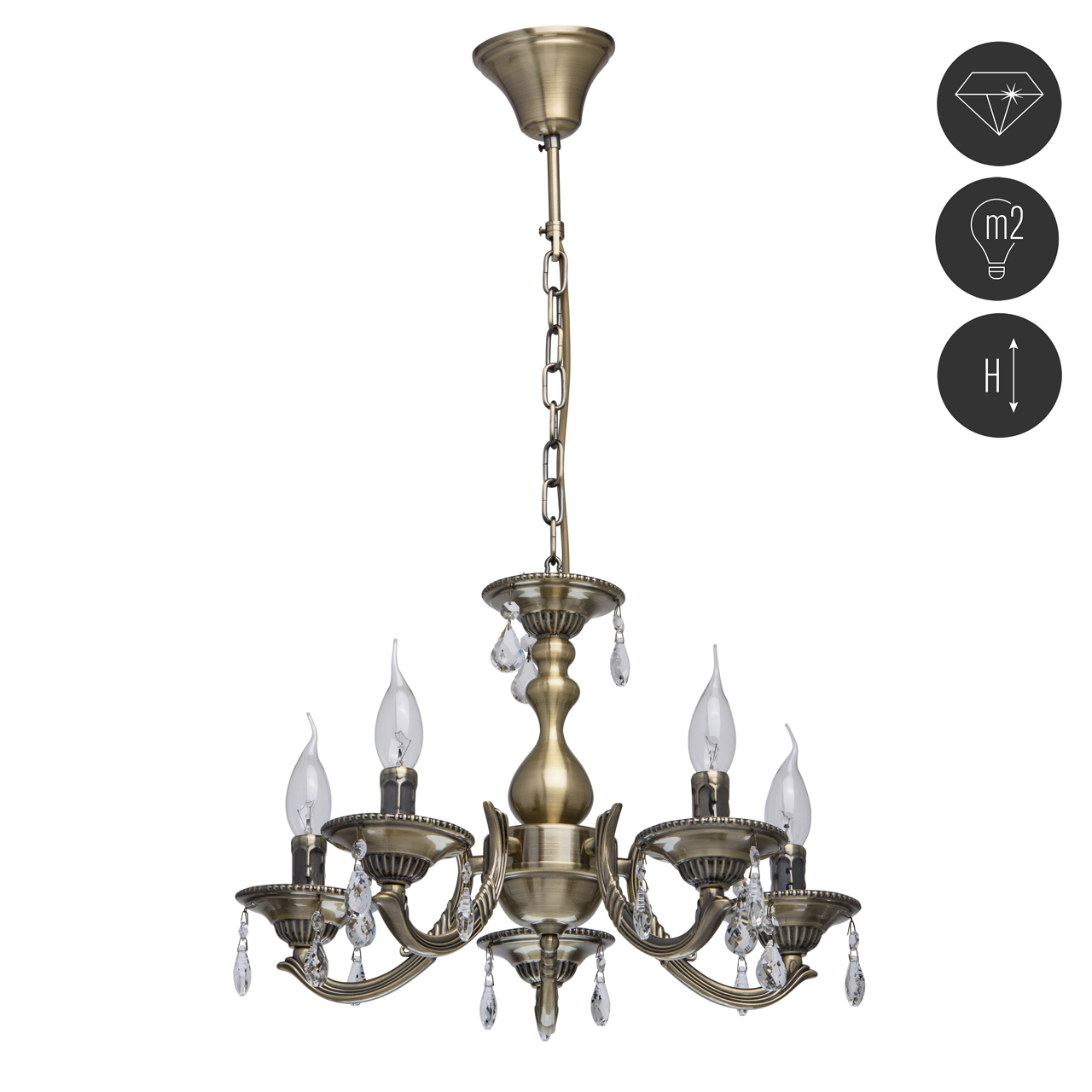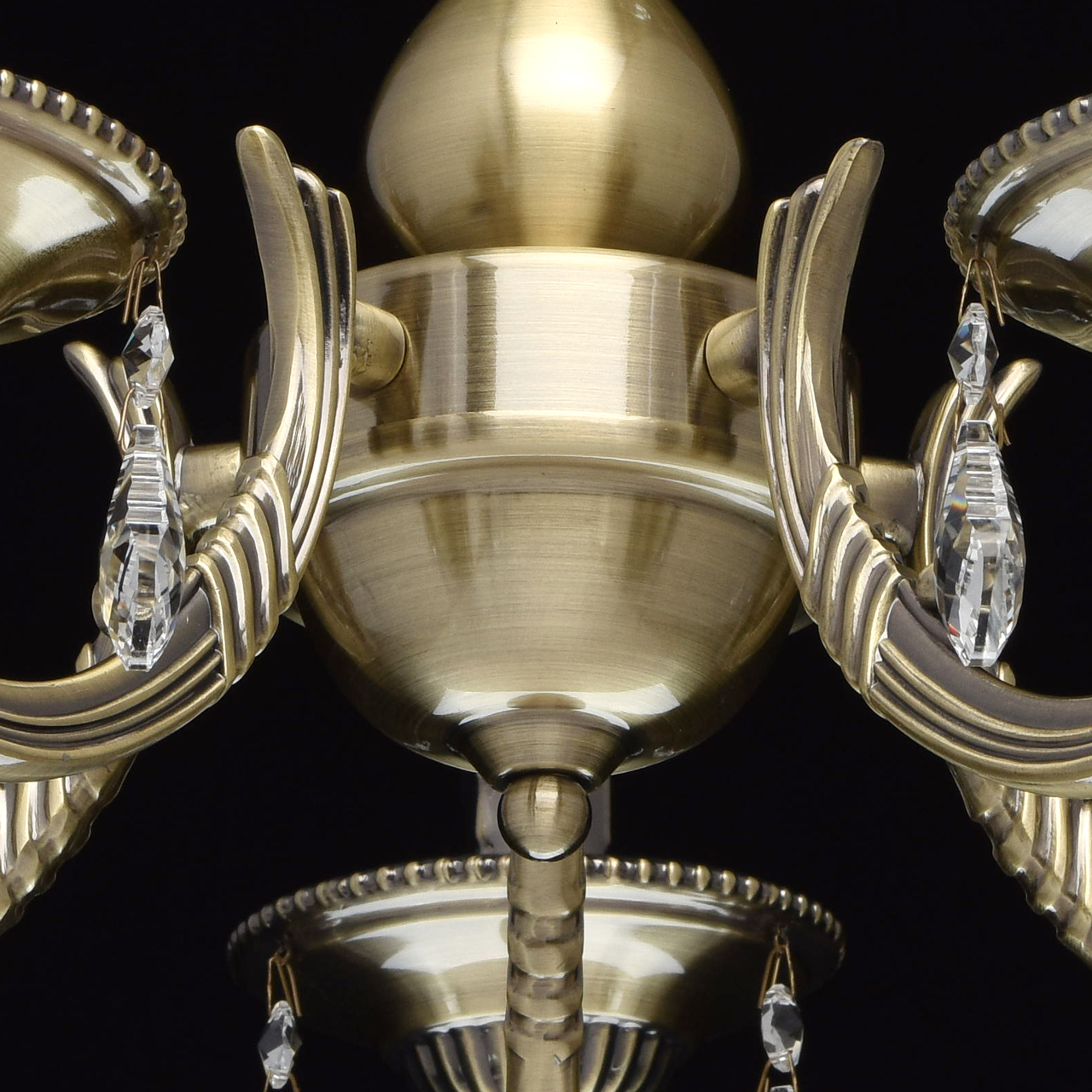 Основание: комбинация сплавов металлов, гальванизирована в цвет античной бронзы с патинированием и лакированием. Потолочная чаша, корпус, центральный стержень: металл, обработка на токарном станке. Декоративные розетки: металл, прессование. Рожки: сплав алюминия, художественное литье. Декор: хрустальные подвески миндалевидной формы и формы октагонТип помещения