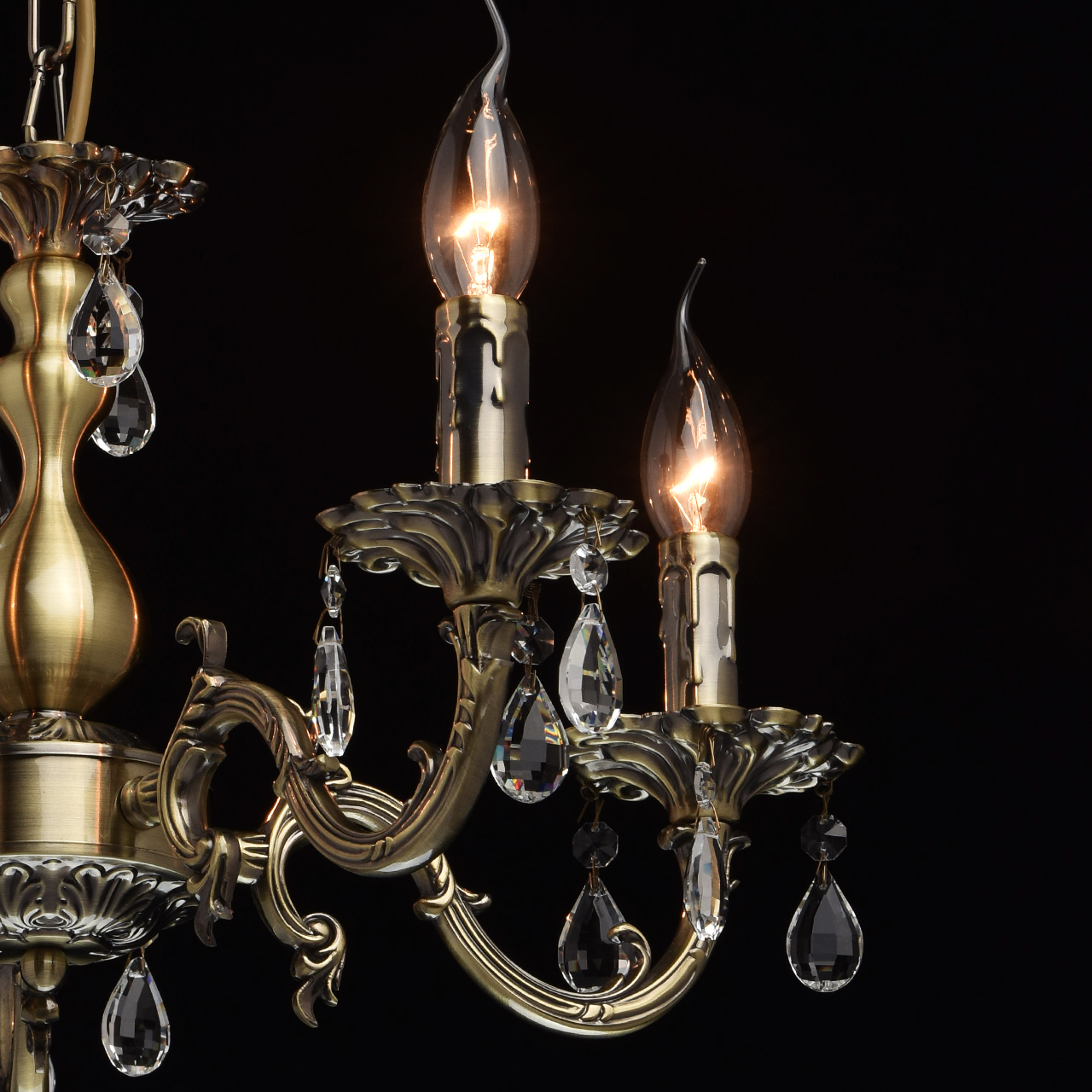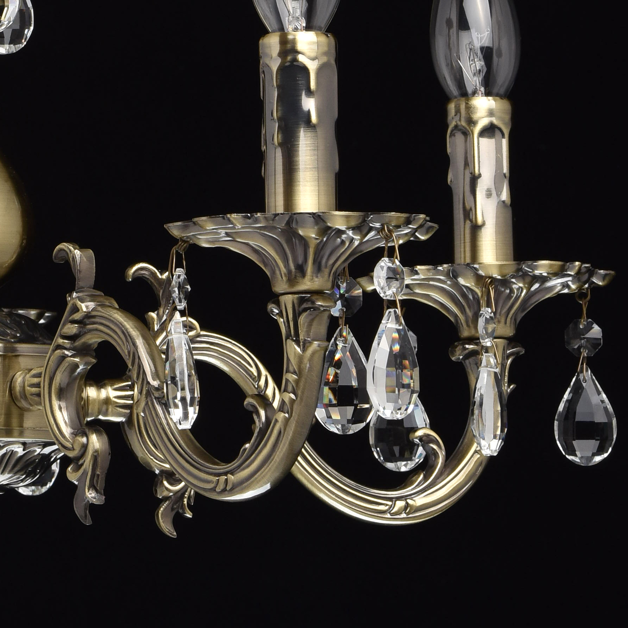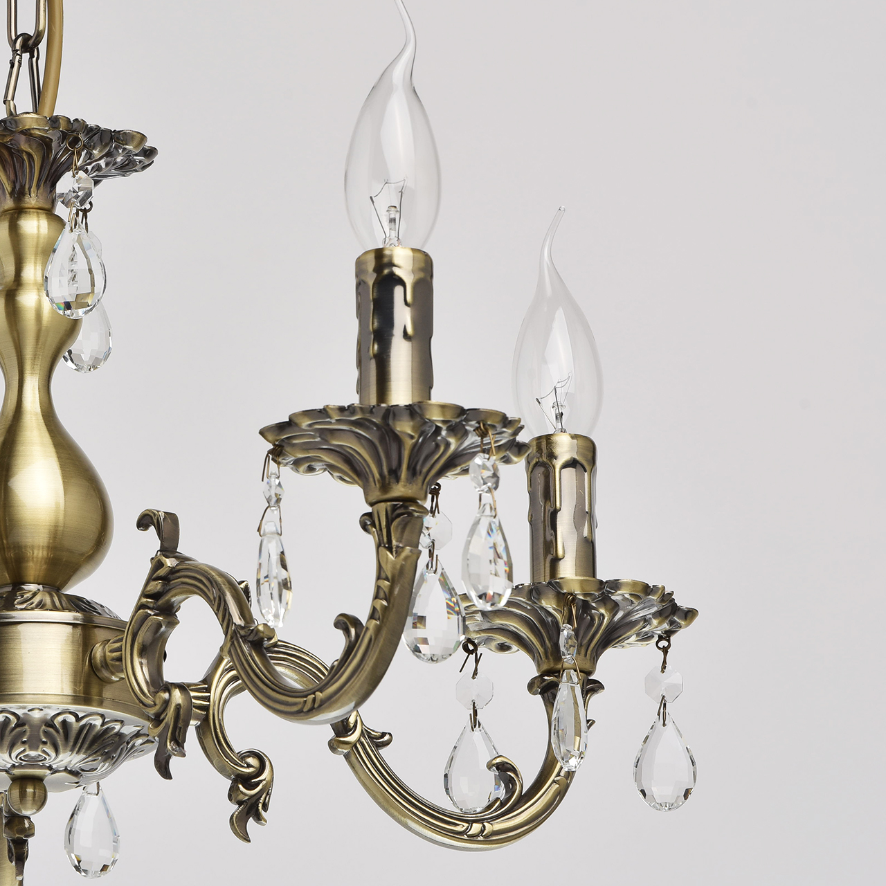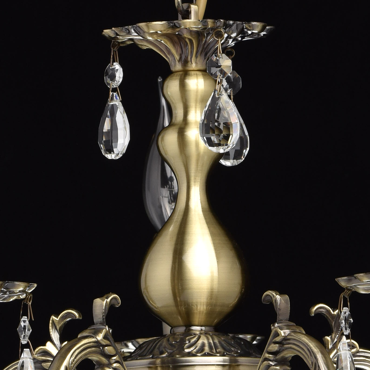 Люстра из коллекции «Аврора» сочетает в себе классическую красоту и продуманные до мелочей детали. Потолочная чаша цвета античной бронзы плавно переходит в изящно изогнутые резные рожки. Композицию дополняют свечи – источники света. Декор из прозрачных хрустальных подвесов создает нежные переливы и придает светильнику парадный вид.Преимущества модели