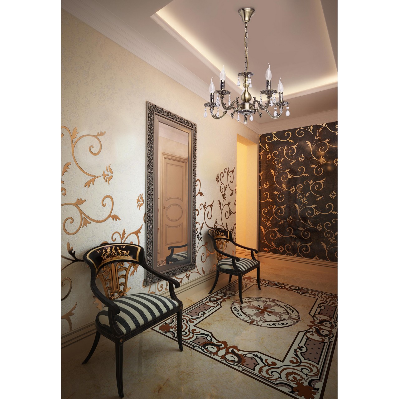 Основание: комбинация сплавов металлов, гальванизирована в цвет античной бронзы. Потолочная чаша, центральный стержень: металл, обработка на токарном станке. Корпус, декоративные розетки: металл, прессование. Рожки: сплав алюминия, художественное литьё. Декор: хрустальные подвески миндалевидной формы и формы октагонТип помещения