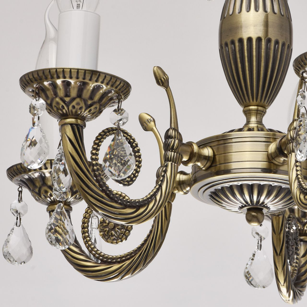 Основание: комбинация сплавов металлов, гальванизирована в цвет античной бронзы. Потолочная чаша: металл, обработка на токарном станке. Центральный стержень, корпус, декоративные розетки: металл, прессование. Рожки: сплав алюминия, художественное литьё. Декор: подвески из прозрачного хрусталя миндалевидной формы и формы октагон.Тип помещения