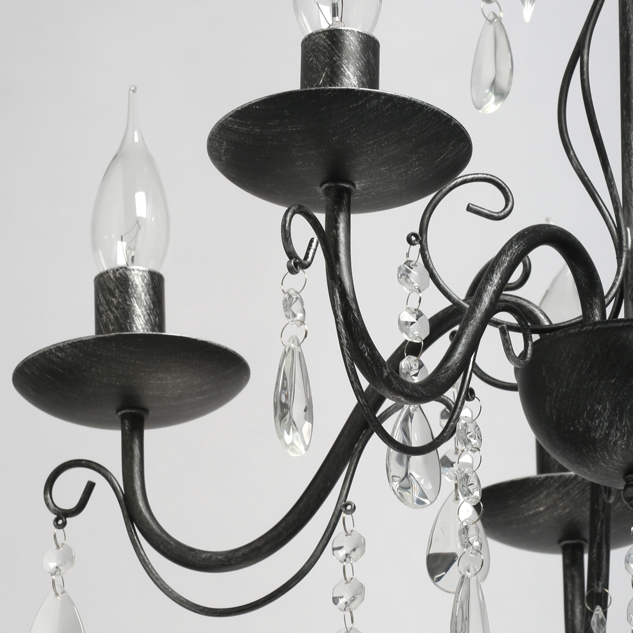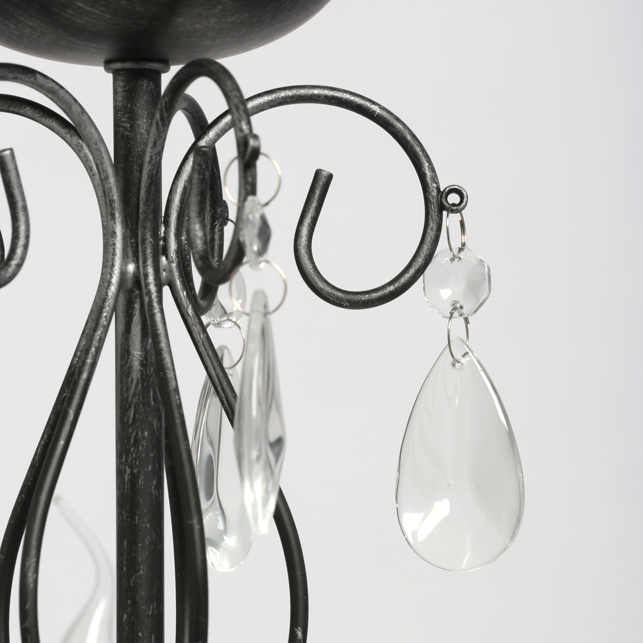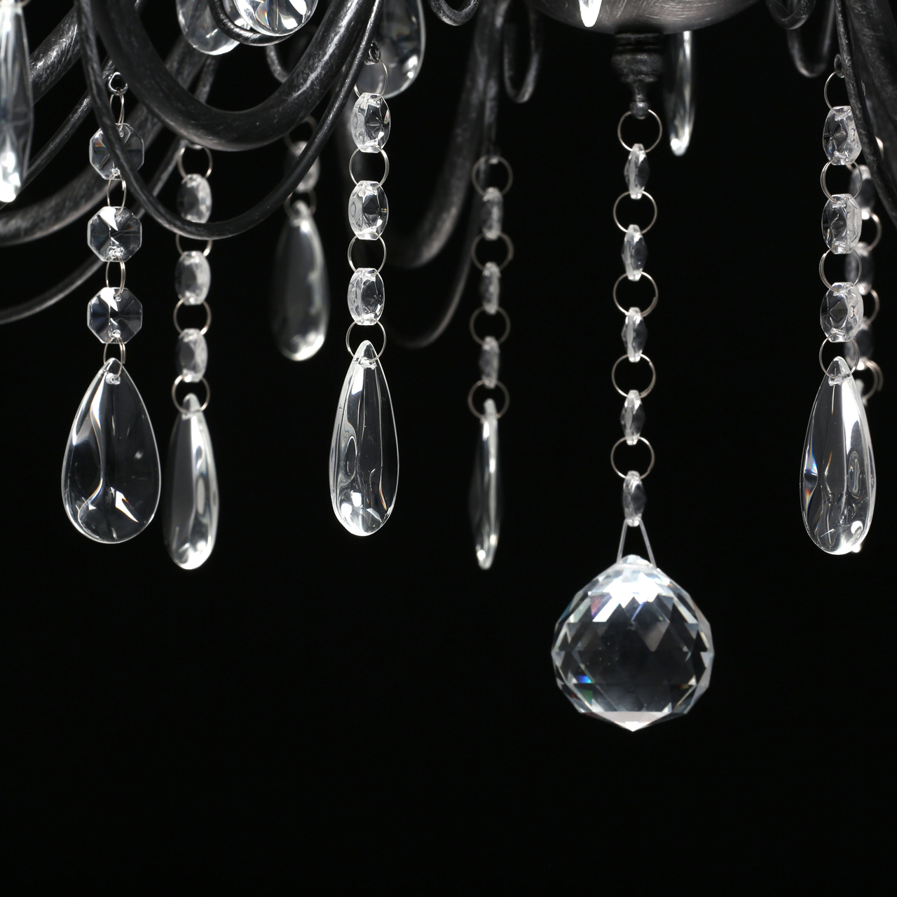 Классическая форма рожков-свечей с основанием черного цвета с серебристой патиной. Декор из хрустального стекла создает игру света. Акцент в виде хрустального шара в центре композиции. Возможность регулировать высоту светильника за счет звеньев цепиСтилевые решения интерьера