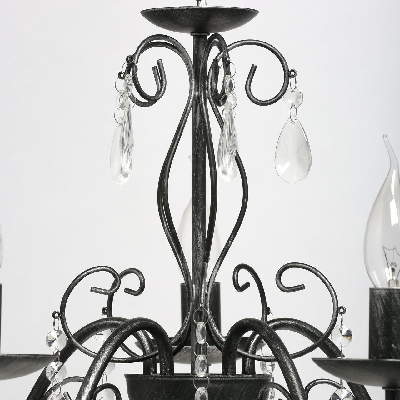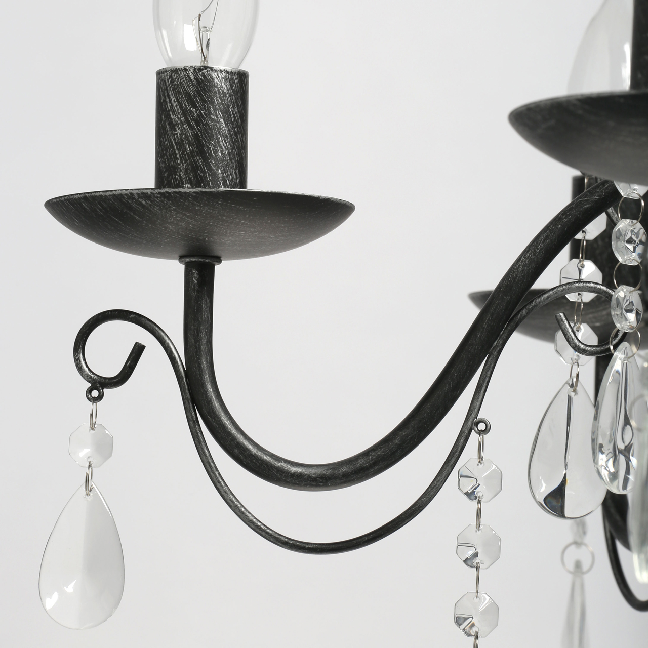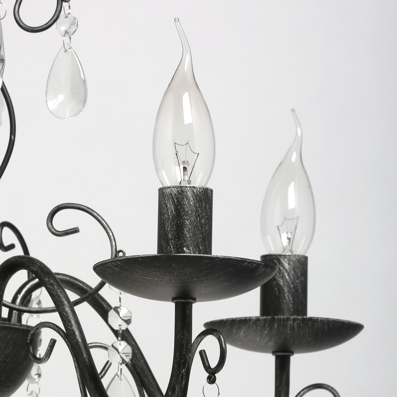 Классическая форма рожков-свечей с основанием черного цвета с серебристой патиной. Декор из хрустального стекла создает игру света. Акцент в виде хрустального шара в центре композиции. Возможность регулировать высоту светильника за счет звеньев цепиСтилевые решения интерьера