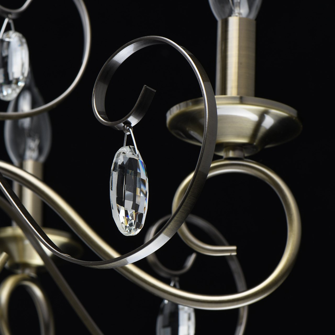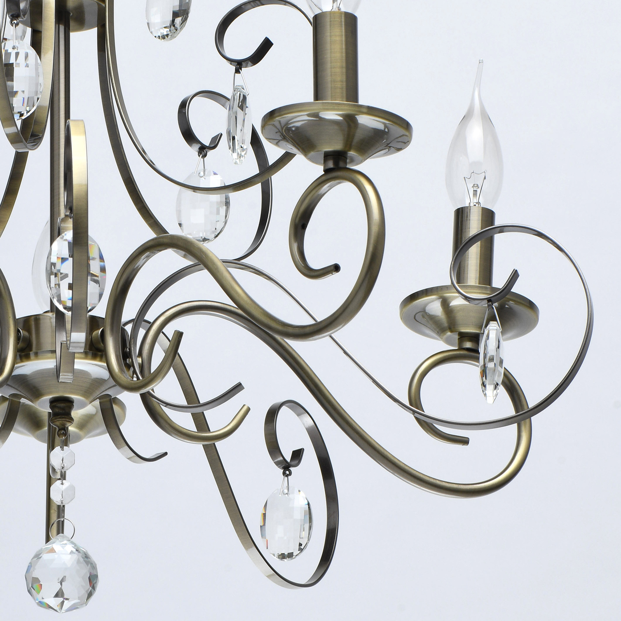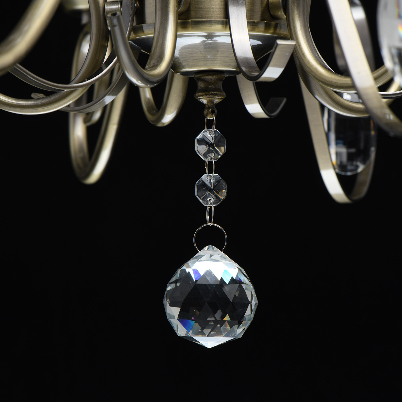 Основание светильника выполнено из металла и гальванизировано в цвет античной бронзы. Светильник декорирован прозрачным хрусталем формы овал, октагон и шар.Тип помещения