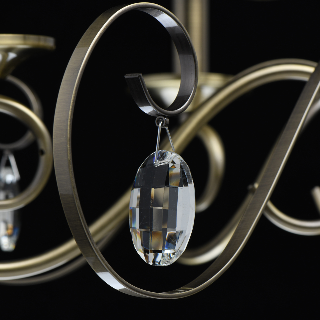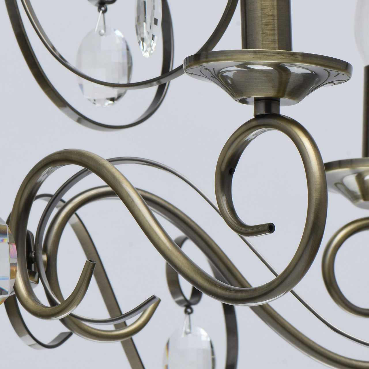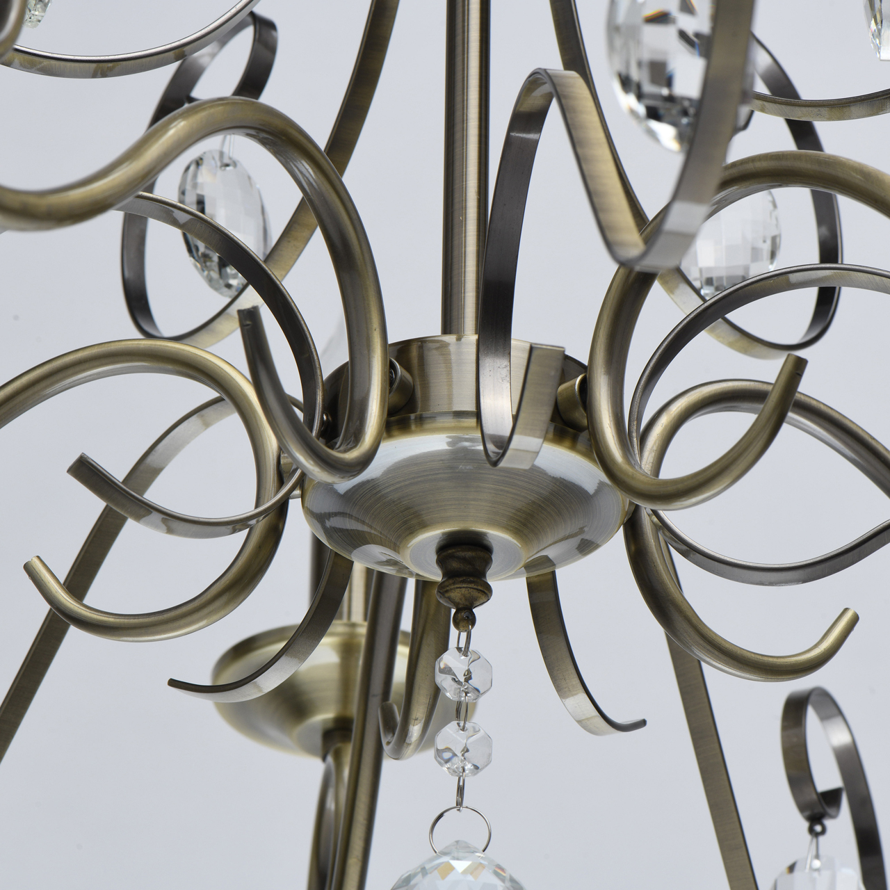 Основание светильника выполнено из металла и гальванизировано в цвет античной бронзы. Светильник декорирован прозрачным хрусталем формы овал, октагон и шар.Тип помещения