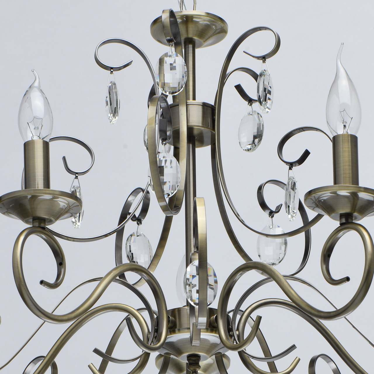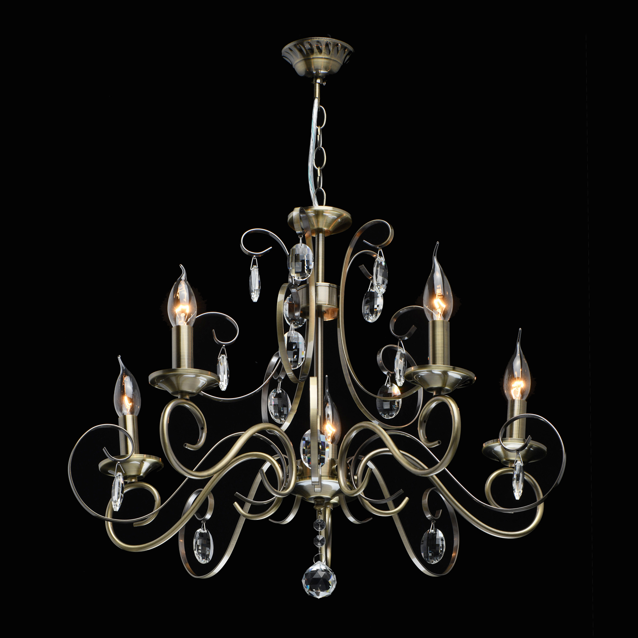 Классическая форма свечи цвета античной бронзы для интерьеров в традиционном стиле. Хрустальные подвески рожков придают легкости модели. Возможность регулировать высоту светильника за счет звеньев цепи.Стилевые решения интерьера