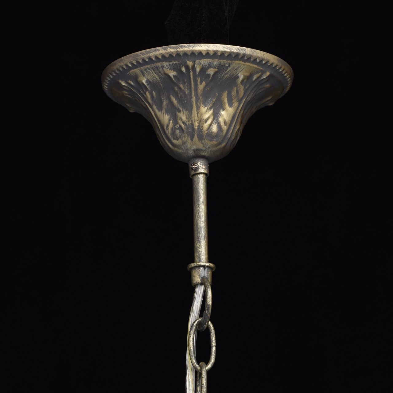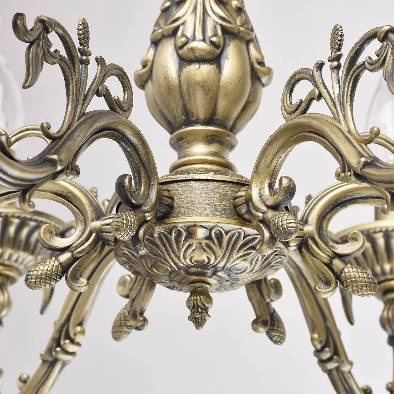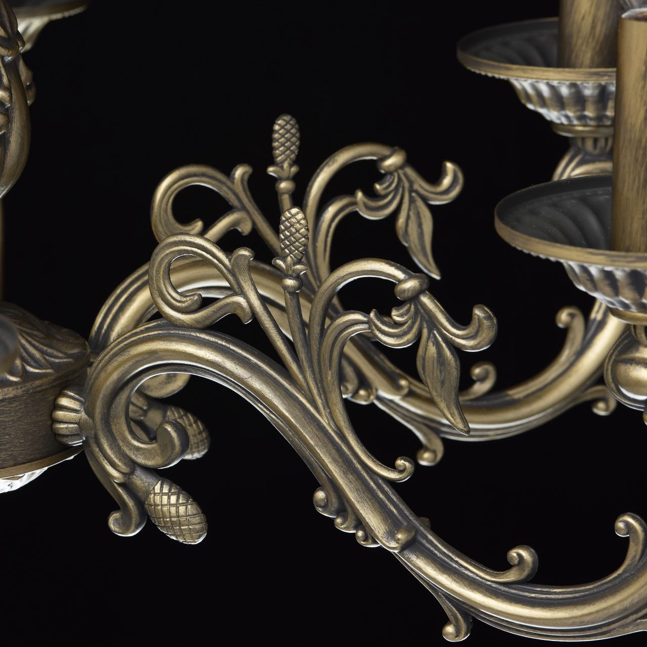 Основание: комбинация сплавов металлов, гальванизирована в цвет античной бронзы с патинированием и лакированием. Потолочная чаша, корпус, декоративные розетки: металл, прессование. Рожки, центральный стержень: сплав алюминия, художественное литье.Тип помещения