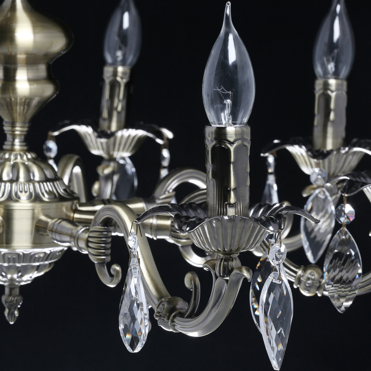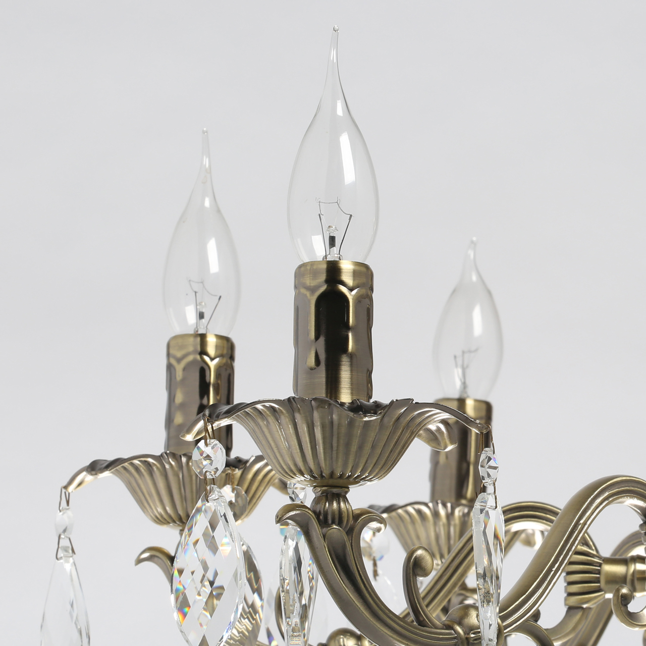 Основание светильника выполнено из комбинации сплавов металлов и гальванизировано в цвет античной бронзы. Рожки выполнены из сплава алюминия по технологии художественного литья. Светильник декорирован прозрачным хрусталем.Тип помещения