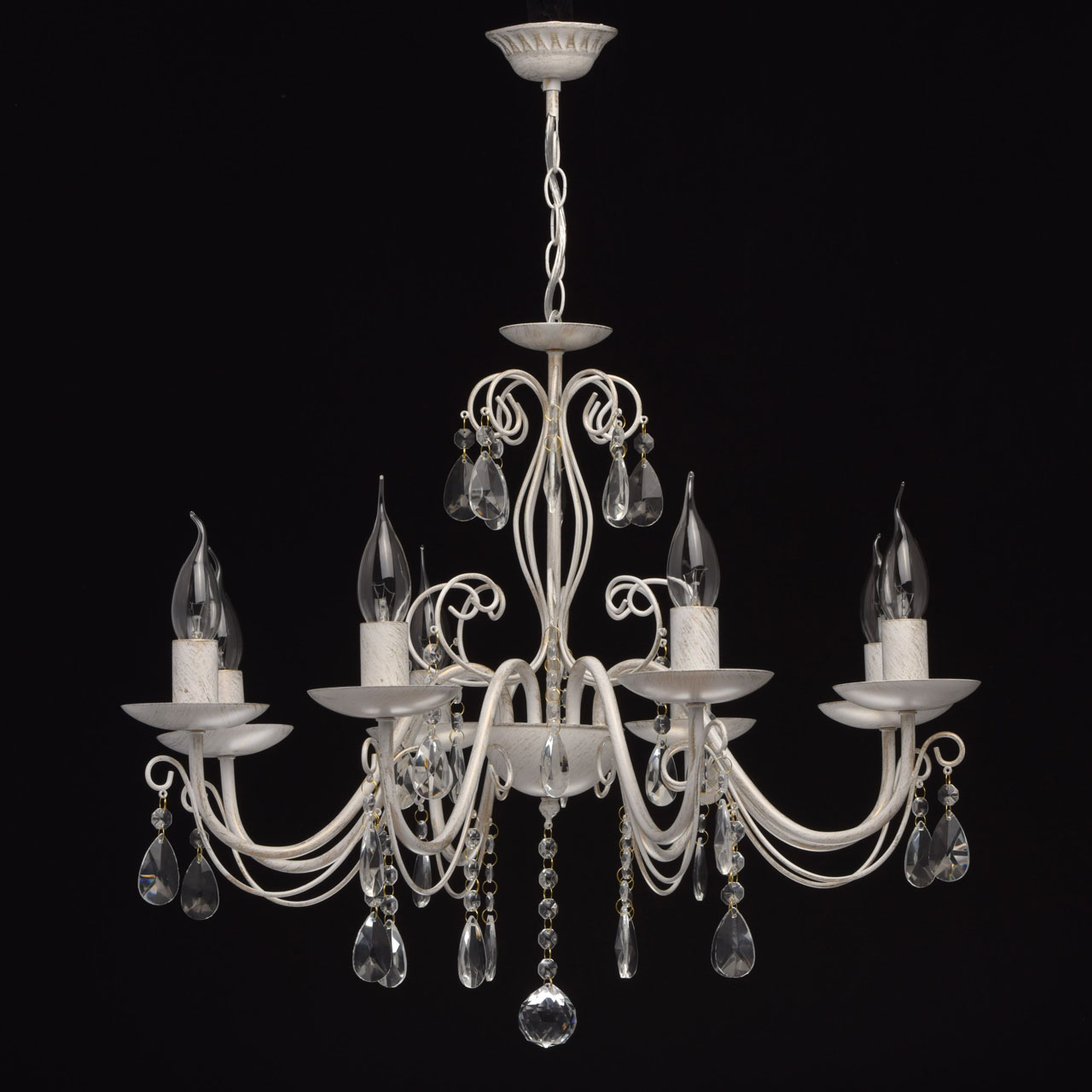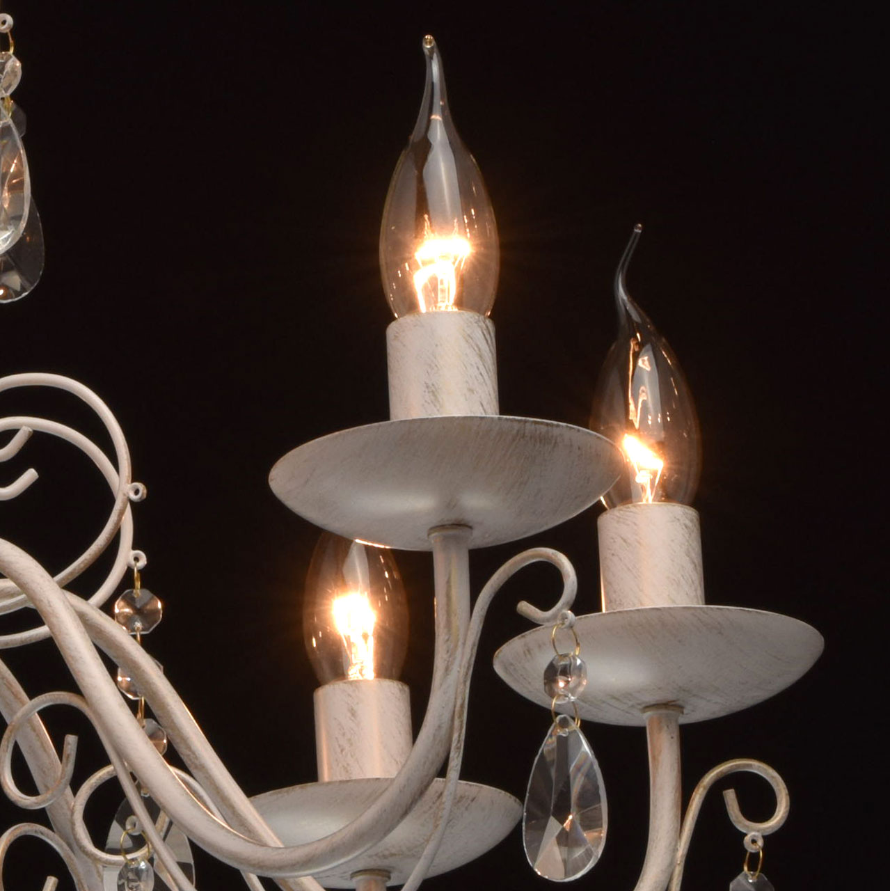 Люстра из коллекции «Аврора» выполнена в благородном классическом стиле. Её металлическое основание матового белого цвета дополнено эффектом золотой патины. Грациозно изогнутые рожки и декоративные завитки гармонично сочетаются с источниками света в виде свеч, а крупные подвесы из прозрачного декоративного стекла завершают царственный дизайн.Преимущества модели