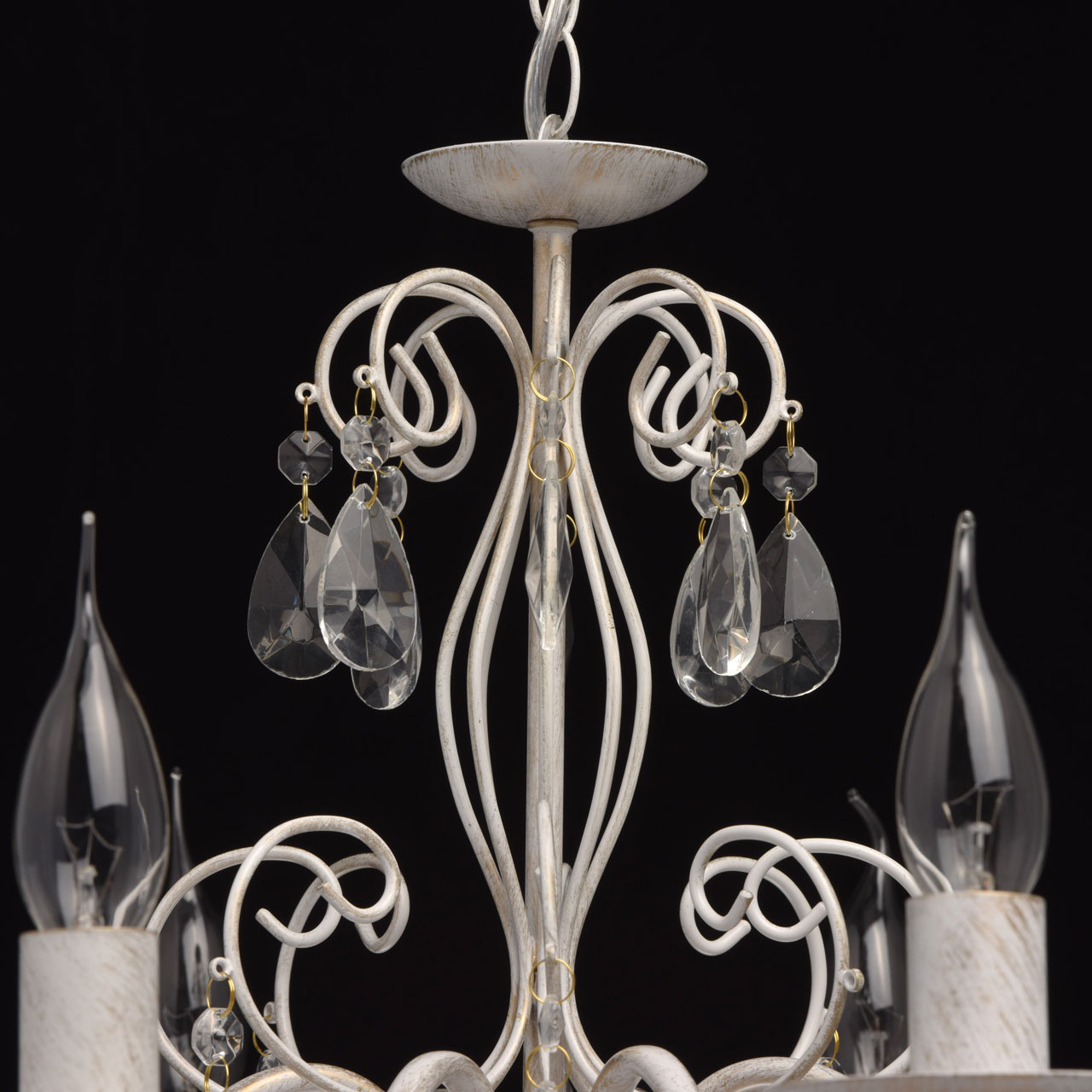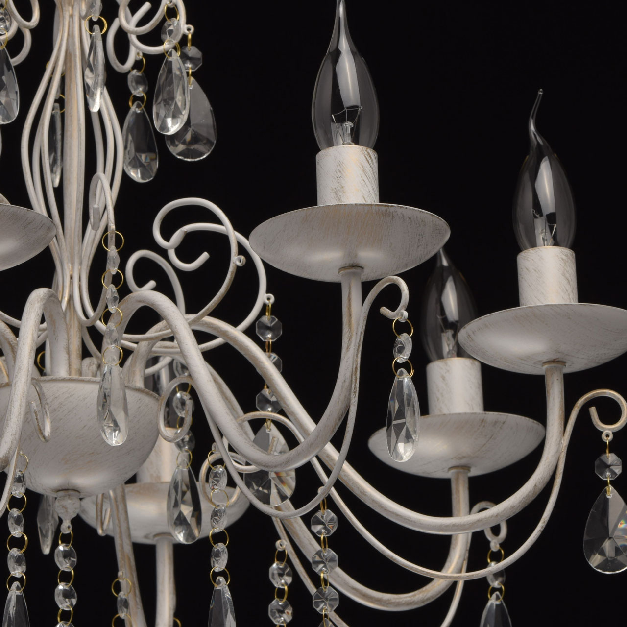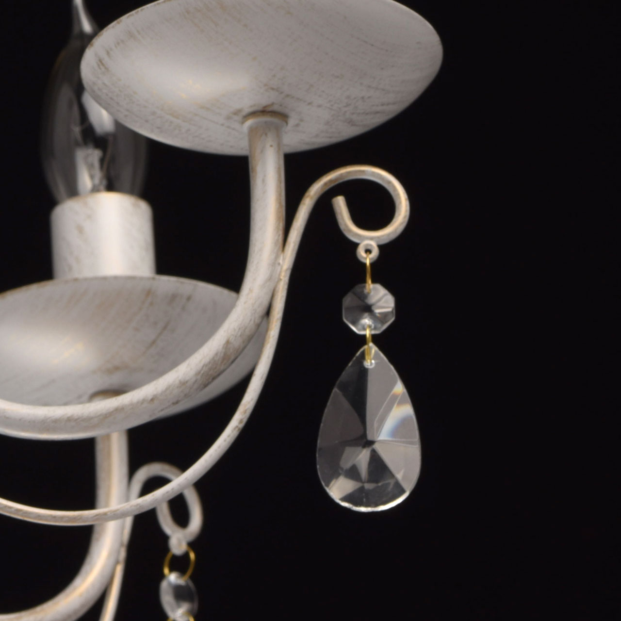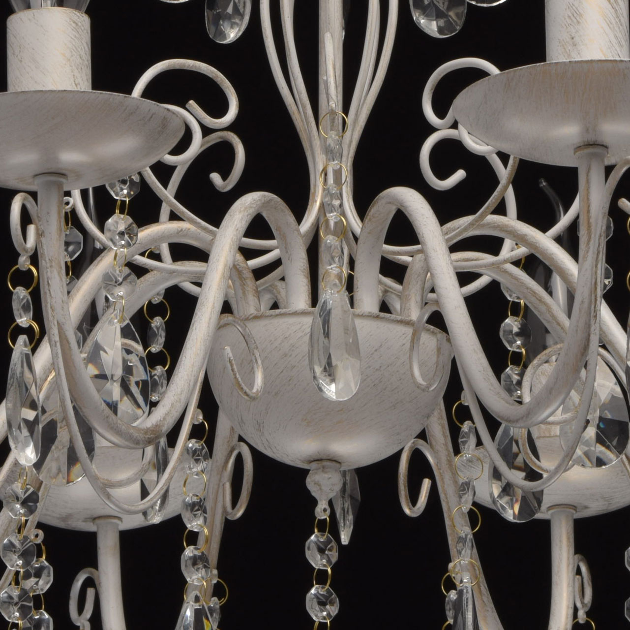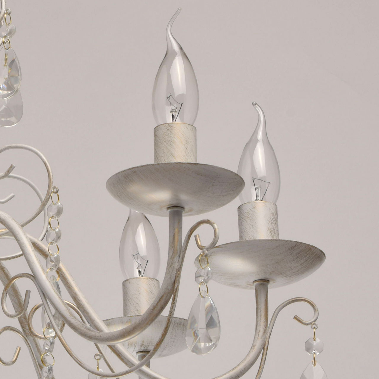 Основание из металла, окрашена по технологии хай-лайт, основной слой белого матового цвета, декоративный слой цвета золота. Декоративные элементы изготовлены из металла по технологии проката на роликовом станке, розетки - технология токарной обработки. Декор: подвески из декоративного прозрачного стеклаТип помещения