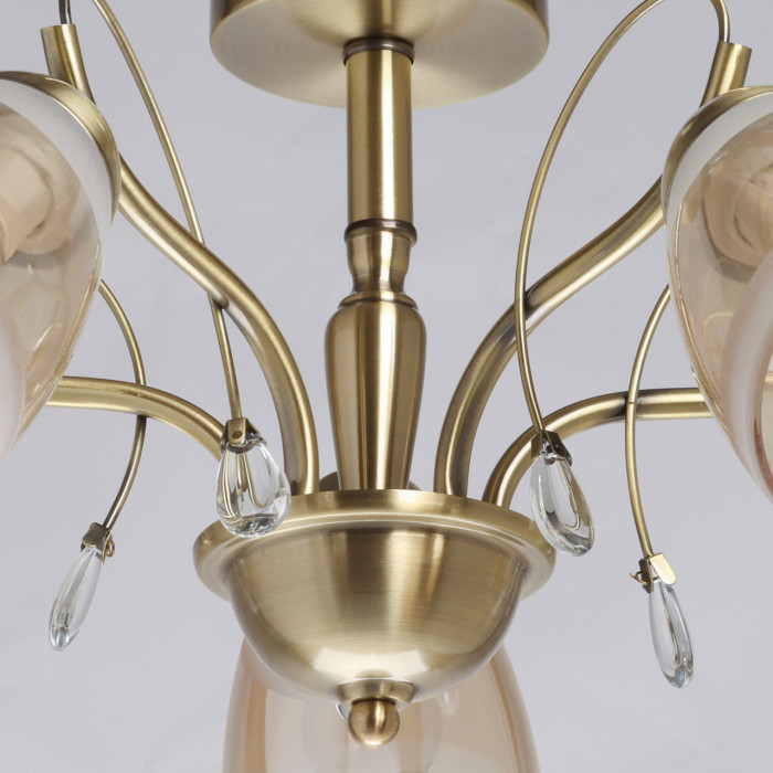 Классический цвет античной бронзы сохраняет свою актуальность. Декор придает потолочной люстре изящества, а хрустальное стекло добавляет декоративности. Матированные по краям и гальванизированные в цвет шампань плафоны создают красивое освещение. Заменяемые источники света удобны в эксплуатации. Компактный размер люстры сохраняет пространство комнаты и подходит для стандартных потолков.Металлическое основание потолочной люстры гальванизировано в цвет античной бронзы. Стеклянные плафоны матированы по трафарету и гальванизированы в цвет шампань. Люстра декорирована подвесками из прозрачного хрустального стекла.