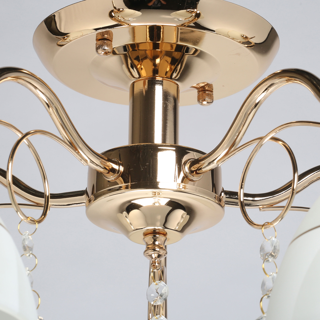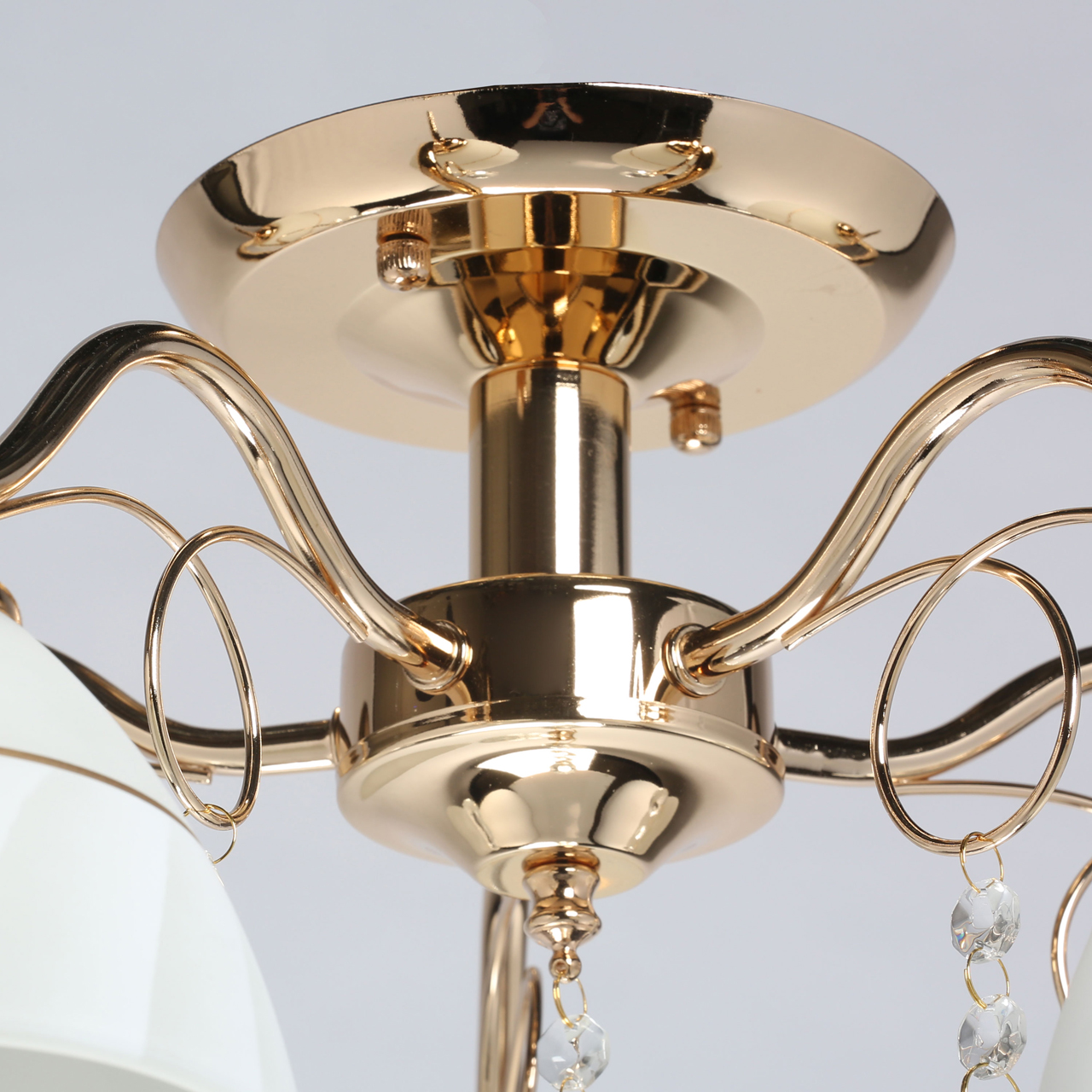 Основание/металл / золото. Плафон / стекло/ белое, золото. Декор/ хрустальное стекло/ прозрачное.Технология производства
